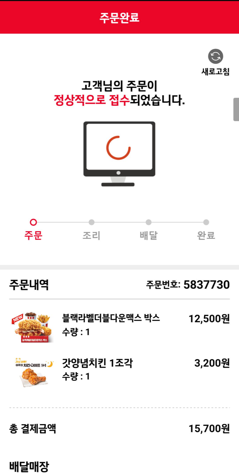 KFC 딜리버리 앱으로 주문하면 이렇게 주문완료 후 배달이 오는데요. 생각보다 꽤 빠르게 도착을 했습니다 !!