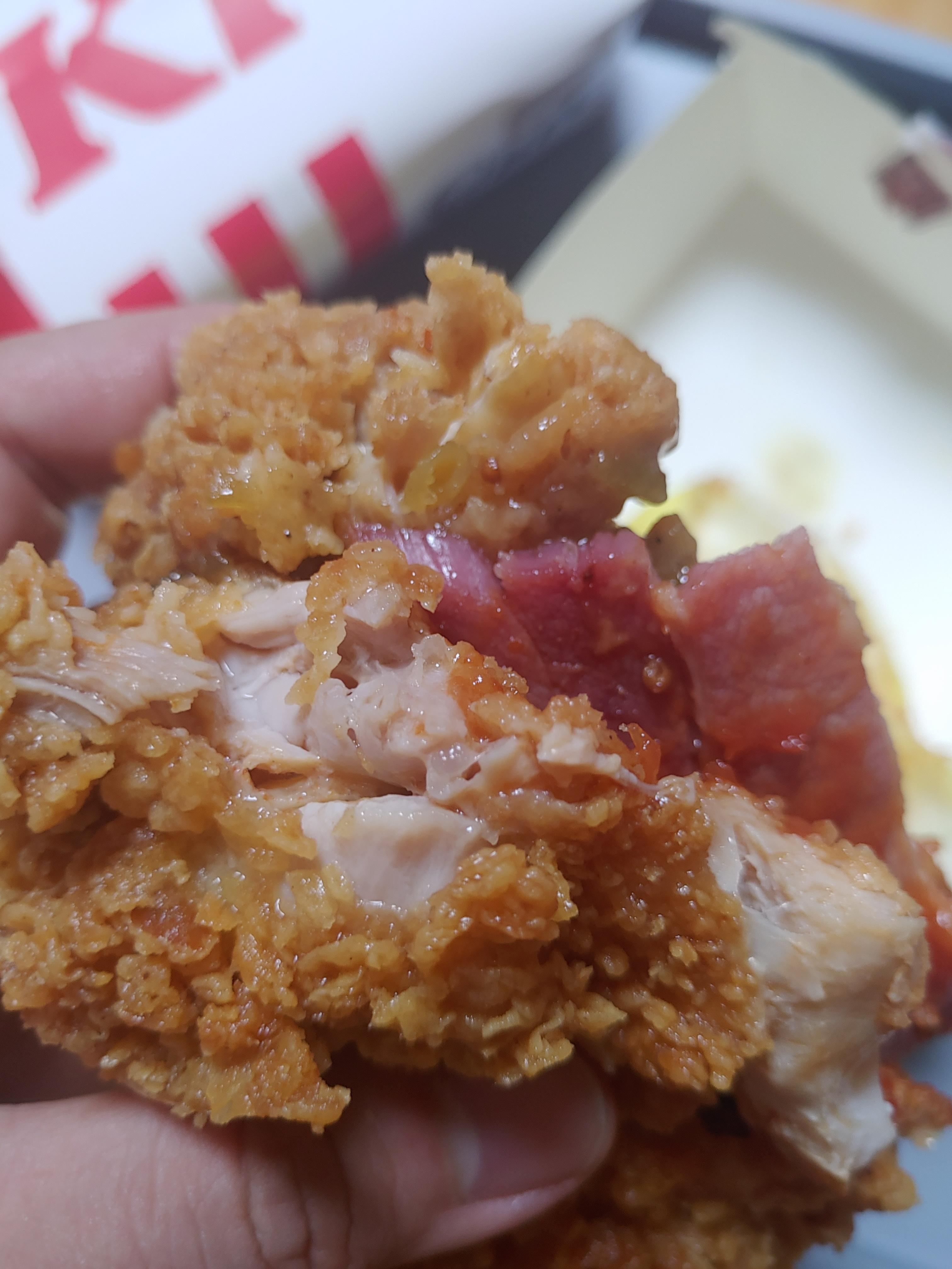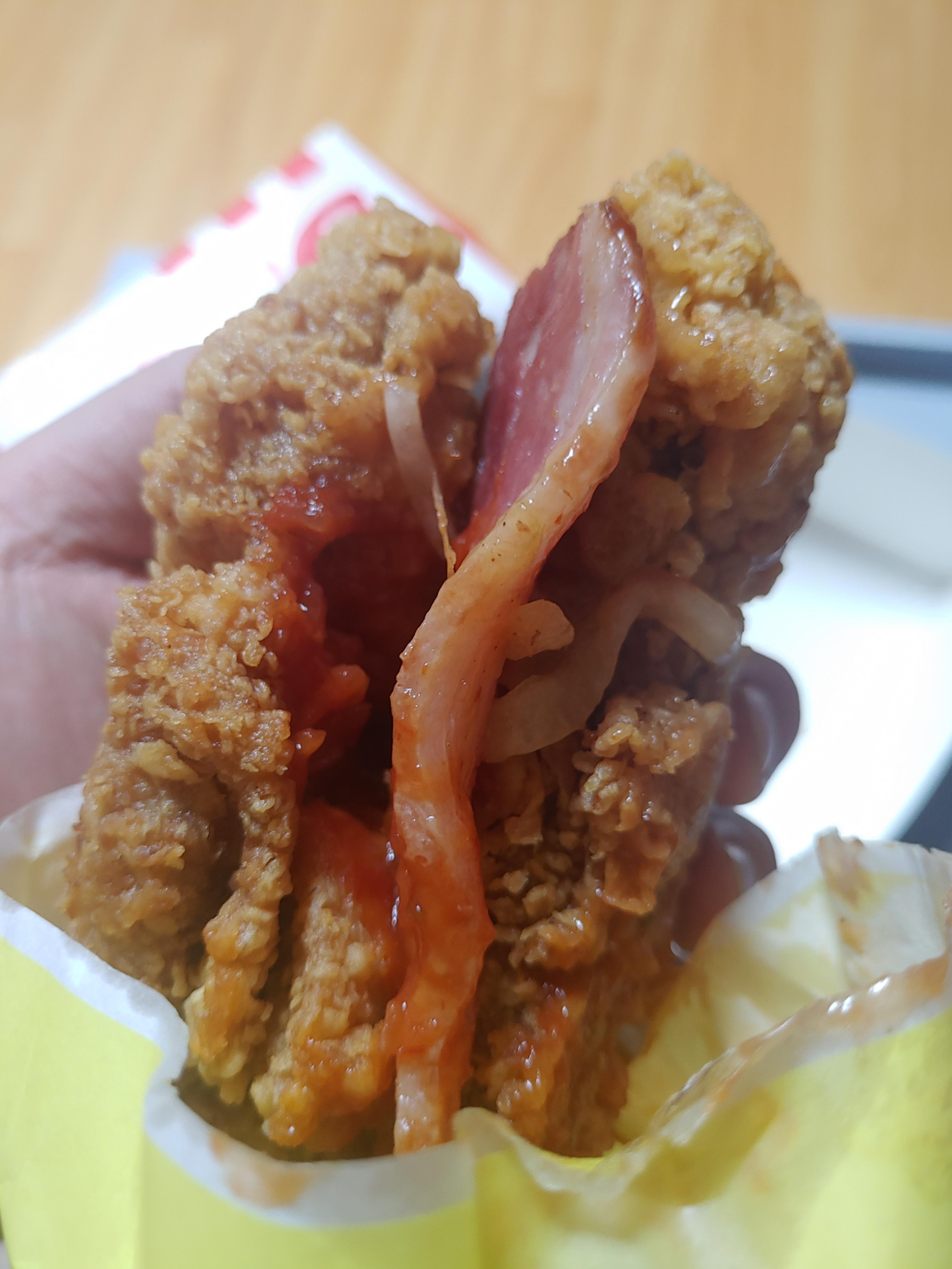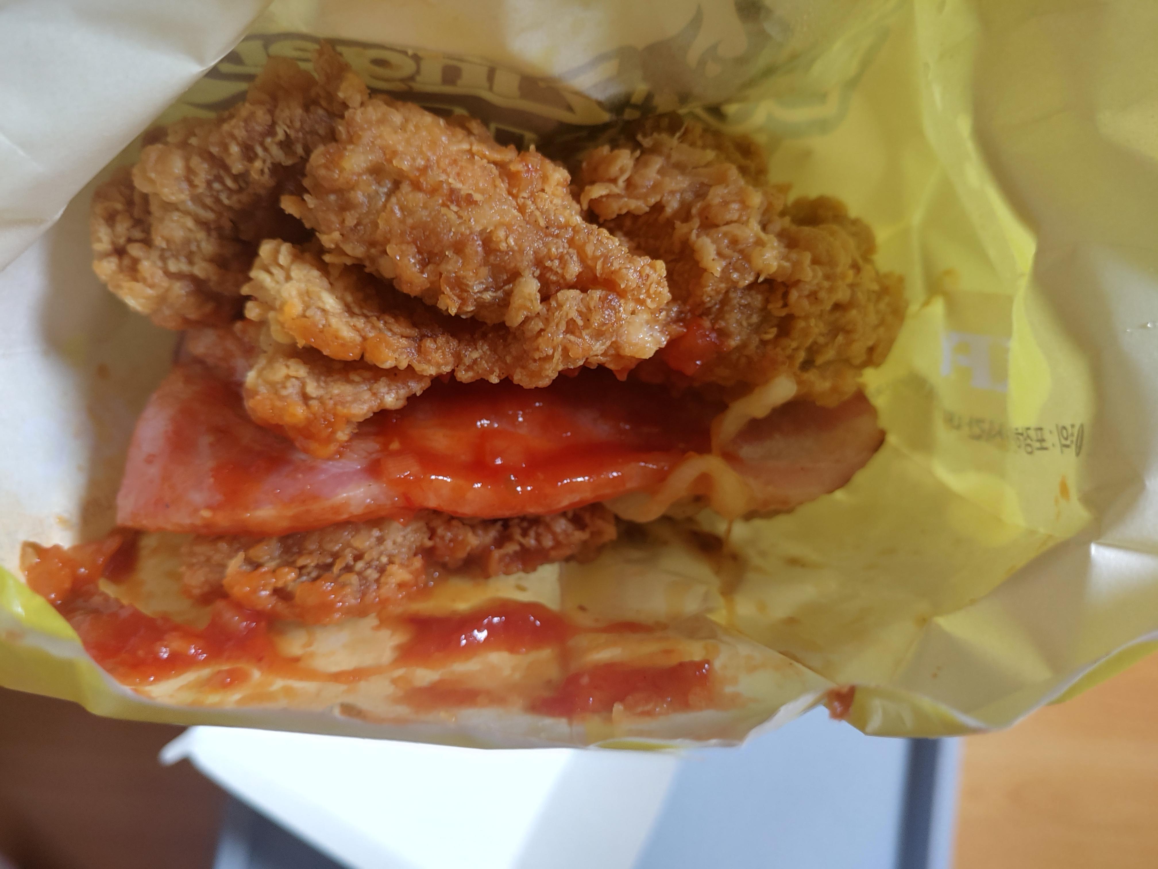 언뜻보면 치킨만 들어있는 것 같은데 실제로도 치킨으로 만든 진정한 치킨버거니까요 ^^;; 소스가 좀 흘러내리긴 했지만 내부에 통삽겹도 잘 보이고 소스도 그렇고 전체적으로 예전 징거더블다운맥스에 비해서는 확실히 업그레이드 느낌이었어요.