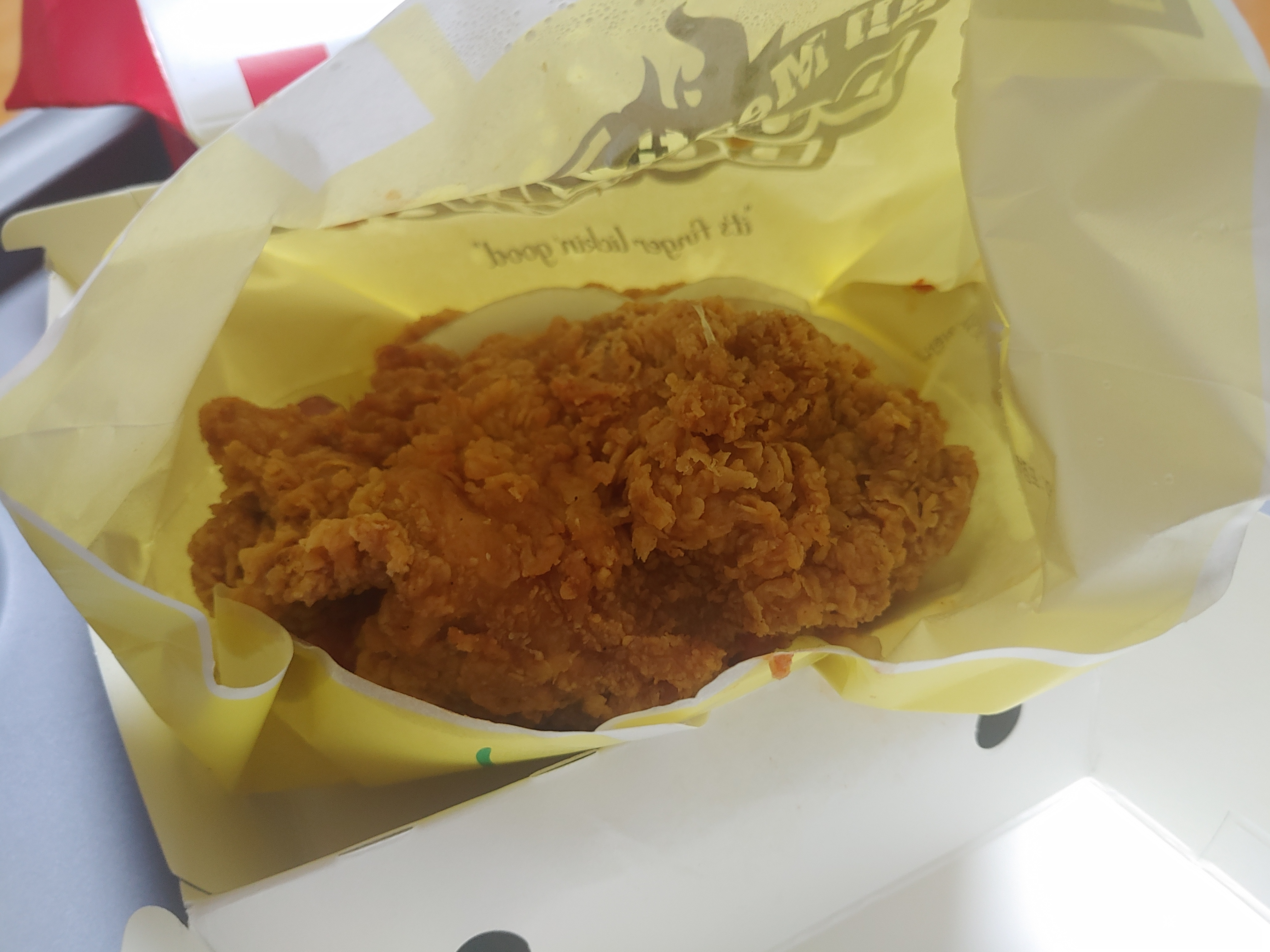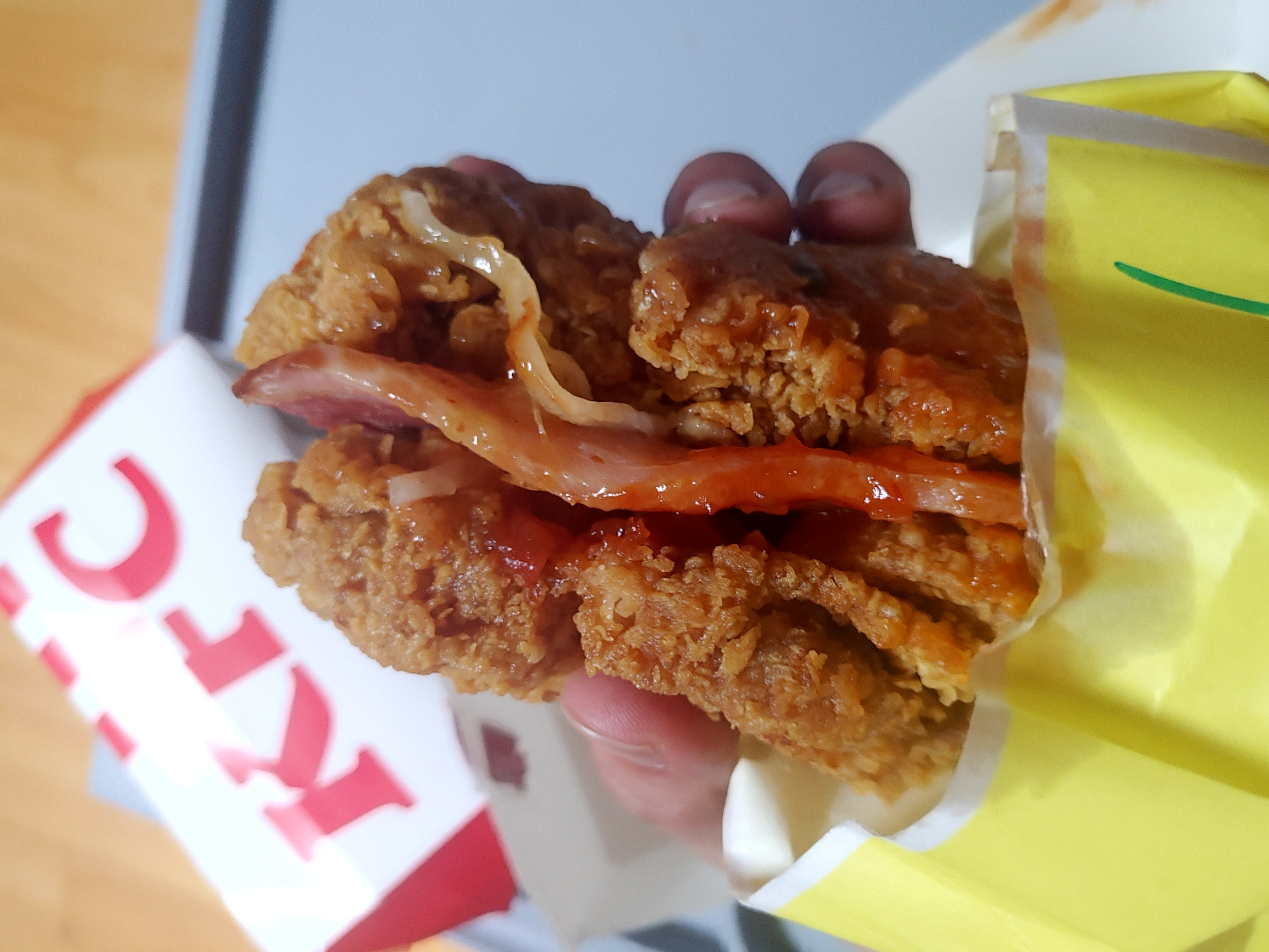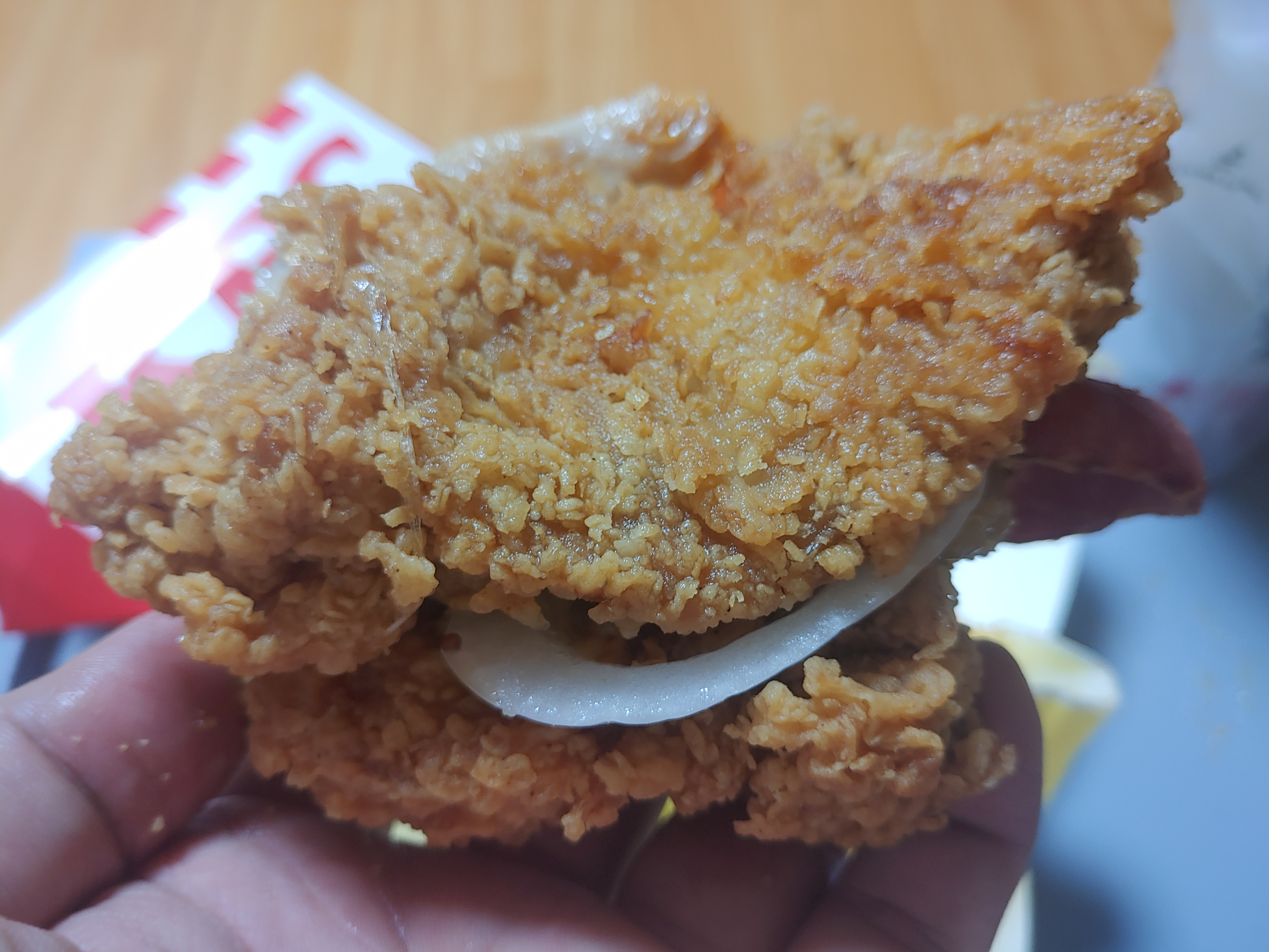 언뜻보면 치킨만 들어있는 것 같은데 실제로도 치킨으로 만든 진정한 치킨버거니까요 ^^;; 소스가 좀 흘러내리긴 했지만 내부에 통삽겹도 잘 보이고 소스도 그렇고 전체적으로 예전 징거더블다운맥스에 비해서는 확실히 업그레이드 느낌이었어요.