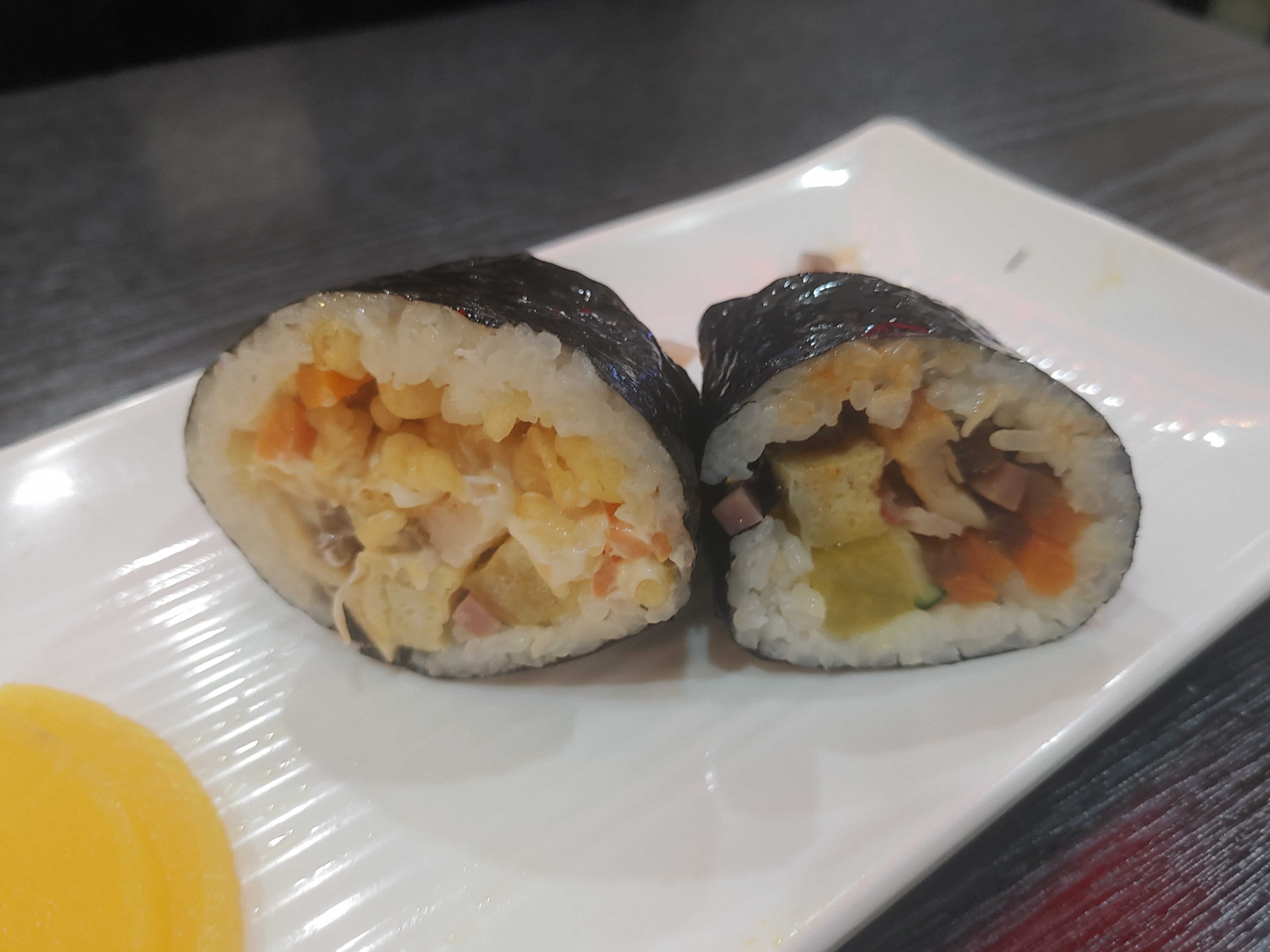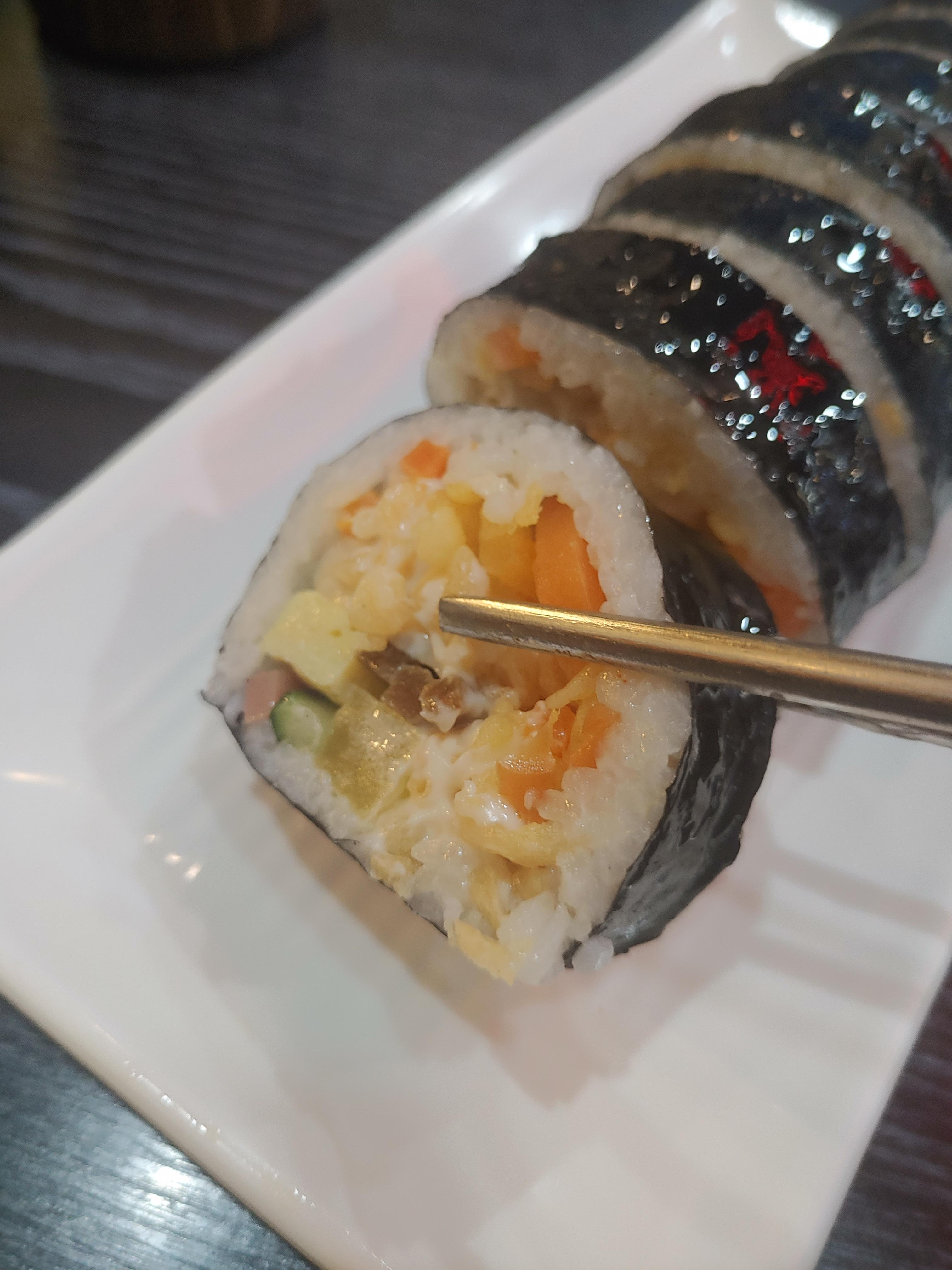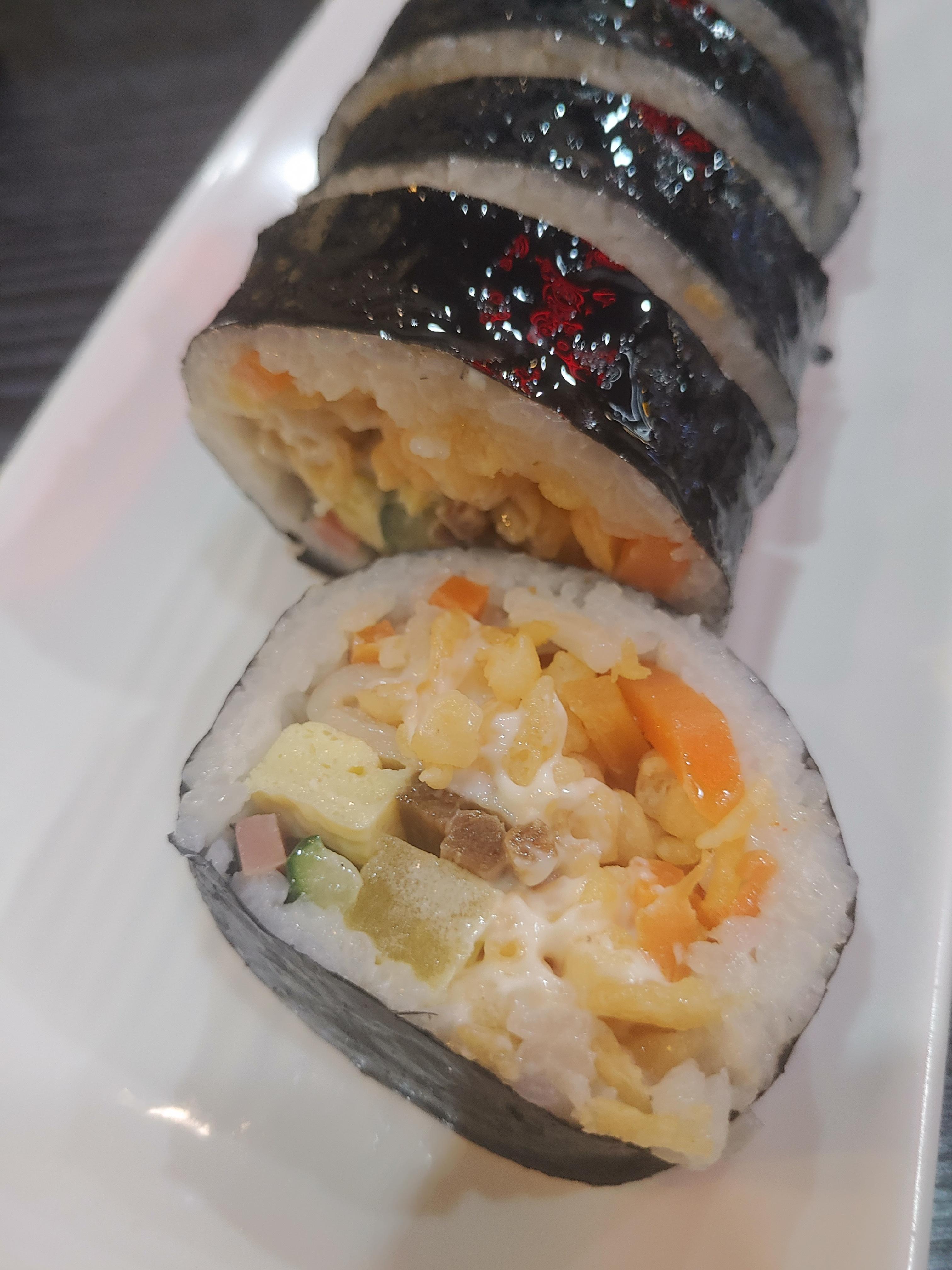 그리고 정말 신기하고 맛있었던 메뉴 !! 바로 마약튀김김밥이라는 김밥이었는데요. 다른데서 먹어 본적 없는 그런 김밥인데 엄청 괜찮더라구요. 잘잘한 튀김이 마요네즈와 잘 섞여서 들어가 있는 튀김속 김밥인데요. 아래 사진을 보시면 안쪽에 이렇게 튀김과 마요네즈가 잘 섞이 속이 엄청 맛이 괜찮더라구요