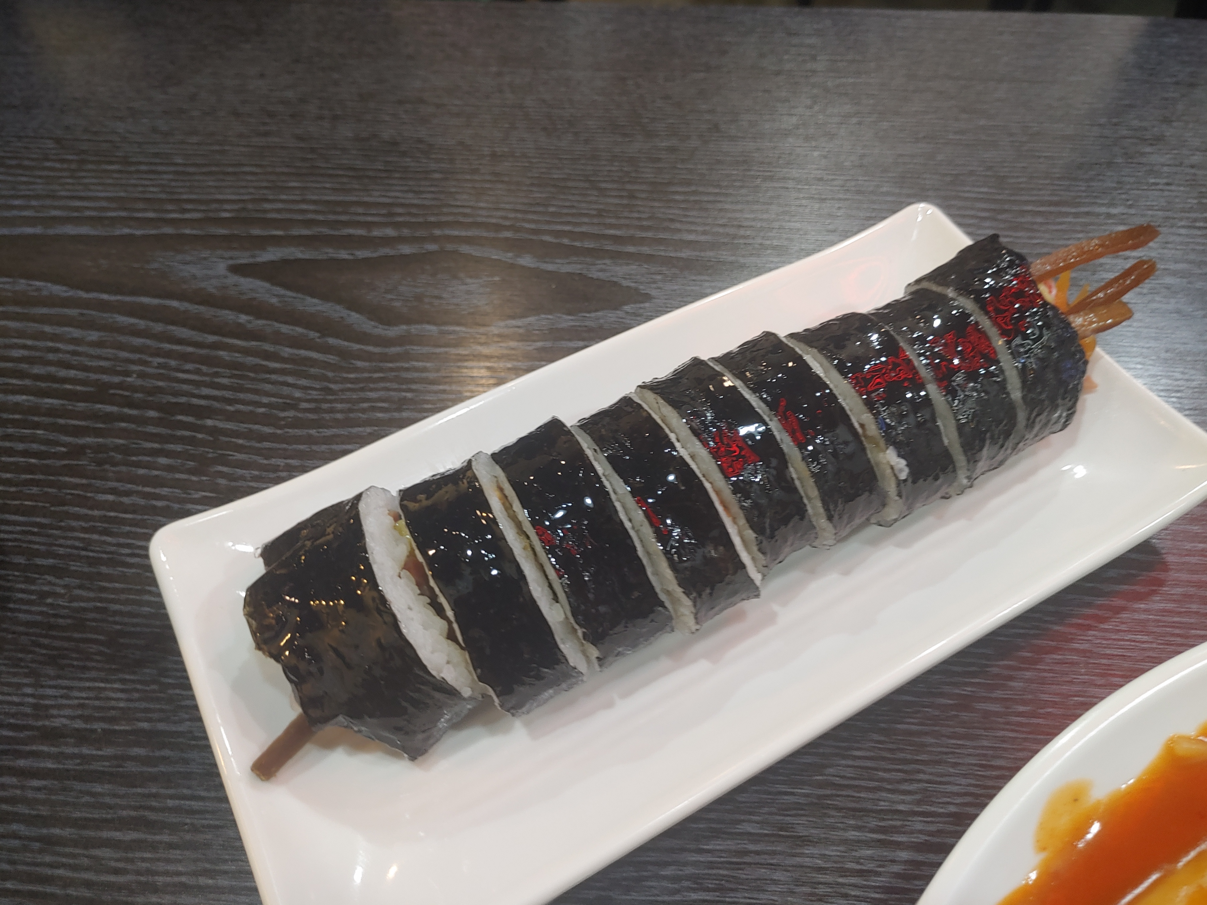 메가 김밥의 기본 김밥 메뉴인 메가 김밥은 전체적으로 우엉이 가득 들어가 있는 스타일의 빅사이즈 김밥이었는데요. 사이즈도 크고 속이 알차서 먹기 좋더라구요. 그리고 쫄볶이 양념에 찍어먹으니까 더 맛있었구요 ^^
