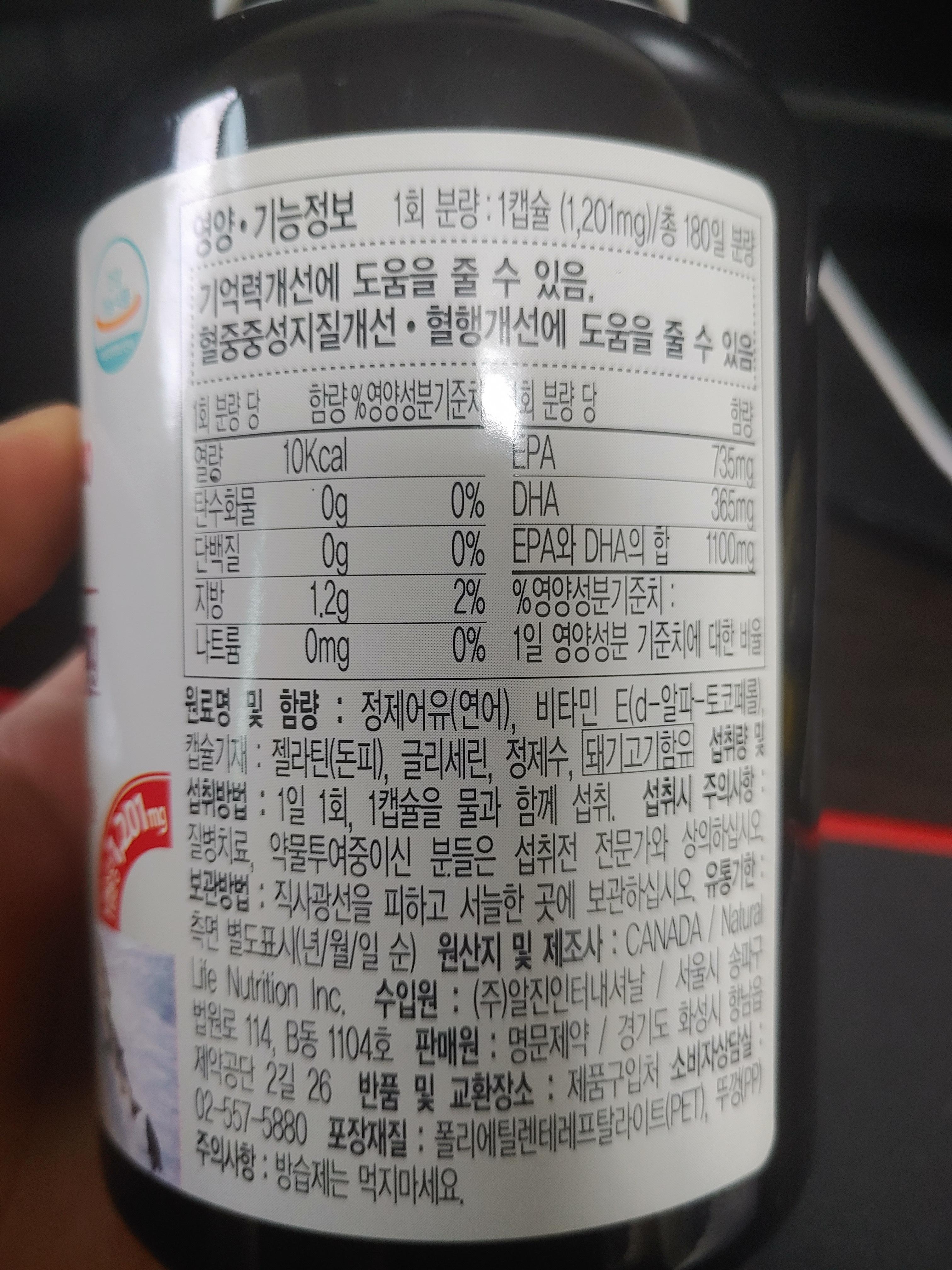 EPA 가 735mg 그리고 DHA가 365mg 로 총 오메가-3 함량은 1100mg 이구요. 위에 적어둔 대로 오메가3 고르는 방법으로 봐도, 상당히 고함량 오메가 -3 라고 하더라구요.