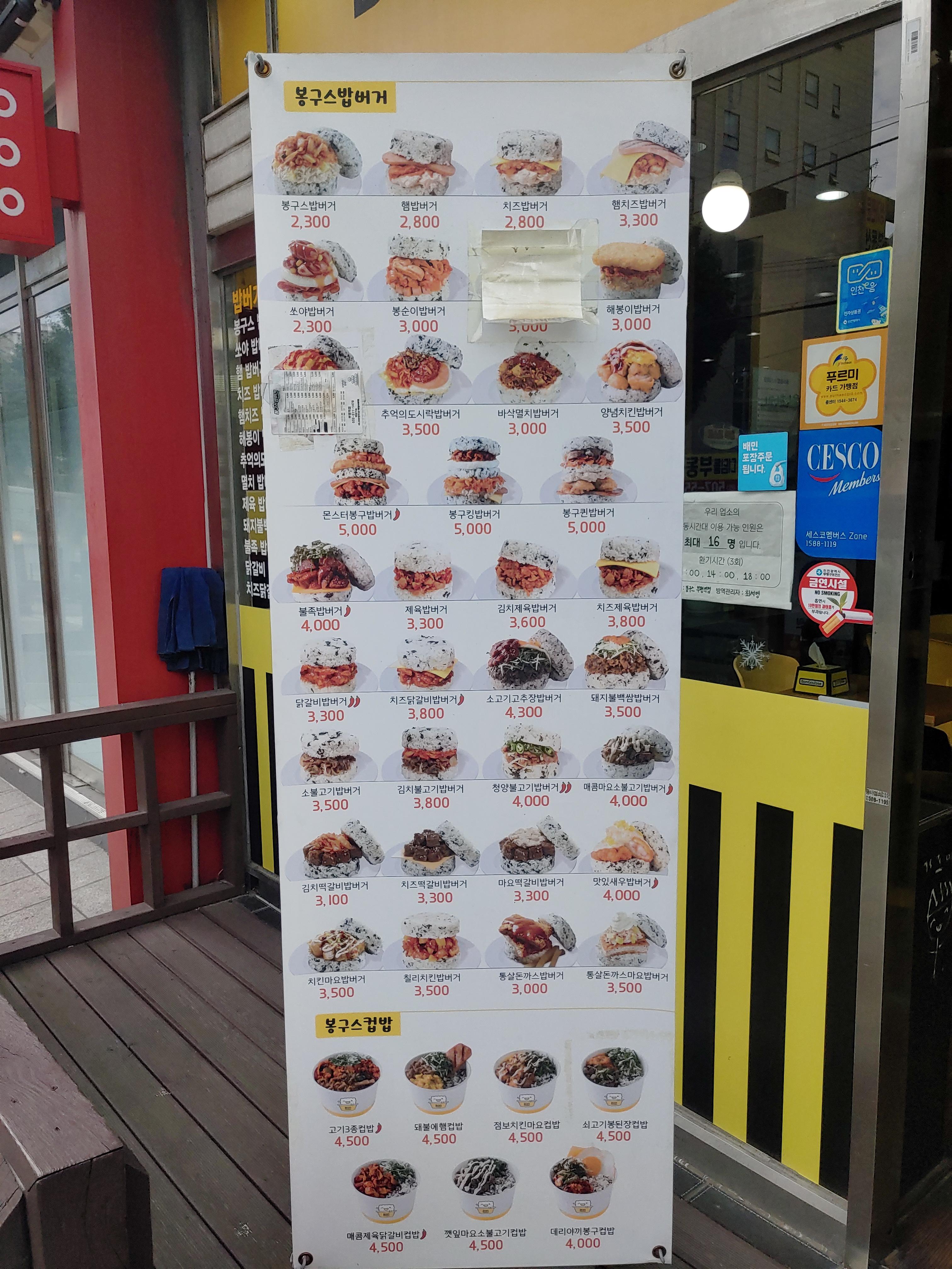 그리고 메뉴판에 보시면 컵밥들도 상당히 많이 생겼더라구요. 메뉴들도 더 예전에 비해서 이것저것 달라진것들도 많은 것 같고 개인적으로 제일 좋아하는 밥버거는 역시 기본인 봉구스 밥버거 그리고 그외에 저는 이것저것 거의 먹어보기는 했던것 같은데, 기본이 제일 좋았었어요.