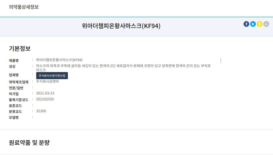 KF94 보건용 마스크 제품은 요새는 덜하지만 예전에는 정말 별의 별일이 다 있었고, 그래서 꼭 이렇게 의약외품 안전나라에 KF94로 검색이 되는 마스크인지를 확인하는 편인데요. 아래 보시는 바와 같이 위아더챔피온 마스크라고 해서 의약외품 안전나라에 검색이 되는 것을 볼 수 있어요. 마스크는 원래 의약외품이라 이렇게 상세정보가 식약처에서 다 제공을 해주는 품목이에요. 그만큼 믿을 수 있는 보건용 KF94 등급의 마스크라는 이야기죠