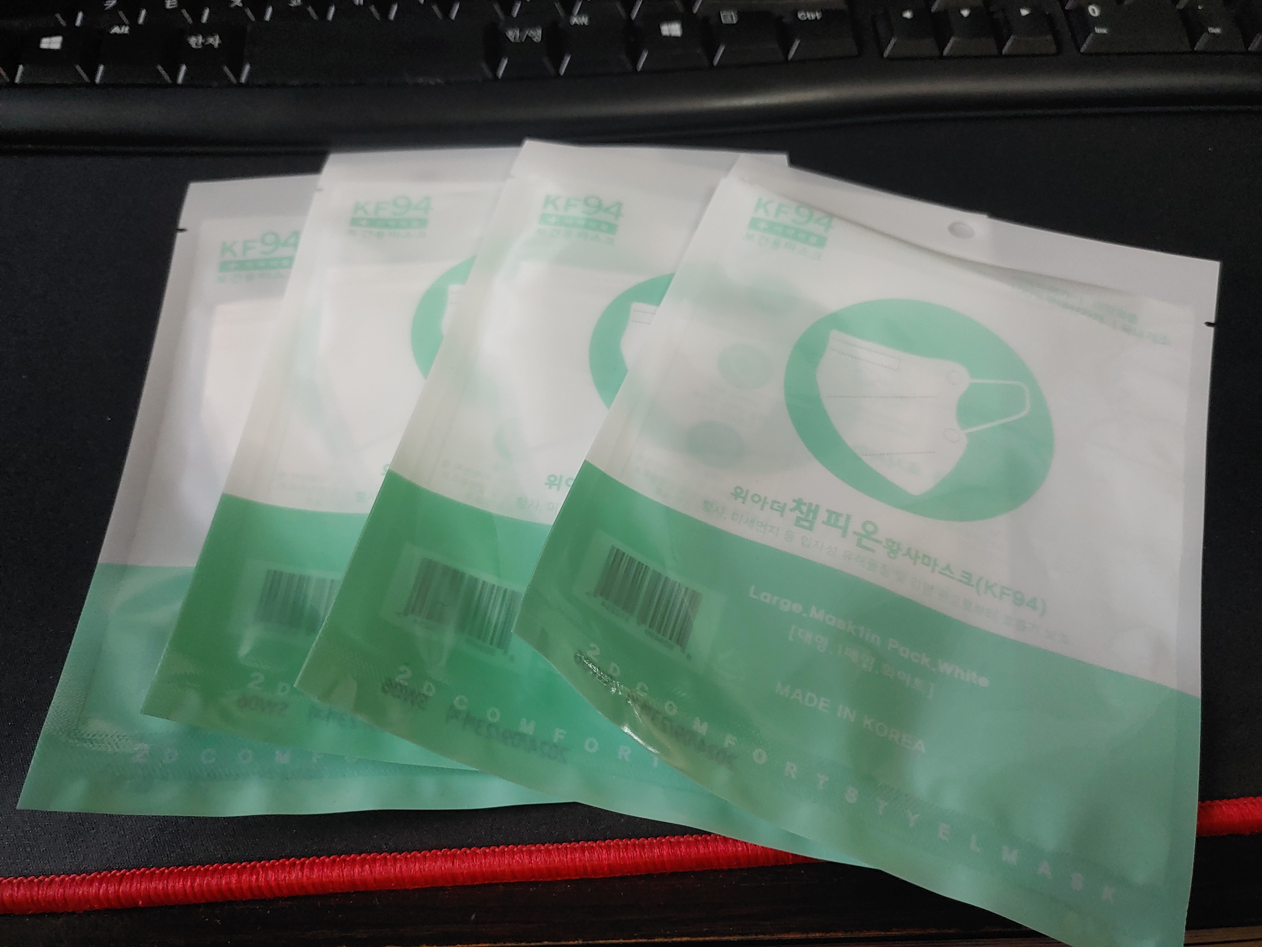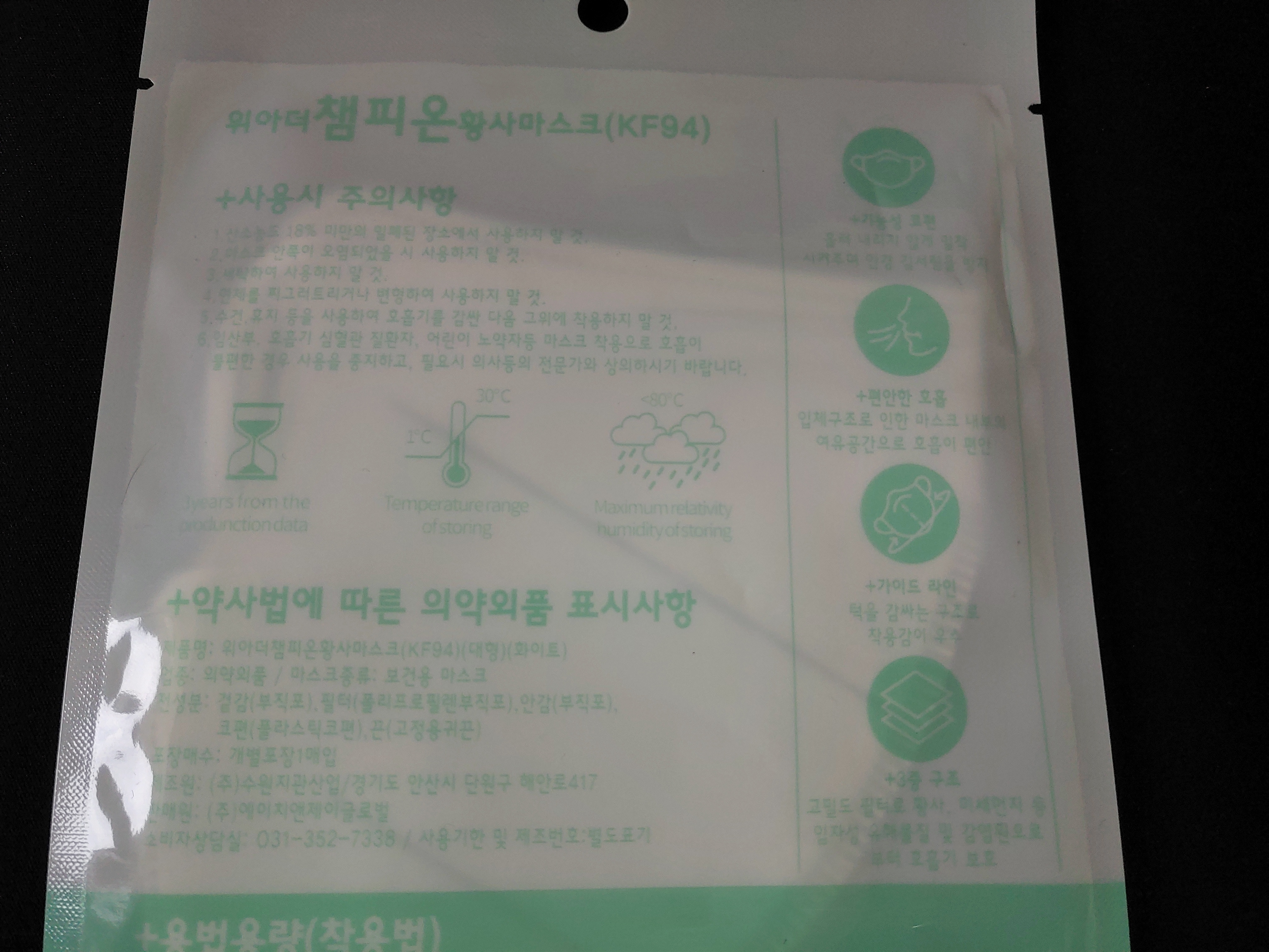 바로 KF94 위아더챔피온이라는 특이한 이름을 가진 마스크였는데요. 식약처 허가 / 의약외품 / 100% 국내산 자재 / 국내제조로 믿을 만 할 것 같고, 크기가 다른 아에르나 호마스크에 비해서 크다는 점 때문에 주문을 한 마크스에요 !!