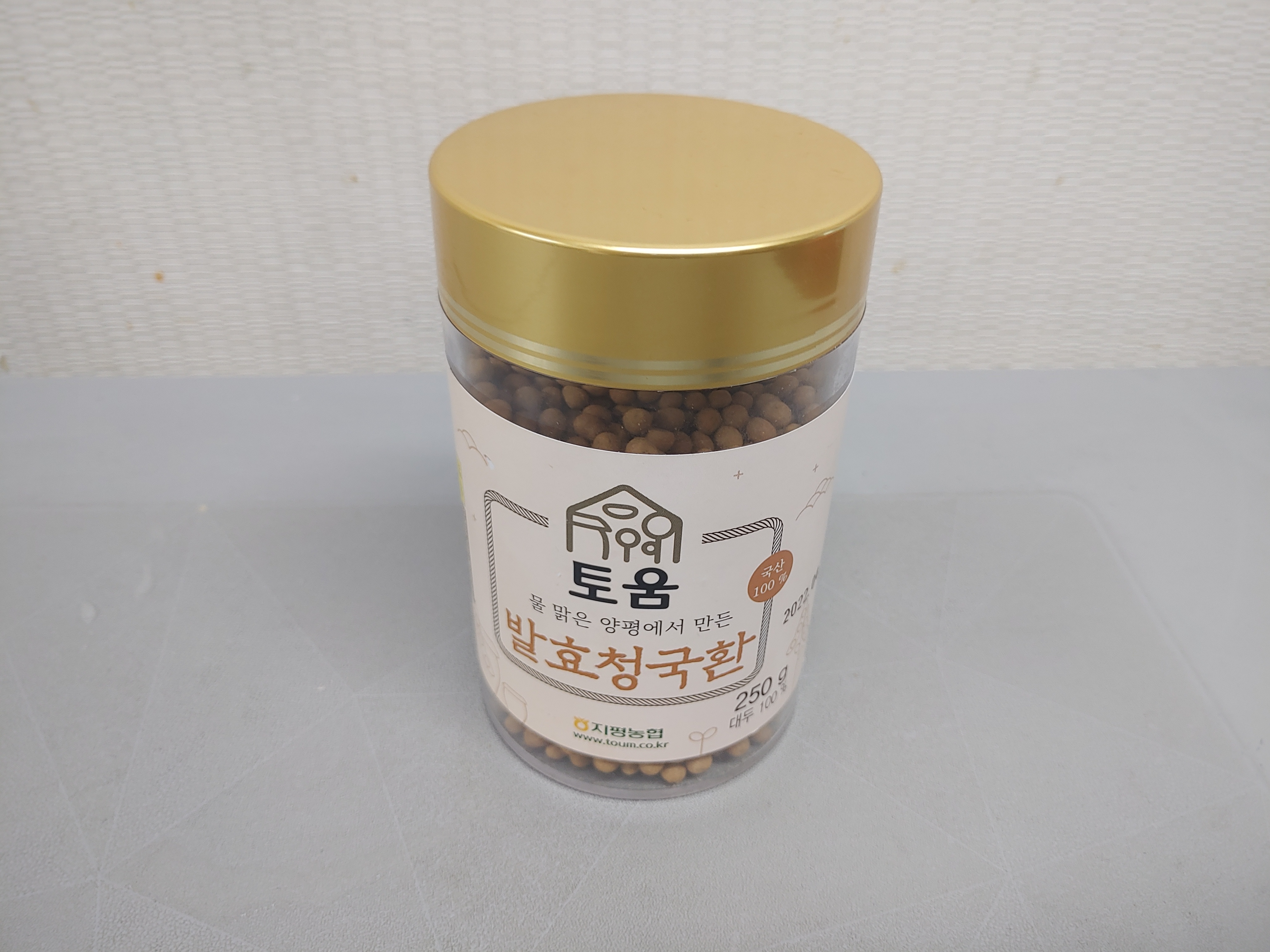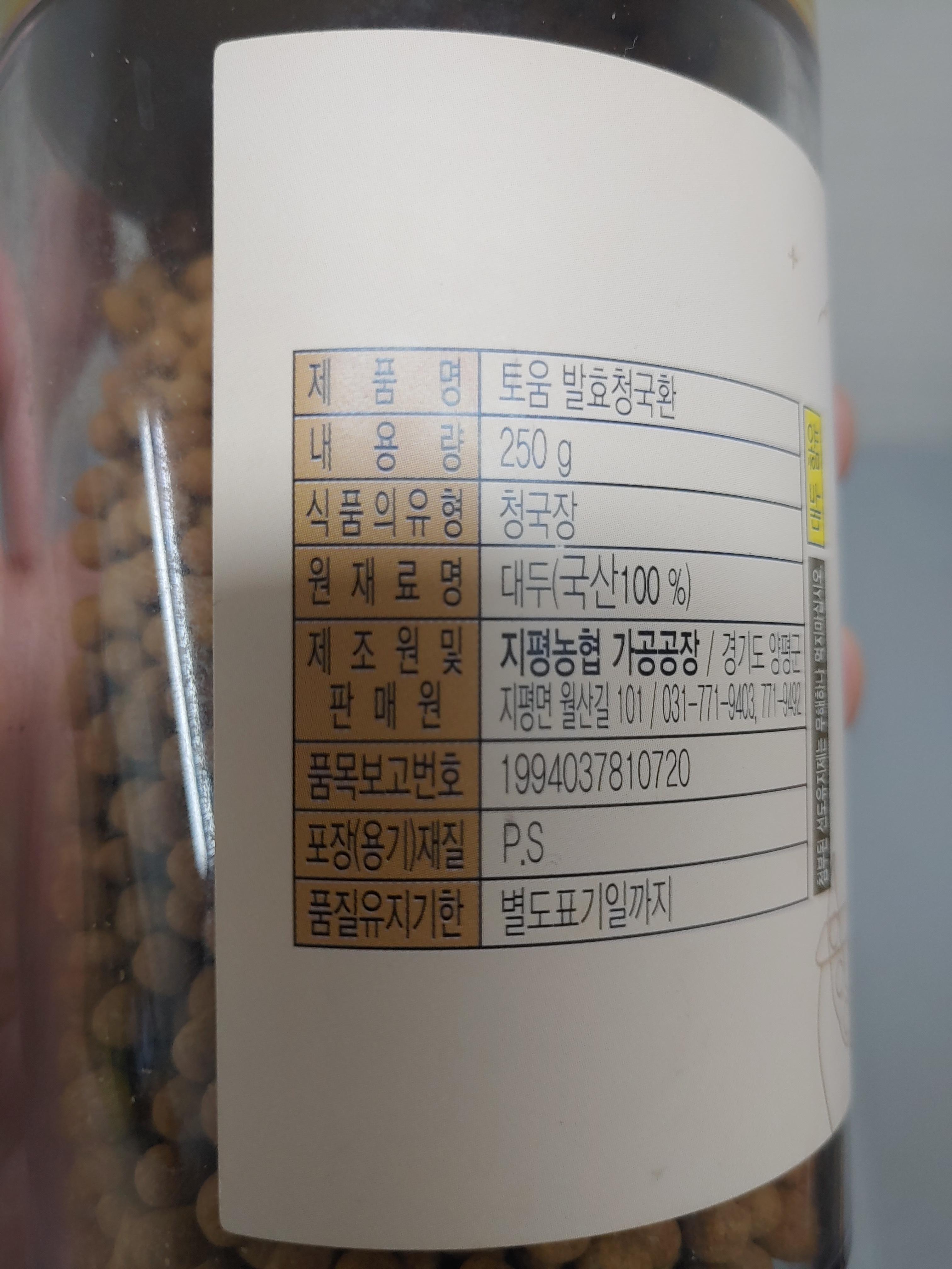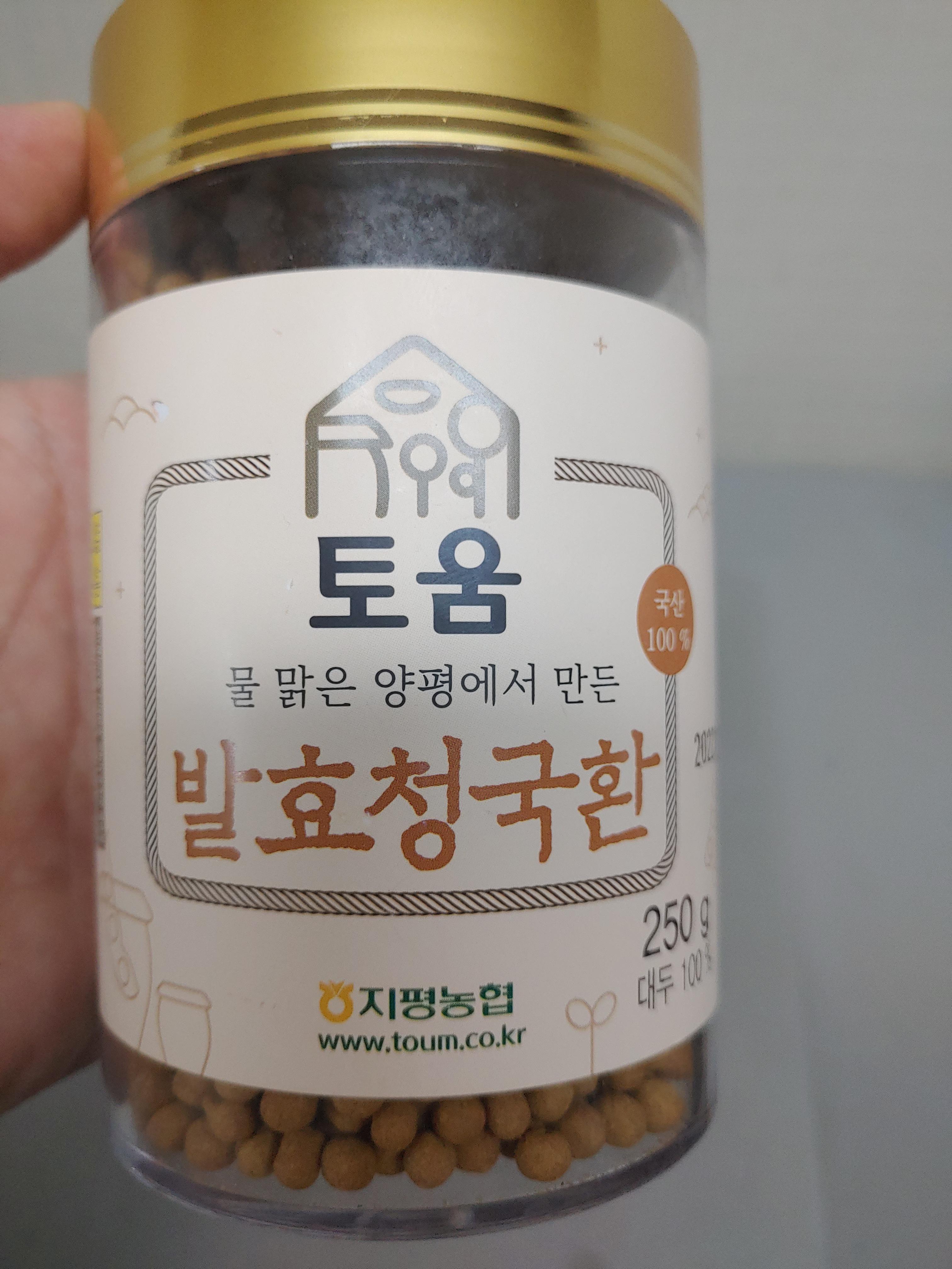 물 맑은 양평에서 만든 국산 100% 발효청국환. 토움이라고 지평농협의 브랜드 이름인 것 같구요. 250g 정도인데 생각보다 양이 꽤 되는 것 같았습니다. 냄새도 좀 있고, 일반 국물 청국장으로 먹기에는 부담스러운 발효콩을 이렇게 환 형태로 손쉽게 먹을 수 있도록 한 제품이에요.