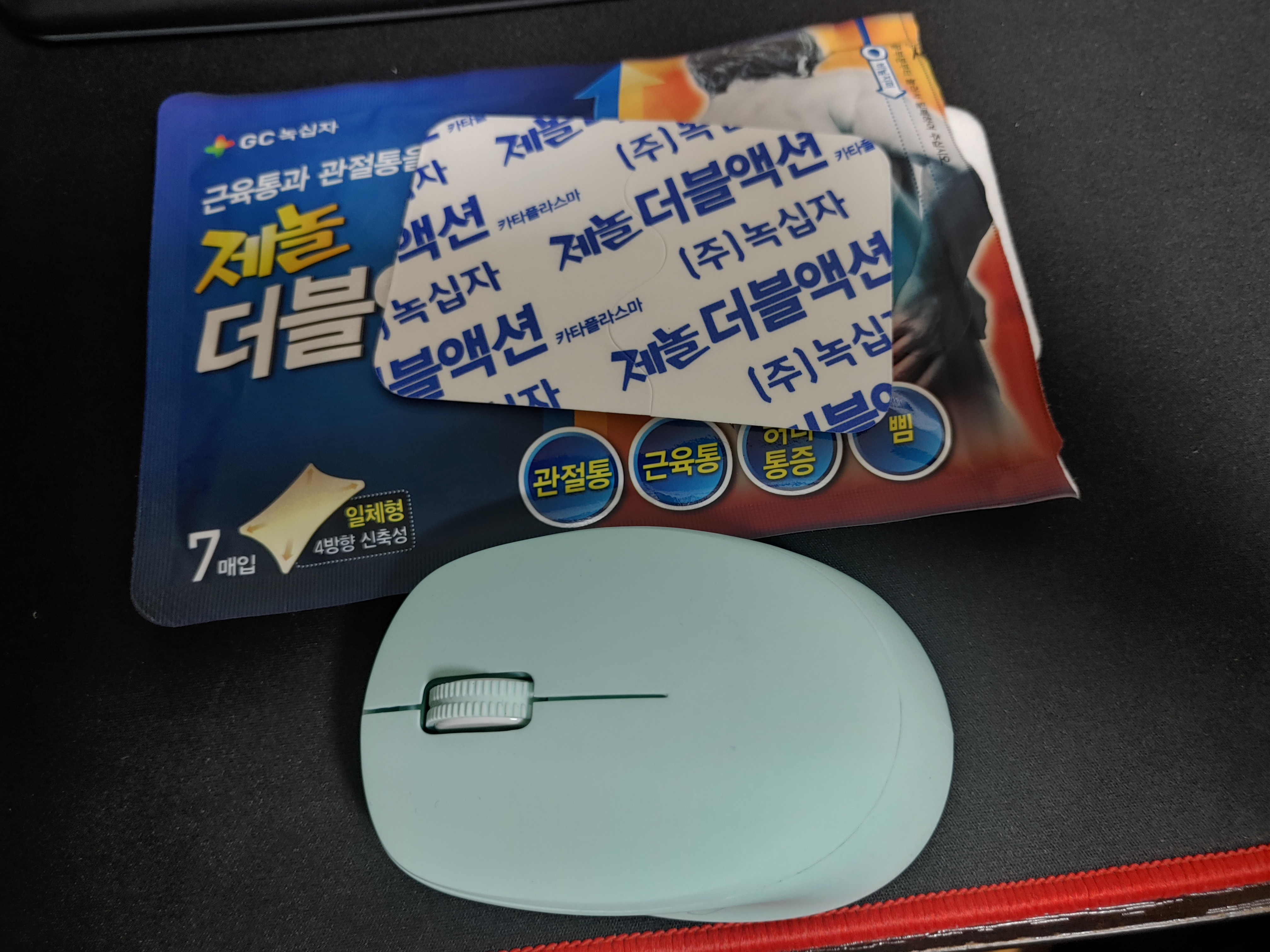 집에 있는 작은 마우스와 비교를 해봤는데 생각보다 사이즈가 작아서 그런지 앙증맞더라구요. 하지만 제놀 더블액션 효과는 상당히 좋다고 느껴졌는데요. 아픈부위가 화끈한 느낌도 약간 냉감도 있는 것 같고 자극이 조금 있는 편이더라구요. 약사선생님 말씀으로는 처음에는 차갑고 나중에는 뜨거워 진다고 했는데 저는 그냥 조금 계속 뜨거운 자극 위주로 느껴지기는 했지만요 ^^;; 확실히 작아도 뭔가 자극이 강해서 그런지 꽤나 파스를 붙였구나 하는 느낌이 확 들더라구요.