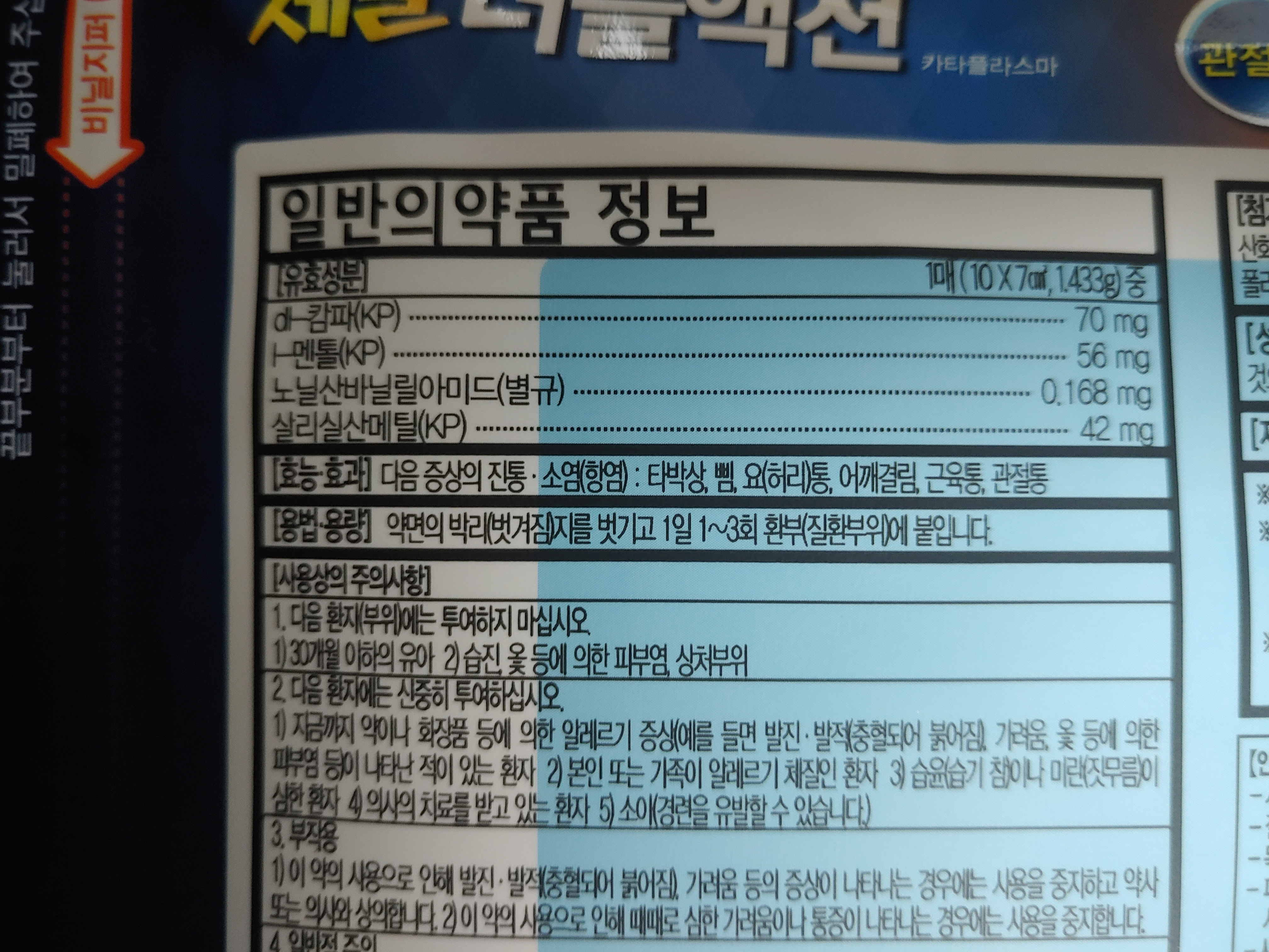유효성분은 DL-캄파(KP) / L-멘톨(KP) / 노닐산바닐릴아미드 / 살리실산메틸(KP)이 들어가 있는데요. 파스의 종류 중에서는 살리실산이 들어있는 파스로 분류를 하는데요. 살리실산은 해열 진통 소염 작용이 있는 성분이에요. 파스에 주로 많이 사용되는 성분이라고 하더라구요.
