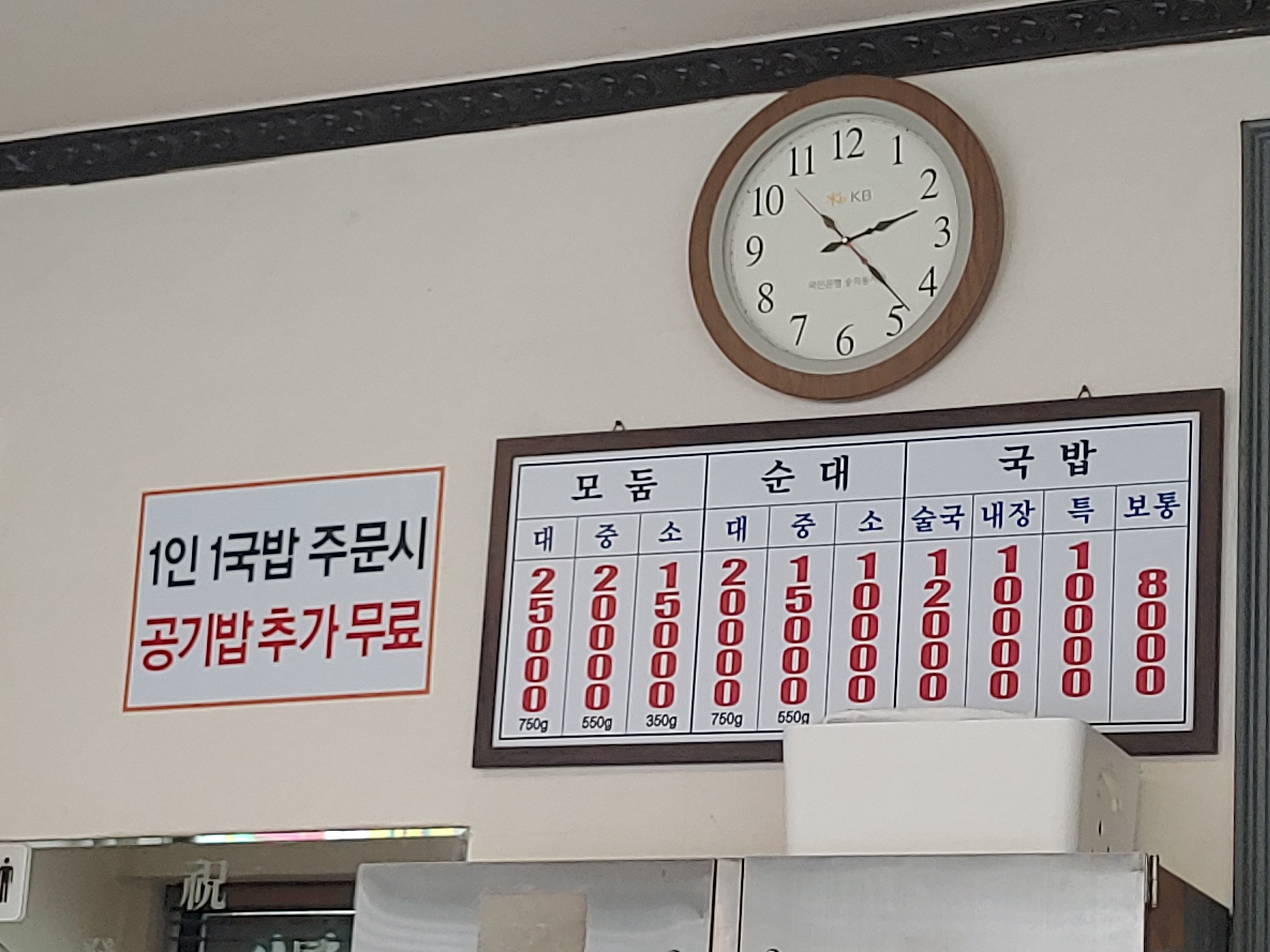 인천순대국맛집 이화찹쌀순대의 영업시간과 가격인데요. 일요일은 휴무더라구요. 그리고 가격대는 국밥은 보통이 8천원 정도. 특은 1만원정도인데요. 그외에 순대나 모듬의 가격은 조금 있는 편이에요.