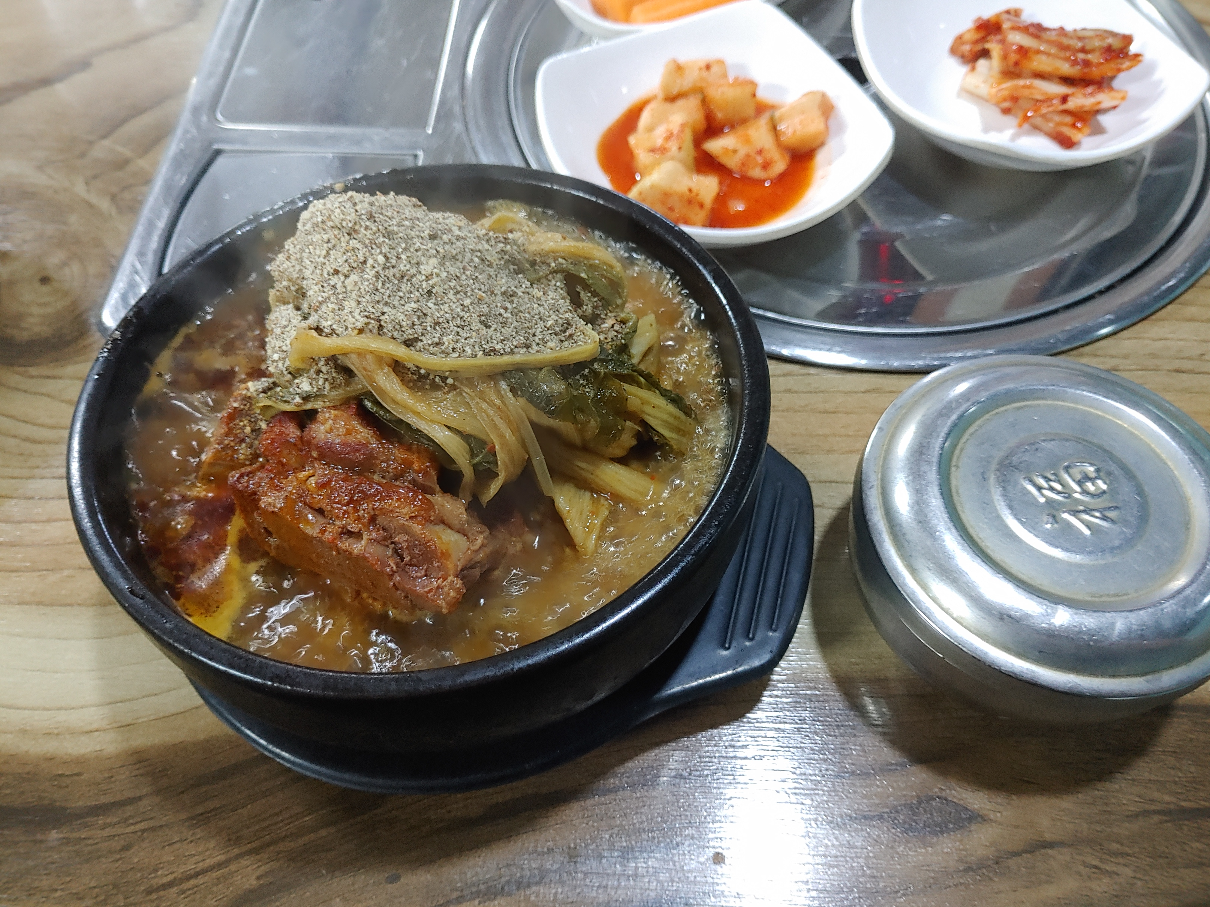 기본찬은 감자탕집에서 흔하게 볼 수 있는 김치와 깍두기 그리고 양파당근 쌈장까지 ㅎㅎ 여기 부평시장 전라도감자탕의 깍두기가 꽤 괜찮았구요. 쌈장에 찍어먹는 양파도 좋았습니다.
