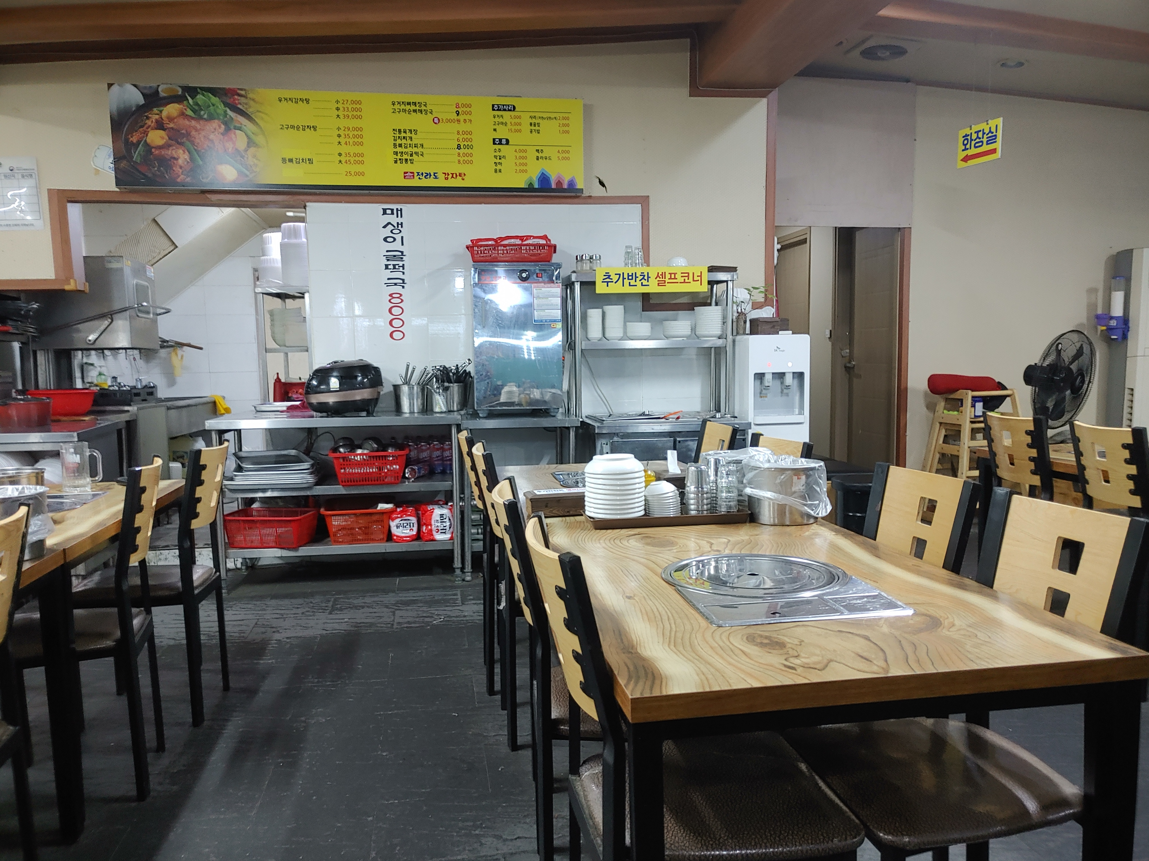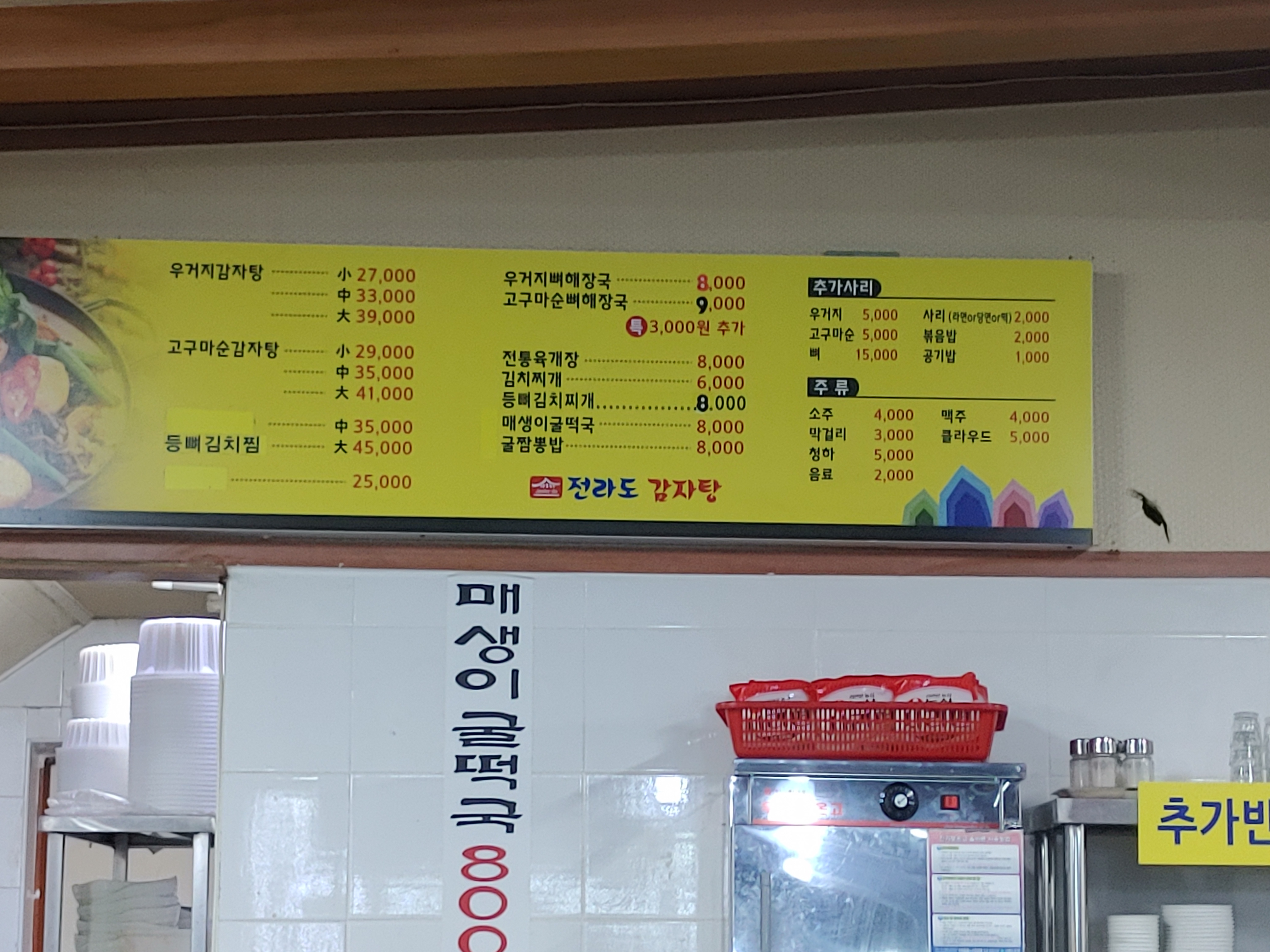 내부는 깔끔하고 김치와 깍두기 같은 반찬들은 추가해서 먹을 수 있도록 준비도 되어 있더라구요. 메뉴는 역시 감자탕. 그리고 특이하게 고무마순 감자탕이 있더라구요. 여쭤보니까 여기는 우거지감자탕이 있고, 우거지가 아니라 고구마순을 올린 고구마순감자탕도 있는게 정말 특이했는데요. 이날은 저는 처음이라 ㅎㅎ 우거지 뼈해장국으로 주문을 했습니다.