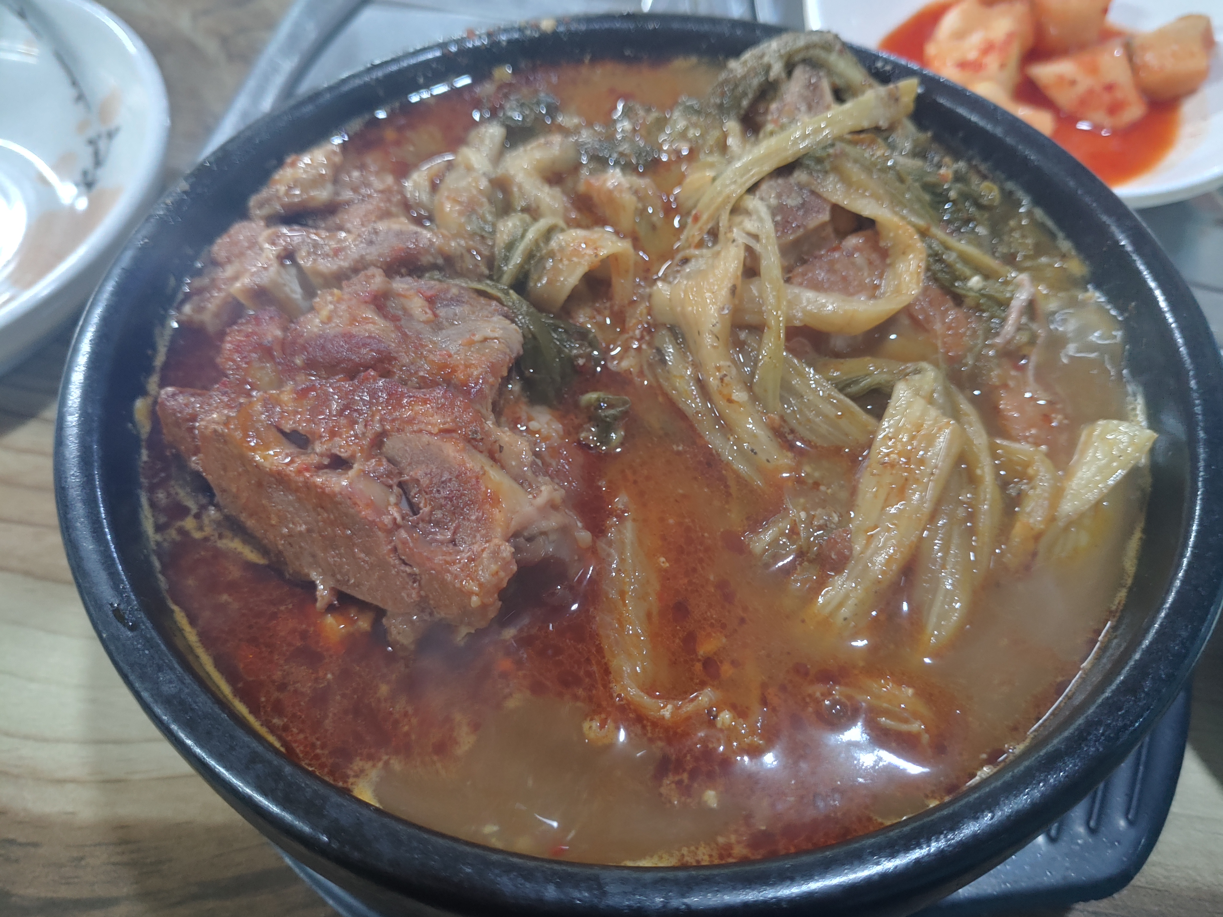 특사이즈로 주문한 우거지 뼈해장국 !! 처음에 딱 나왔는데 비쥬얼도 좋고, 위에 우거지와 들깨가루가 가득 올라와 있어서 뭔가 굉장히 맛있겠다 생각이 들었습니다. 개인적으로 원래 우거지도 좋아하고, 들깨가루도 좋아하는 편이라 ㅎㅎ일단 비쥬얼은 전체적으로 만족스러운 느낌의 감자탕이었어요.