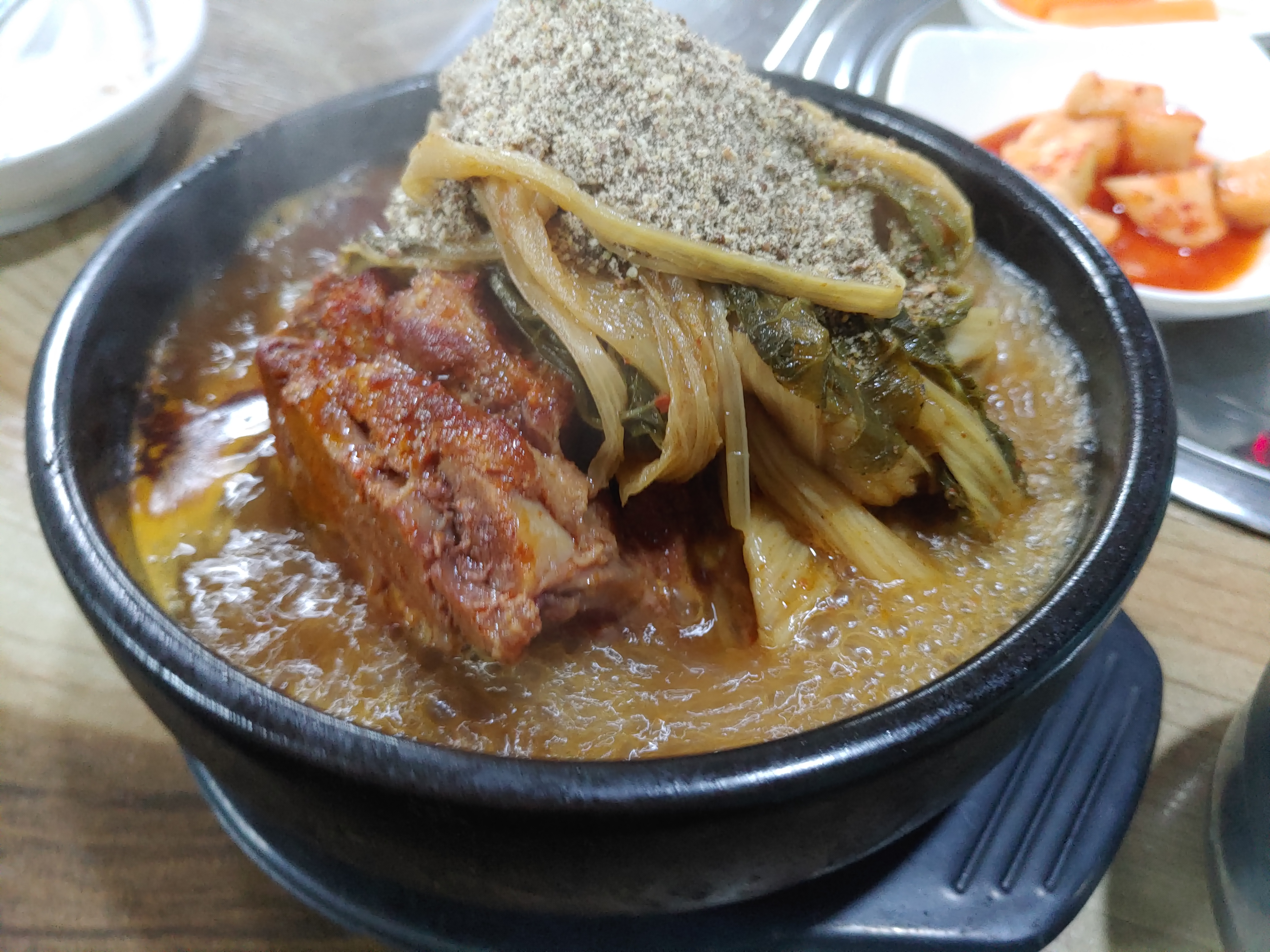 김이 모락모락 올라오는 것이 보이시나요? ㅎㅎ 진짜 갑자기 날이 추워지고 10월 날씨로는 최고의 추위라고 하는데 너무너무 뜨끈한 국물이 기분이 좋아지기도 했습니다. 또 그리고 한입 딱 뜨는데 감자탕이 정말 괜찮아서 또 한번 더 행복한 기분이었어요