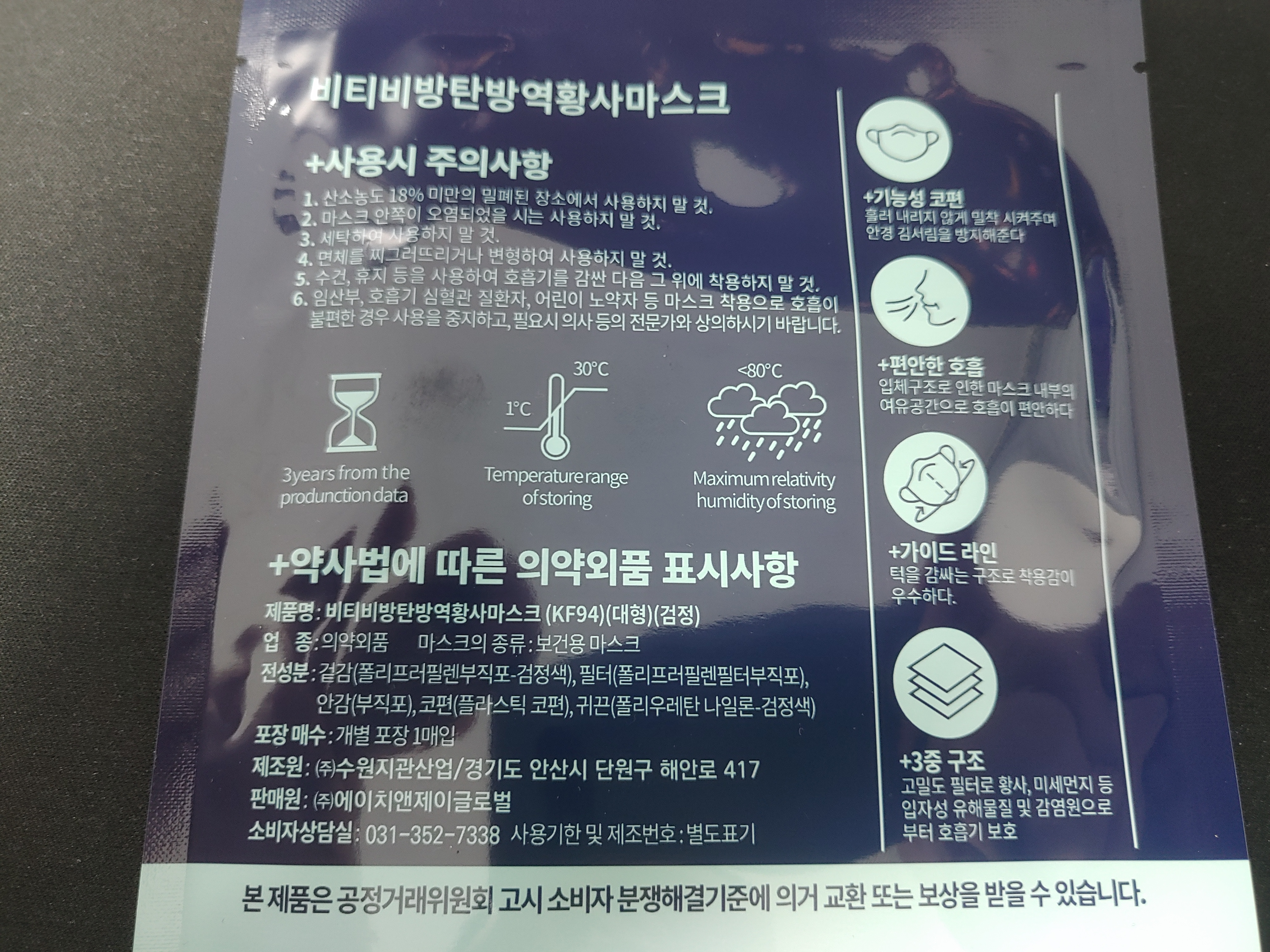 뒤에 상세하게 나와있는 내용을 보니까 3중구조에 턱을 감싸는 구조로 되어 있어서 더 넓다고 느껴진 것 같은데요. 대형 마스크인데 크기가 거의 특대형 같은 느낌인데 보니까 이런 부분이 장점인 것 같더라구요.