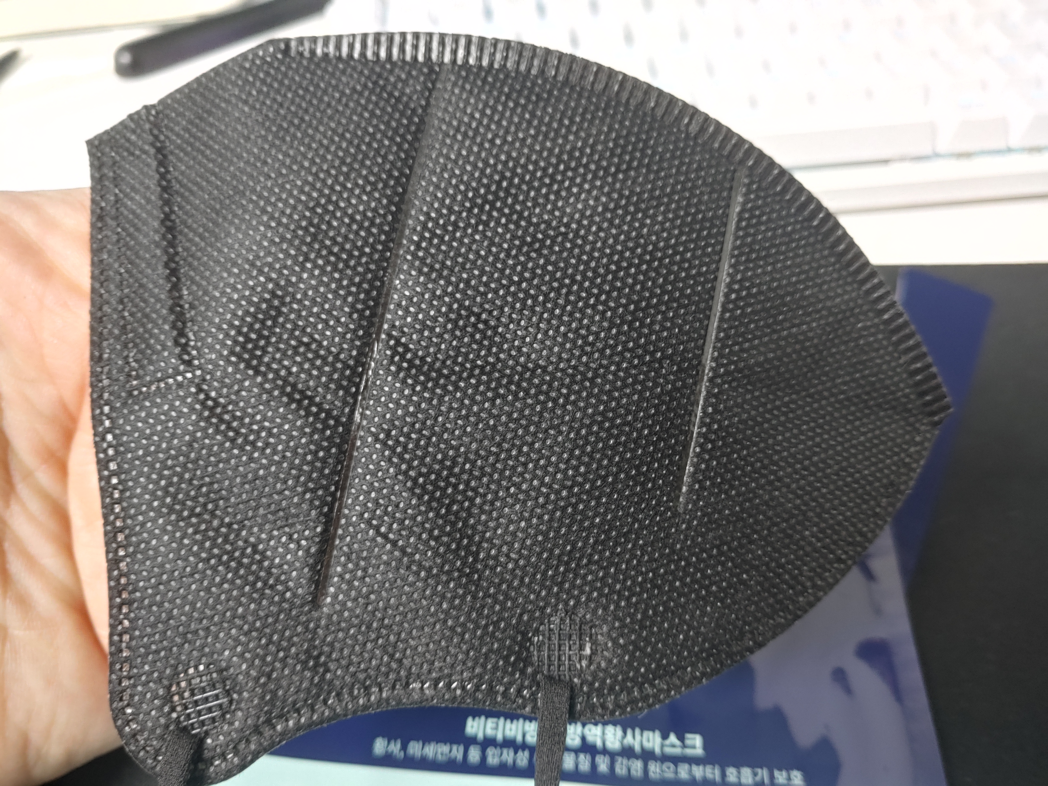 앞면은 블랙이지만 뒷면은 화이트에요. KF94 보건용 마스크들은 다 이렇게 나오더라구요. 두번째로 보풀 부분도 없다고 느껴진것이 확실히 전 자체가 가벼우면서도 괜찮은 느낌이었는데요. 보풀이 많이 없어서 오래 쓰거나 해도 괜찮았다는 점도 괜찮았어요.