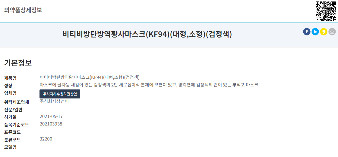 의약외품 안전나라에 있는 KF94 보건용 마스크 인증도 있고, 검정색으로 나온 마스크더라구요.