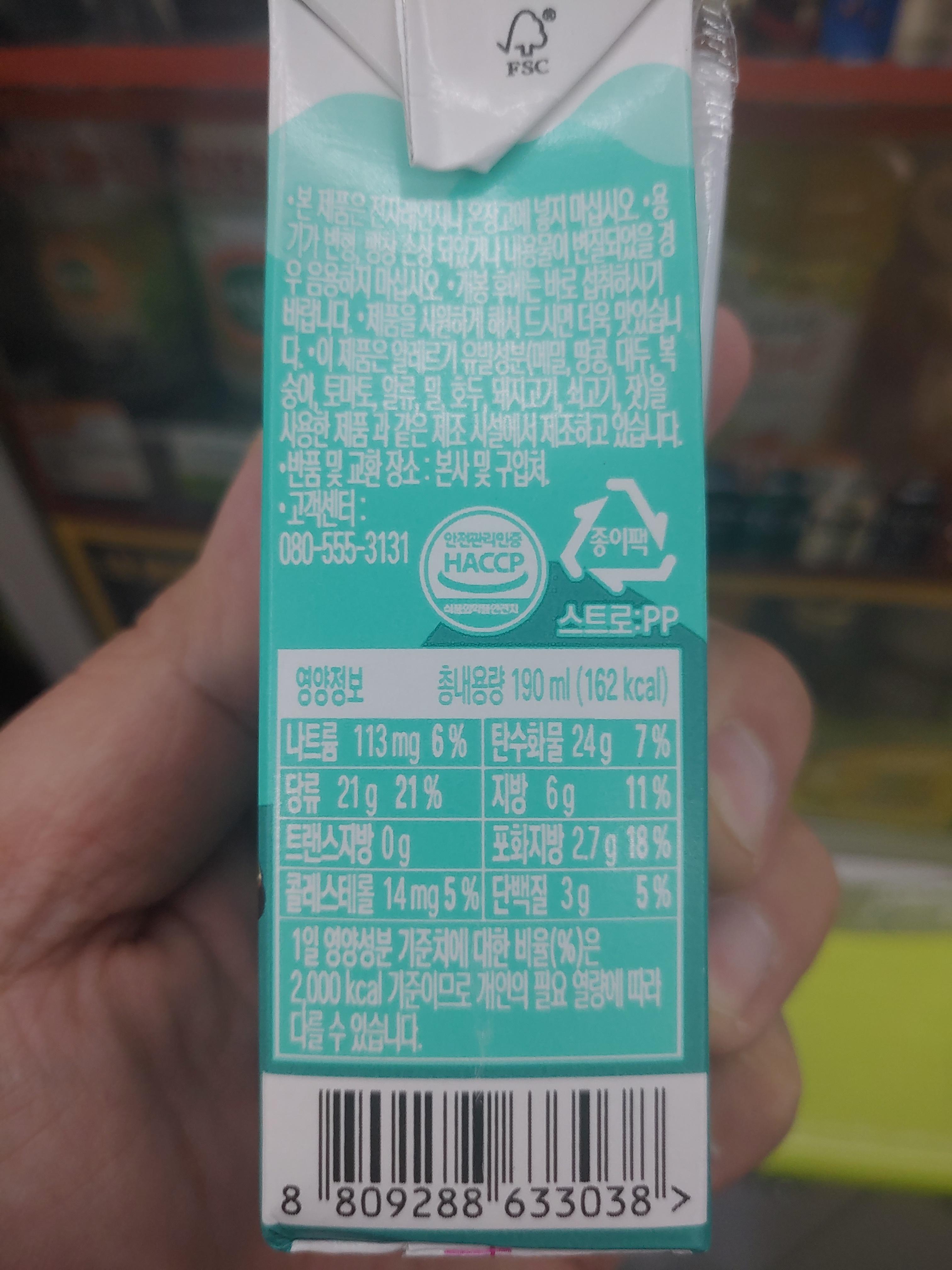 민트초코 우유의 구성성분은 가공유 190ml (162kcal) 그리고 원유 50% , 기타 코코아가공품, 그리고 페퍼민트 추출물분말이 들어가 있습니다. 역시 민트와 초코가 그대로 들어가 있군요 ^^;;
