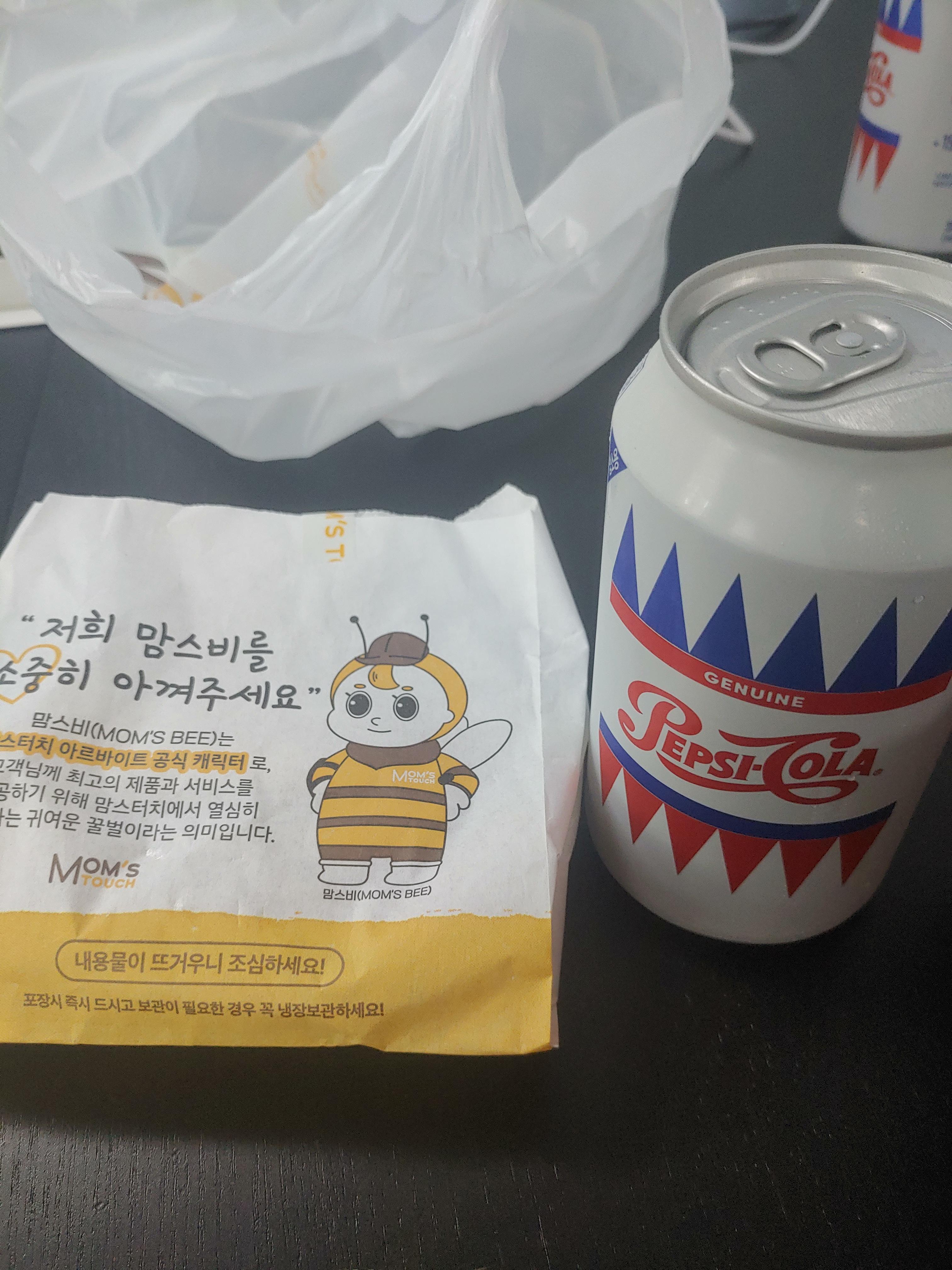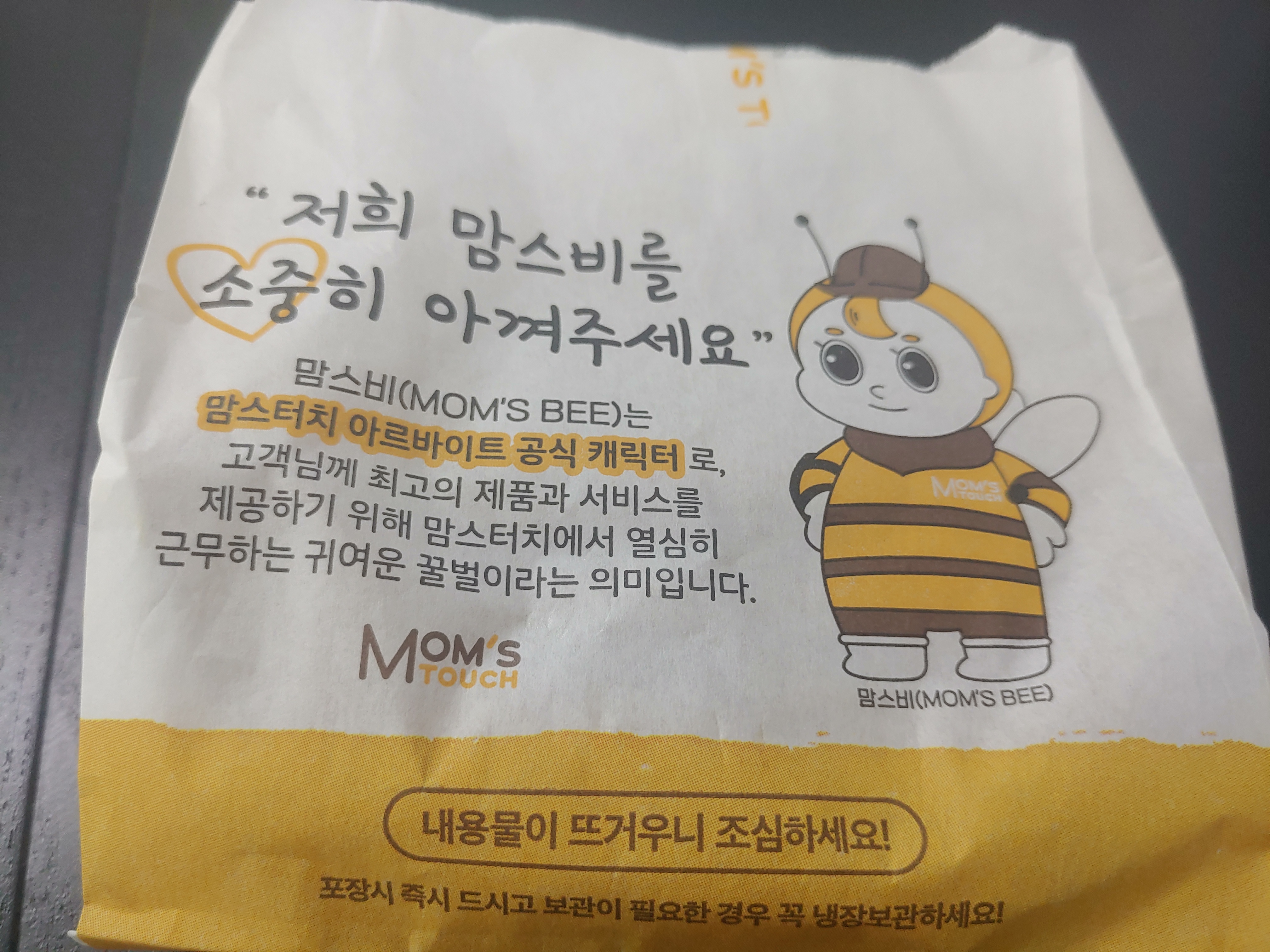 케이준 양념감자와 콜라는 이렇게 도착을 했구요. 맘스비라는 캐릭터가 이쁘게 그려져 있길래 사진으로 담아봤습니다 ㅎㅎ 아르바이트 공식캐릭터 같은것들도 만든 것 같더라구요.