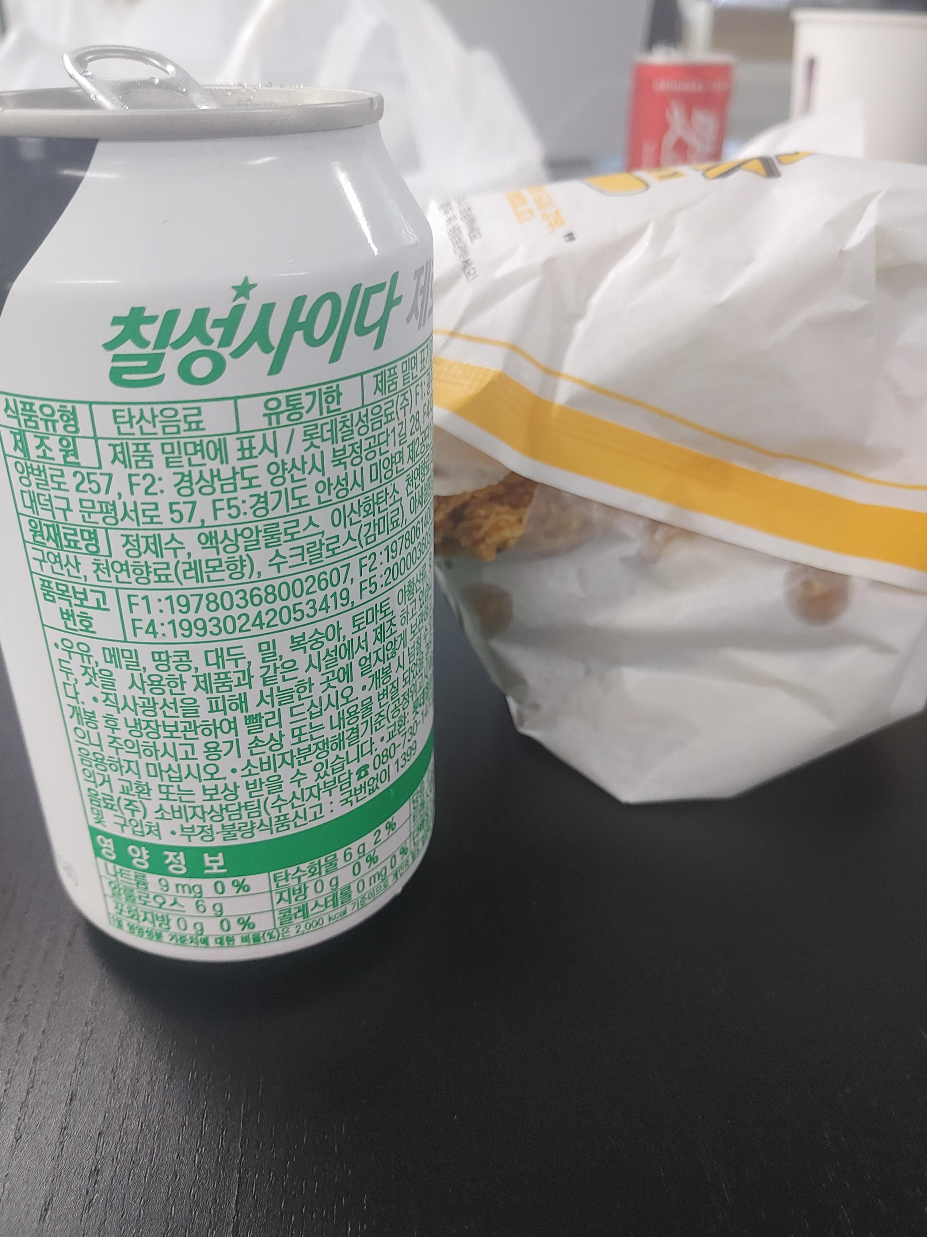 일단 싸이 플렉스 버거 사이즈는 싸이버거의 큰 닭패티가 2장이나 들어가 있어서 엄청 크더라구요. 보시면 뚱뚱한 사이다 캔만큼이나 높이가 있어서 두께가 상당했구요. 전체적인 크기도 엄청 크다는 느낌을 받았습니다. 개인적으로 4스택 버거와 같은 느낌 그 이상의 크기구나 하는 느낌이었습니다.