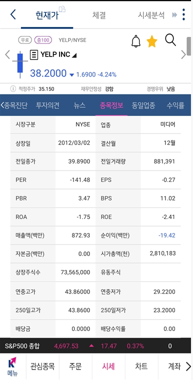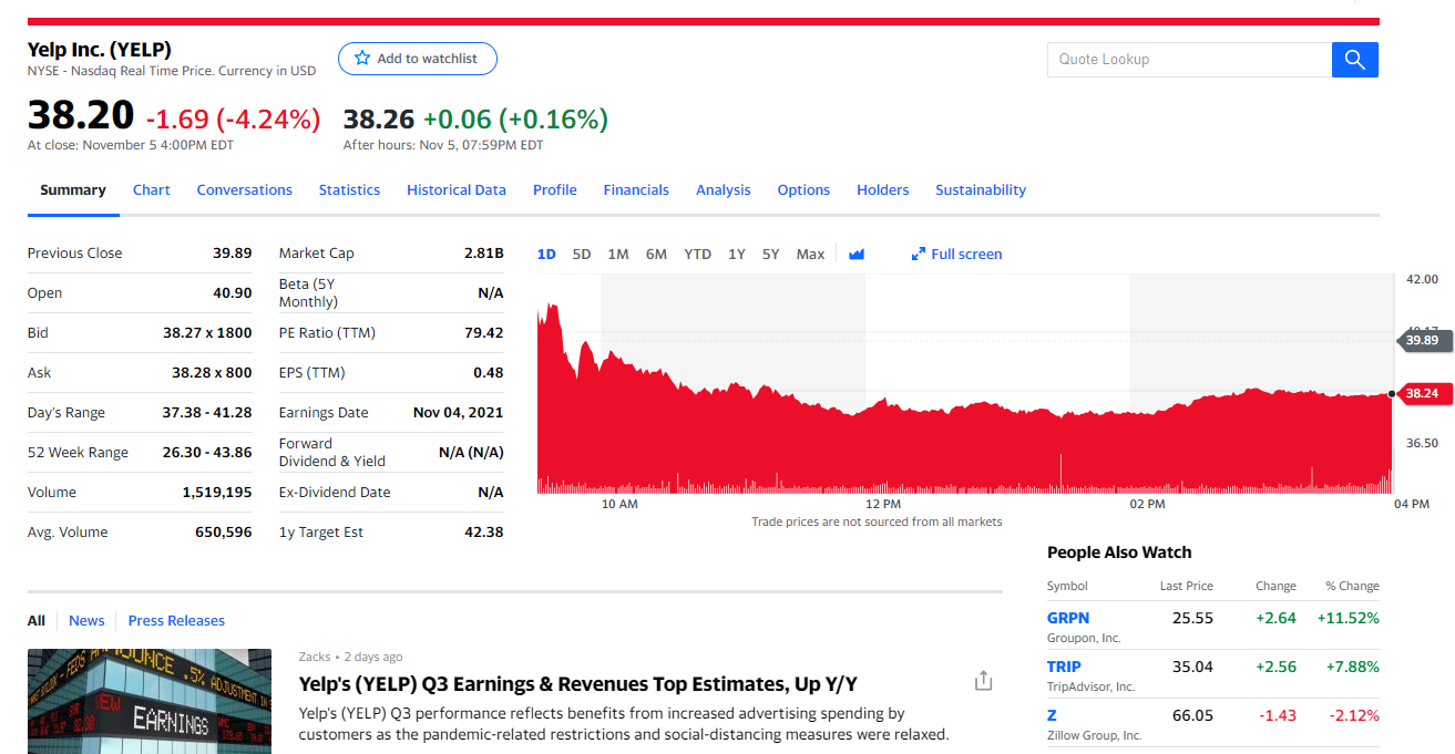 2. 옐프 Yelp Inc. 주가정보 (티커 : YELP)