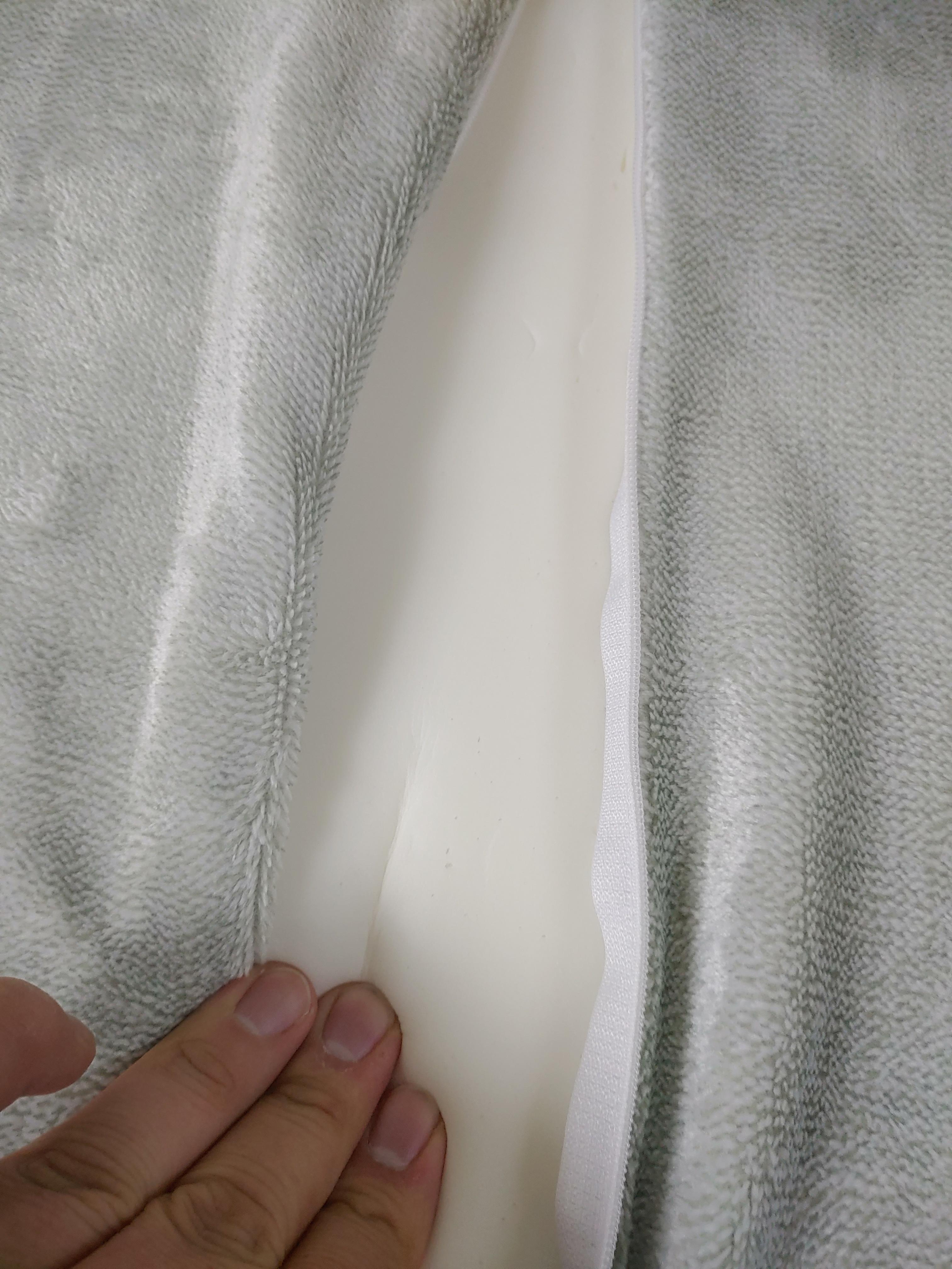 커버 아래에는 이렇게 메모리폼으로 되어 있는데요. 적당히 부드러운 느낌이에요. 생각보다 탄성이 좀 있어서 확 푹신푹신한 느낌은 아니고 적당한 딱딱함도 있는 듯하면서도 부드럽게 머리를 잡아주는 느낌이라고 해야될까요? 완전 푹신 푹 신은 아니라서 또 너무 딱딱도 아닌 딱 중간 정도 느낌이라고 보시면 될 것 같습니다.