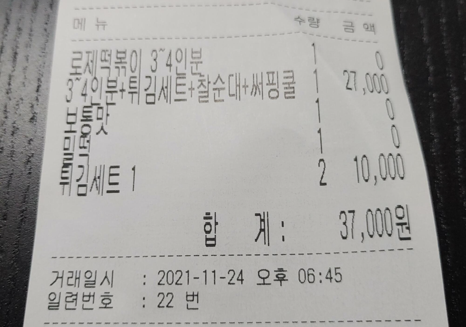 로제 떡볶이 3~4인분 세트가 27,000 원!! 왠만한 치킨보다 비싸더라구요... 튀김 추가를 했는데 1봉지에 5천원. 예전에 학교앞이나 시내의 포장마차등에서 파는 튀김들 생각하면 안될 정도로 가격이 엄청 비싸졌구나 생각도 들었구요. 배달음식이라 비싼 것도 이해는 하지만 가격대비 치킨이 차라리 나은 것 같다는 생각도 살짝 들기도 했습니다.