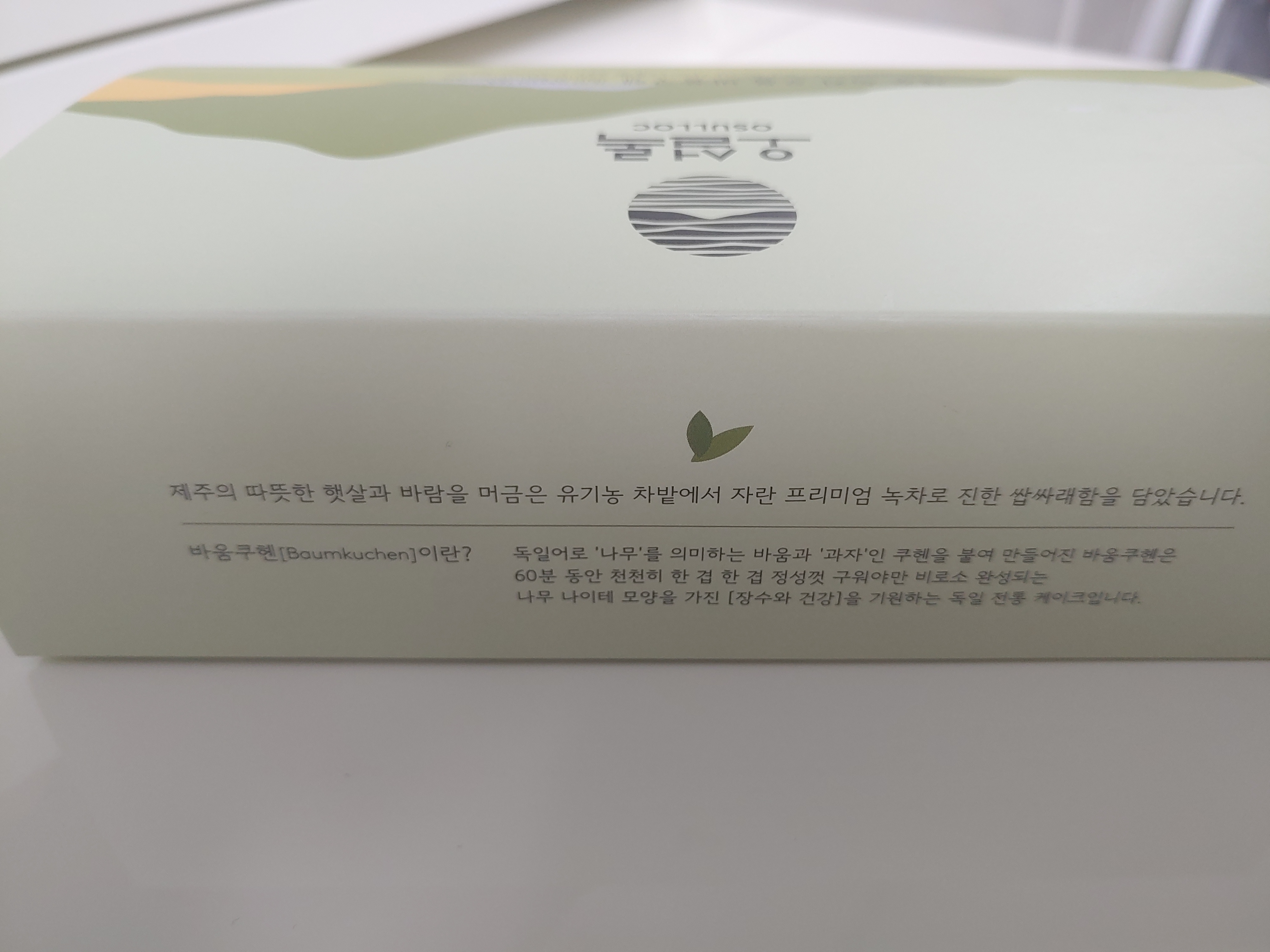 오설록도 제주에서 유명한 브랜드라고 알고만 있는 정도인데요. 이름이 신기 했어요. 제주 녹차 오름까지는 알겠는데 바움쿠헨은 뭔가 싶었는데요. 박스에 이렇게 설명이 되어 있더라구요.