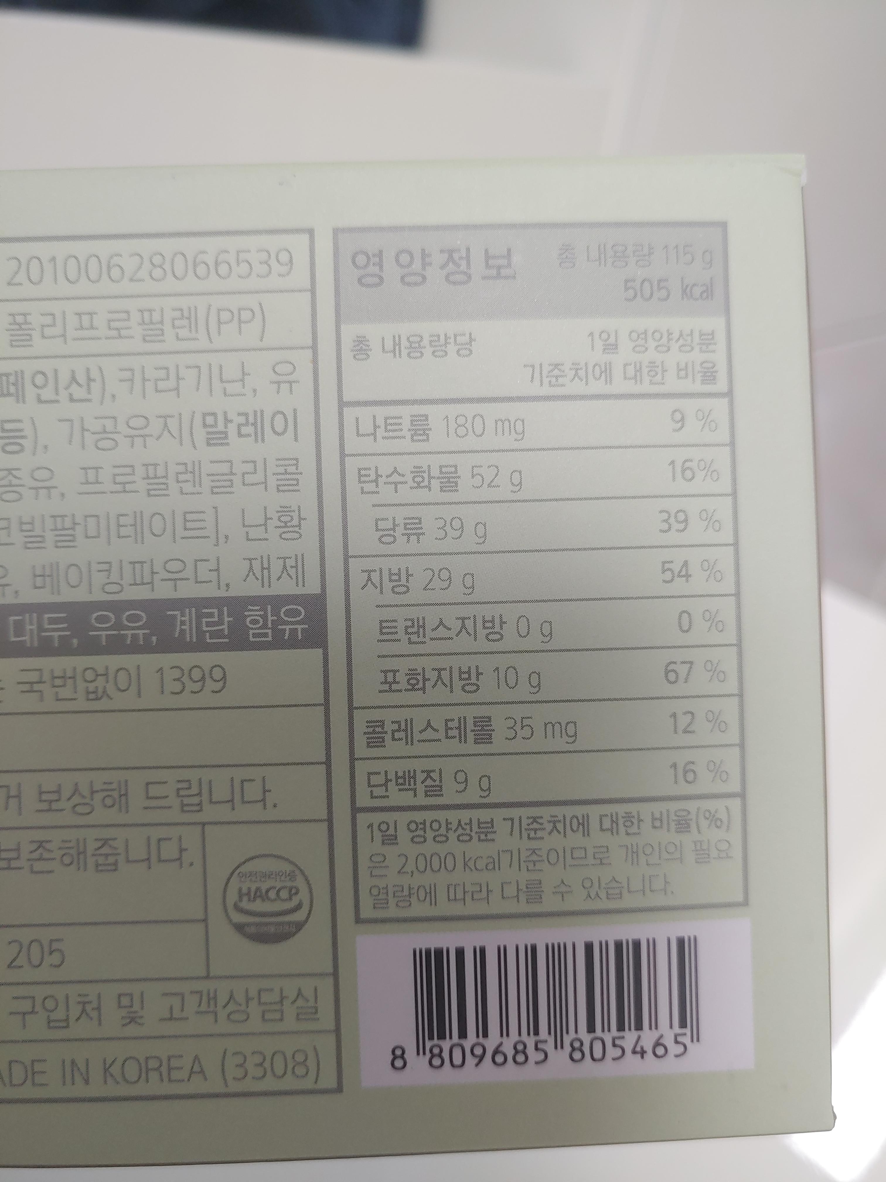 케이크 종류라고 보시면 되고, 총 내용량 115g에 505kcal 정도인데요. 케이크 치고는 딱 적당한 칼로리라고 할까요 ㅎㅎ 녹차가 들어 있는 것 같은데 이외에도 원재료에는 케이크에 들어가는 이것저것 많이 들어가 있기는 하더라구요.