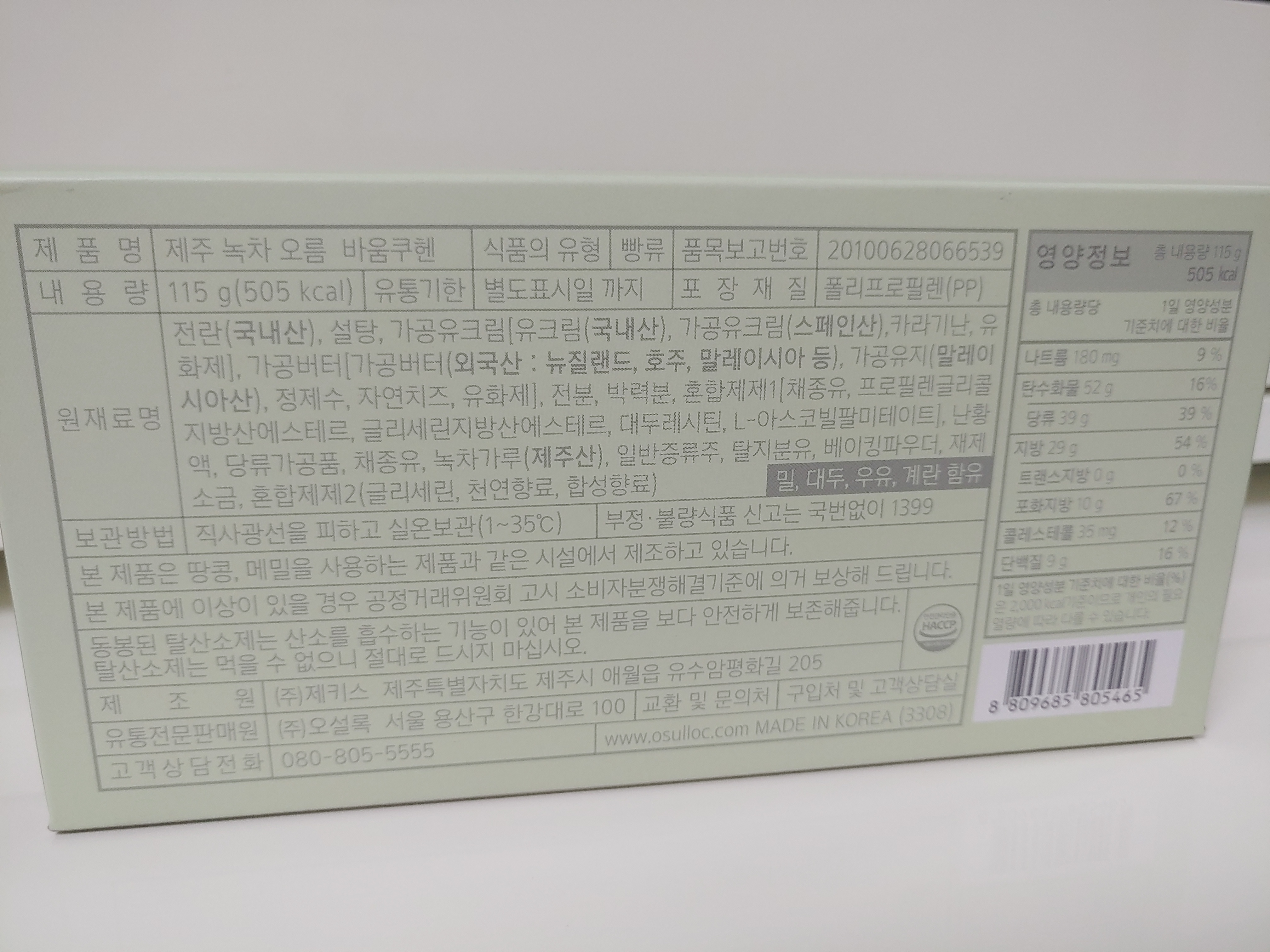 * 제주 녹차 오름 바움쿠헨 영양정보