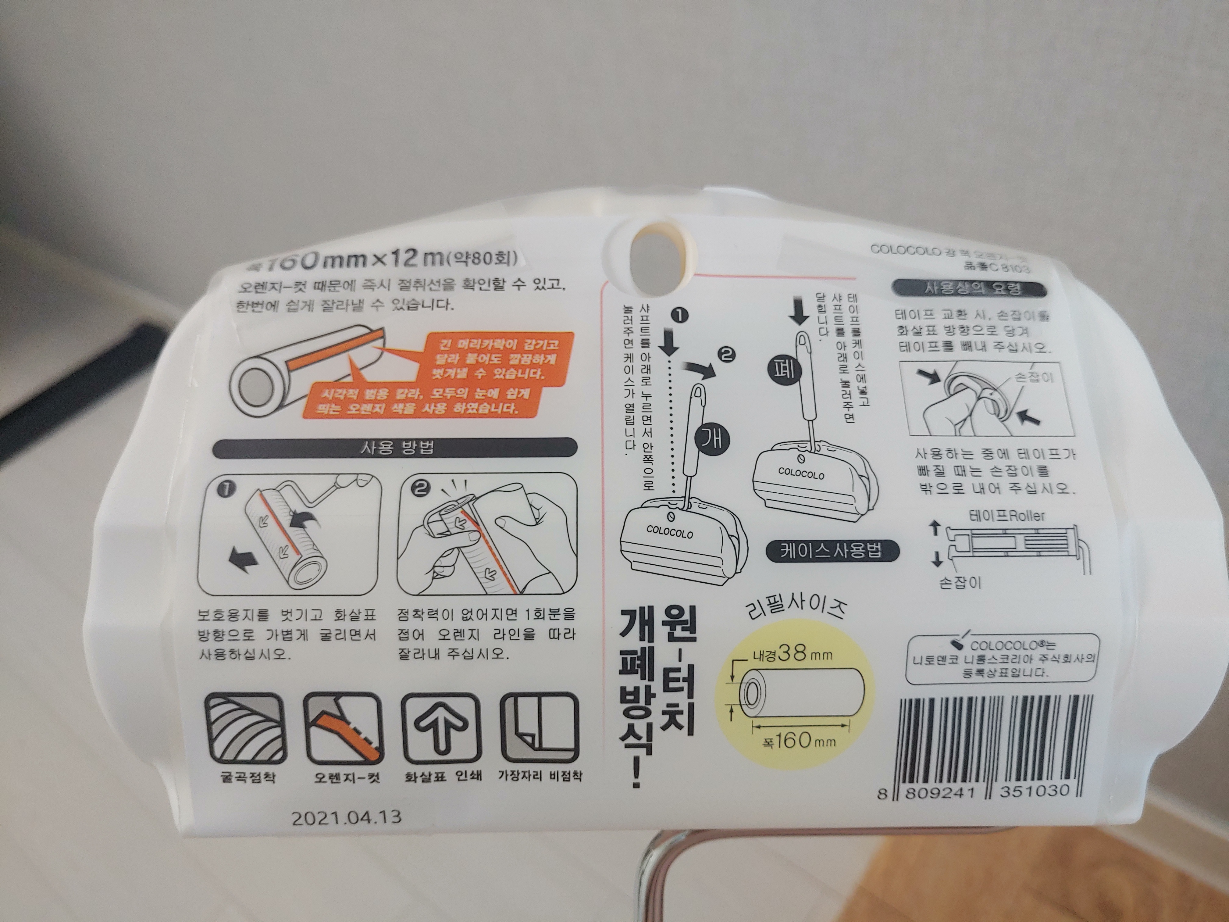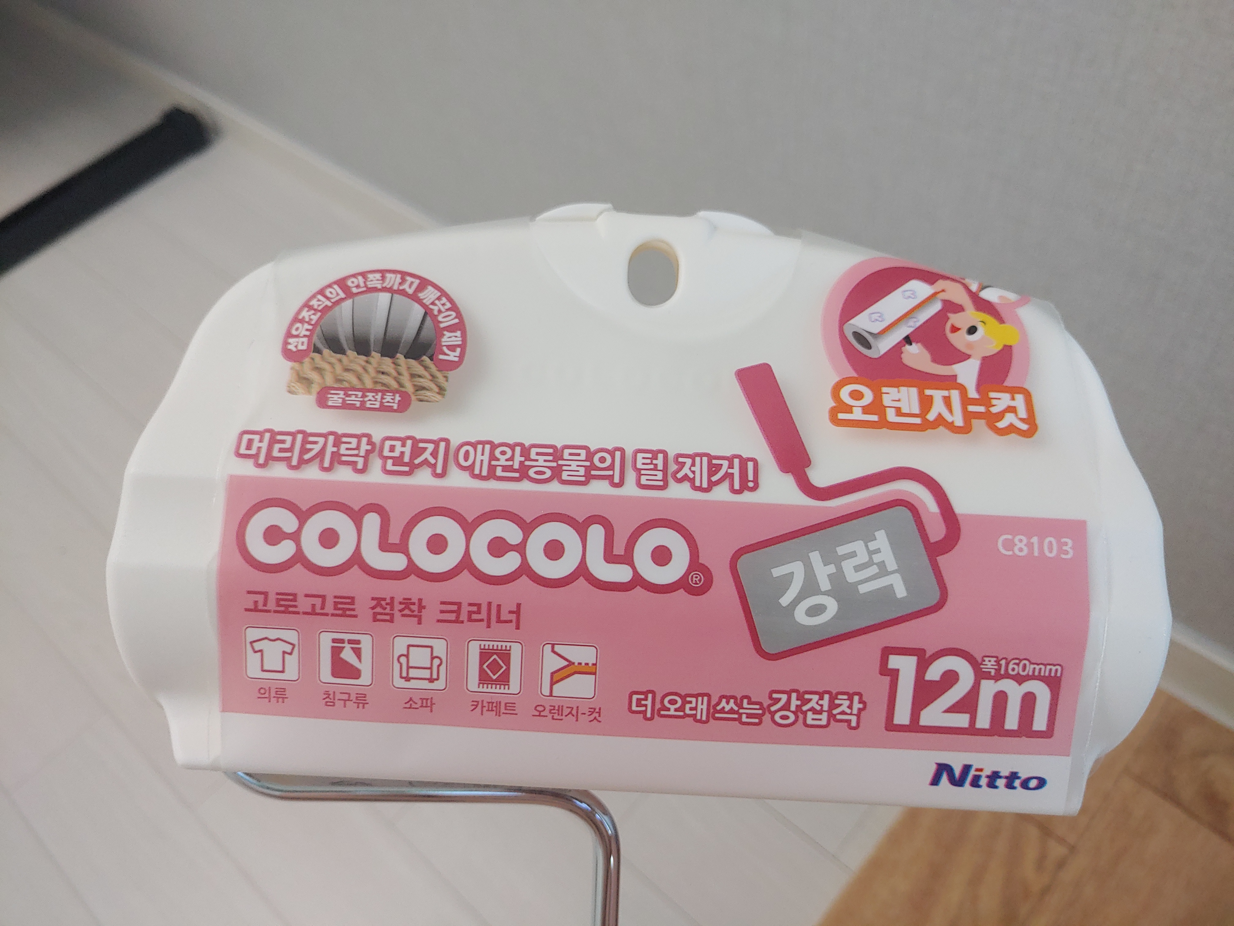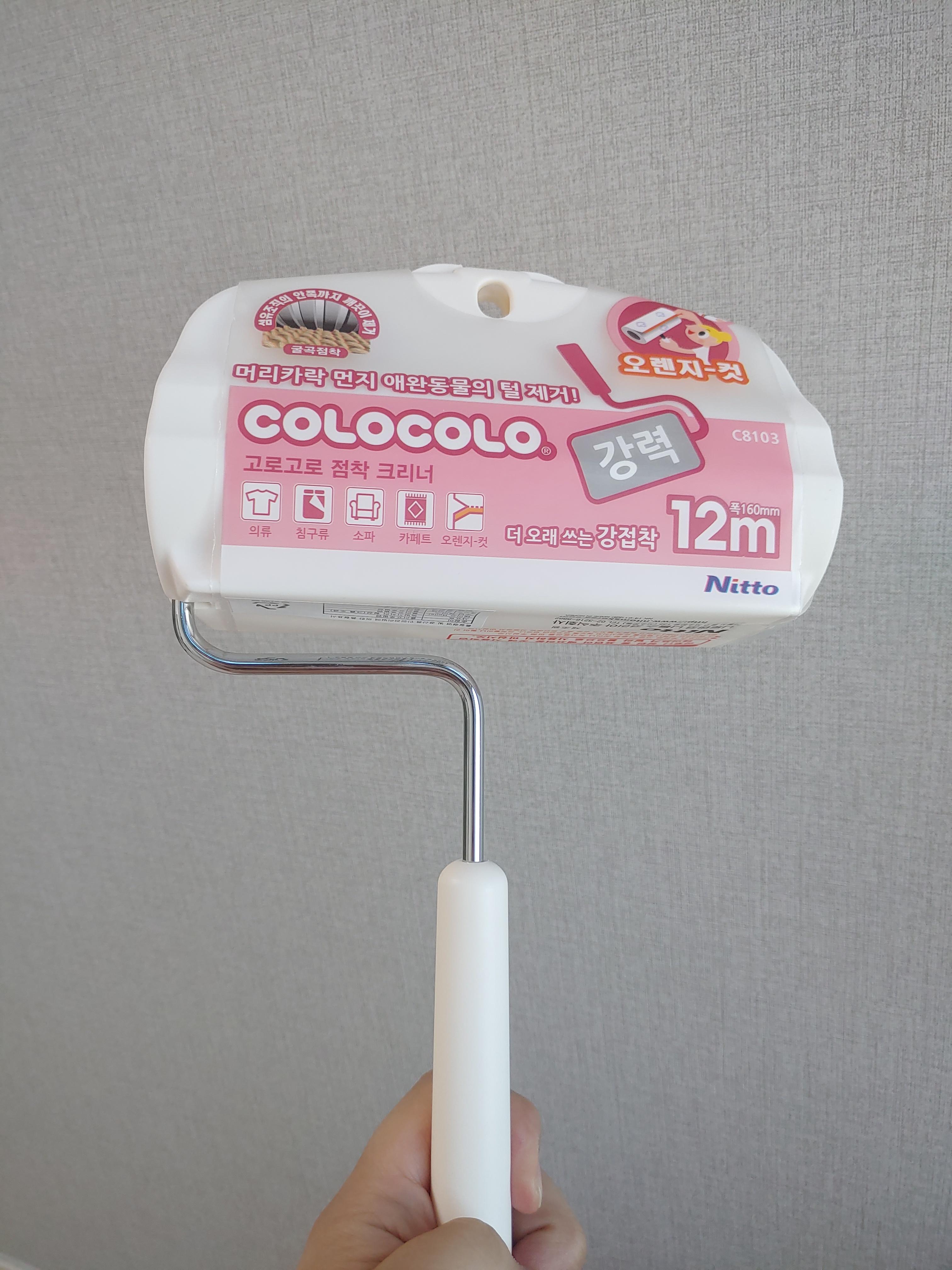 고로고로 점착 크리너 강력 버전인데요. 일단 예전에 쓰던 3M 제품에 비하면 폭이 넓어서 좋더라고요. 그리고 파란색 일반형에 비해서 오렌지 컷으로 중간에 컷 부분이 잘 되어 있는 것도 장점인 것 같았습니다. 이마트에 보니까 이것 말고 아예 본체가 길게 나온 것들도 있었는데 이게 딱 손에 맞아서 들고 왔습니다.