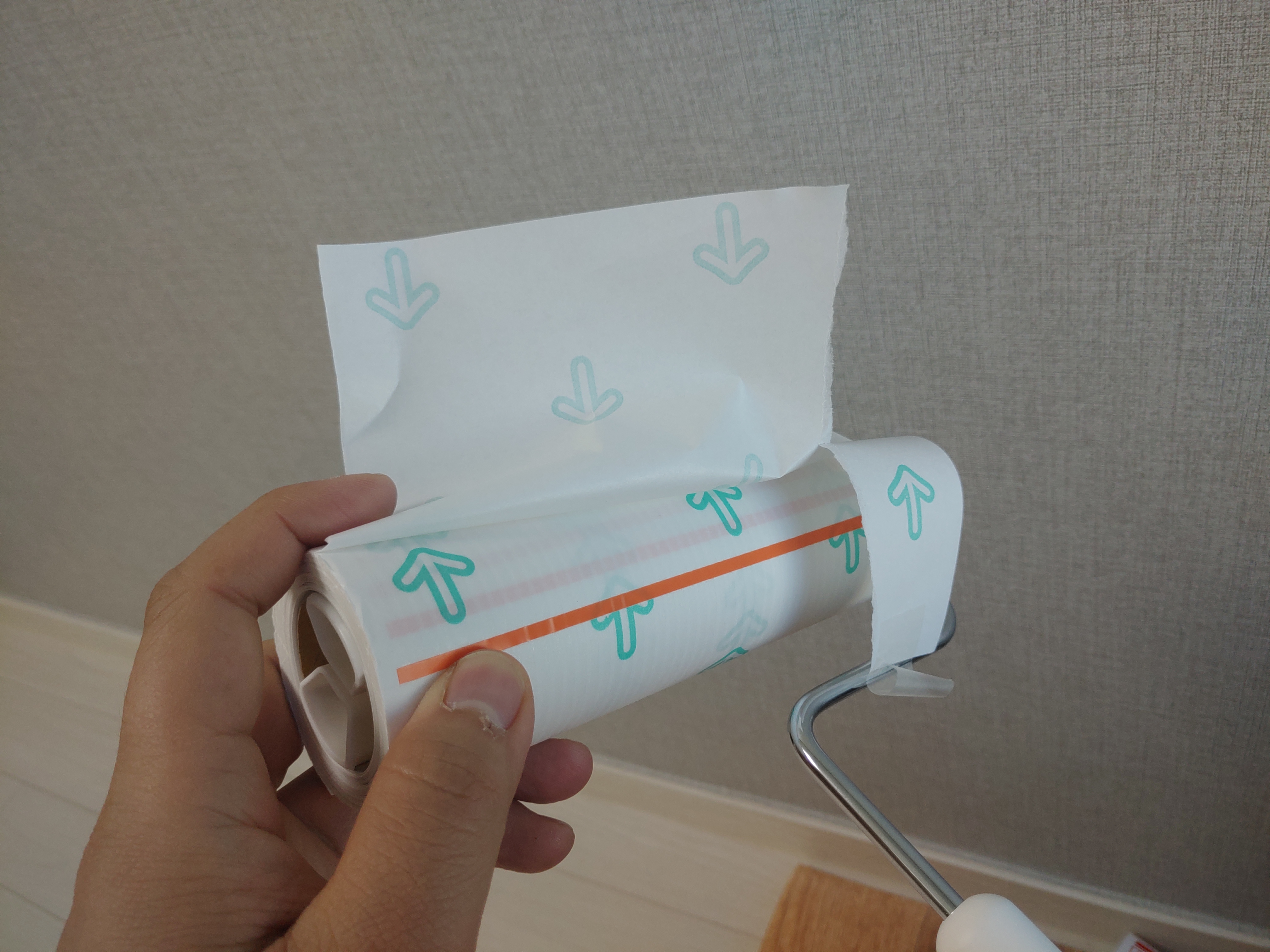 사용방법은 정말 간단합니다. 그냥 열면 끈끈이? 테이프? 이런 식으로 끈적한 테이프가 있고, 페인트 칠하듯이 바닥이나 의류를 밀어주면 먼지가 쏙쏙 끈끈이에 붙는 것을 확인할 수 있습니다.