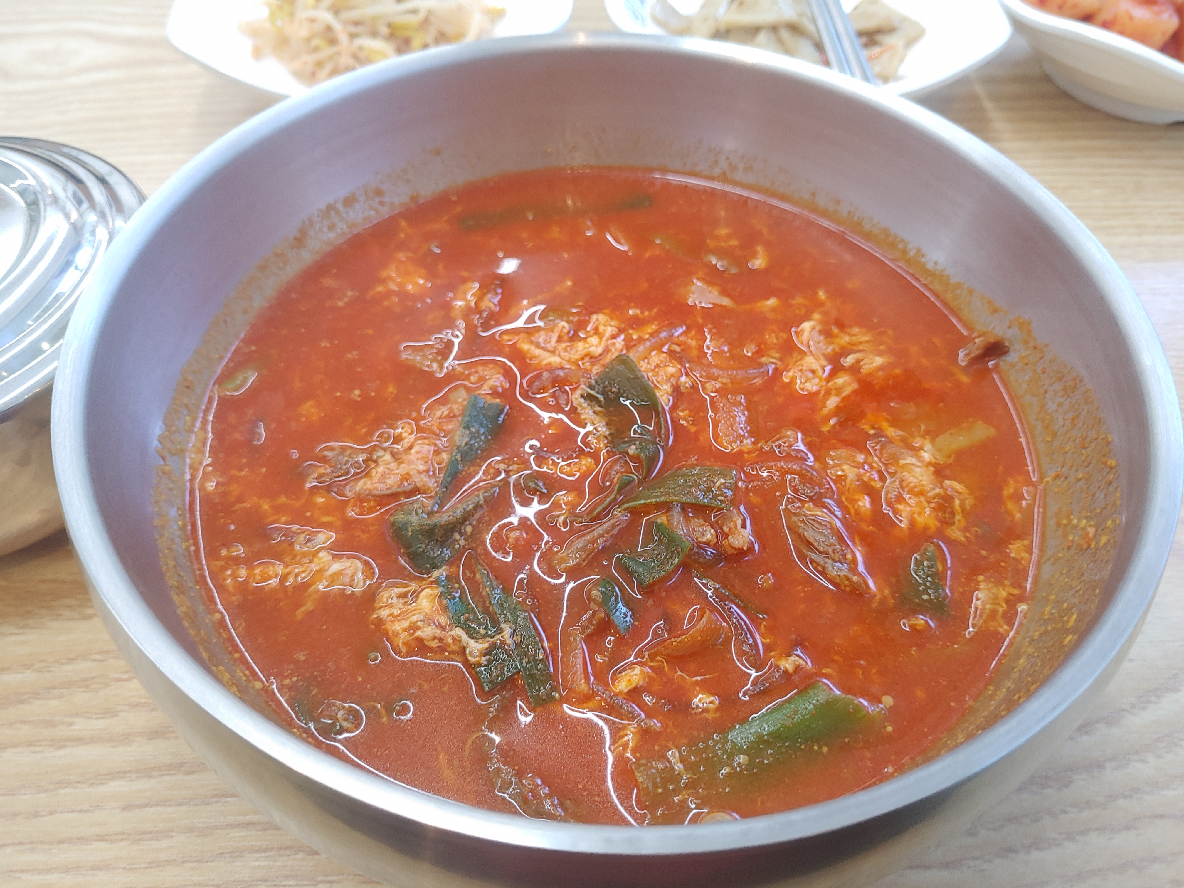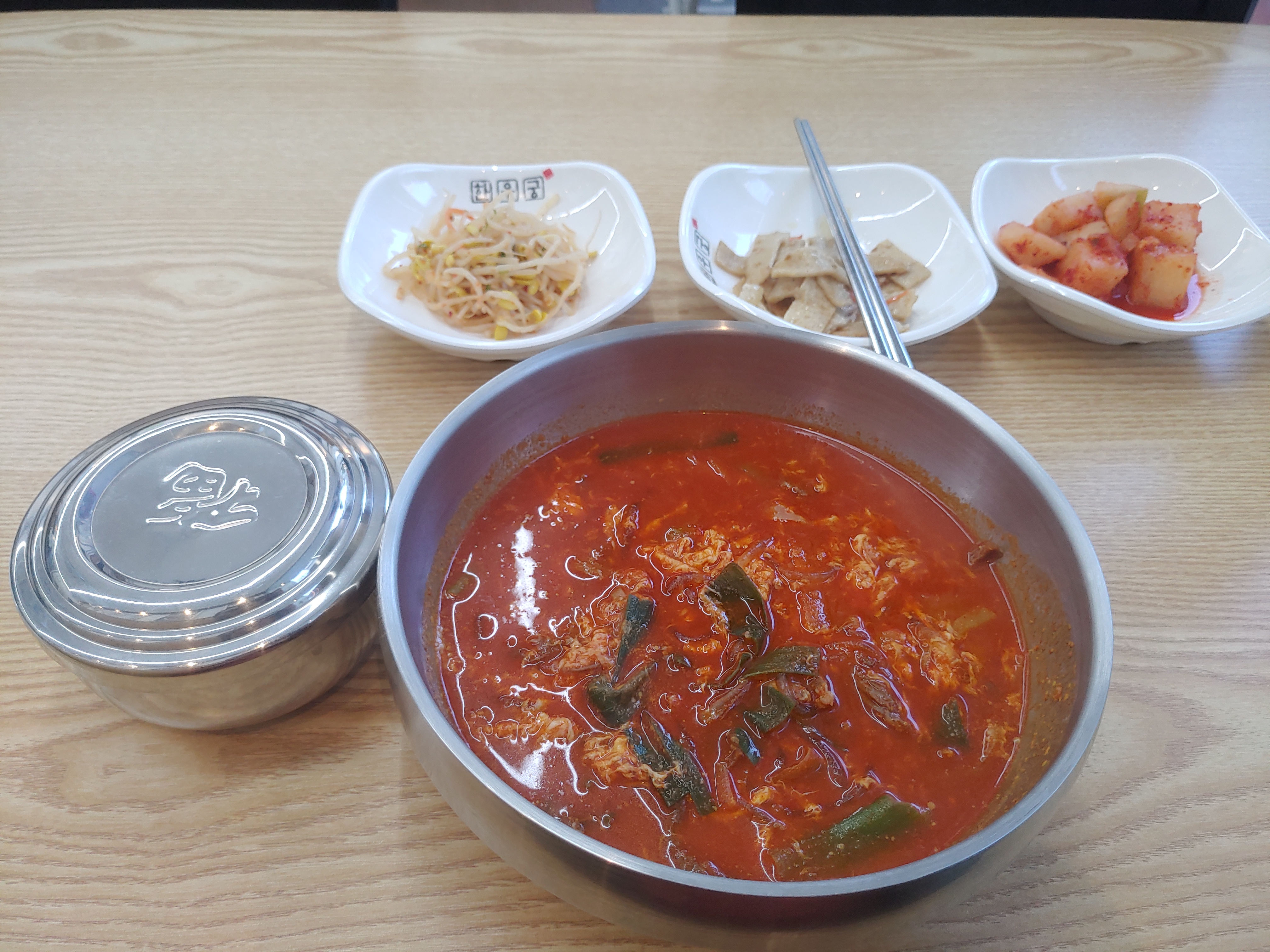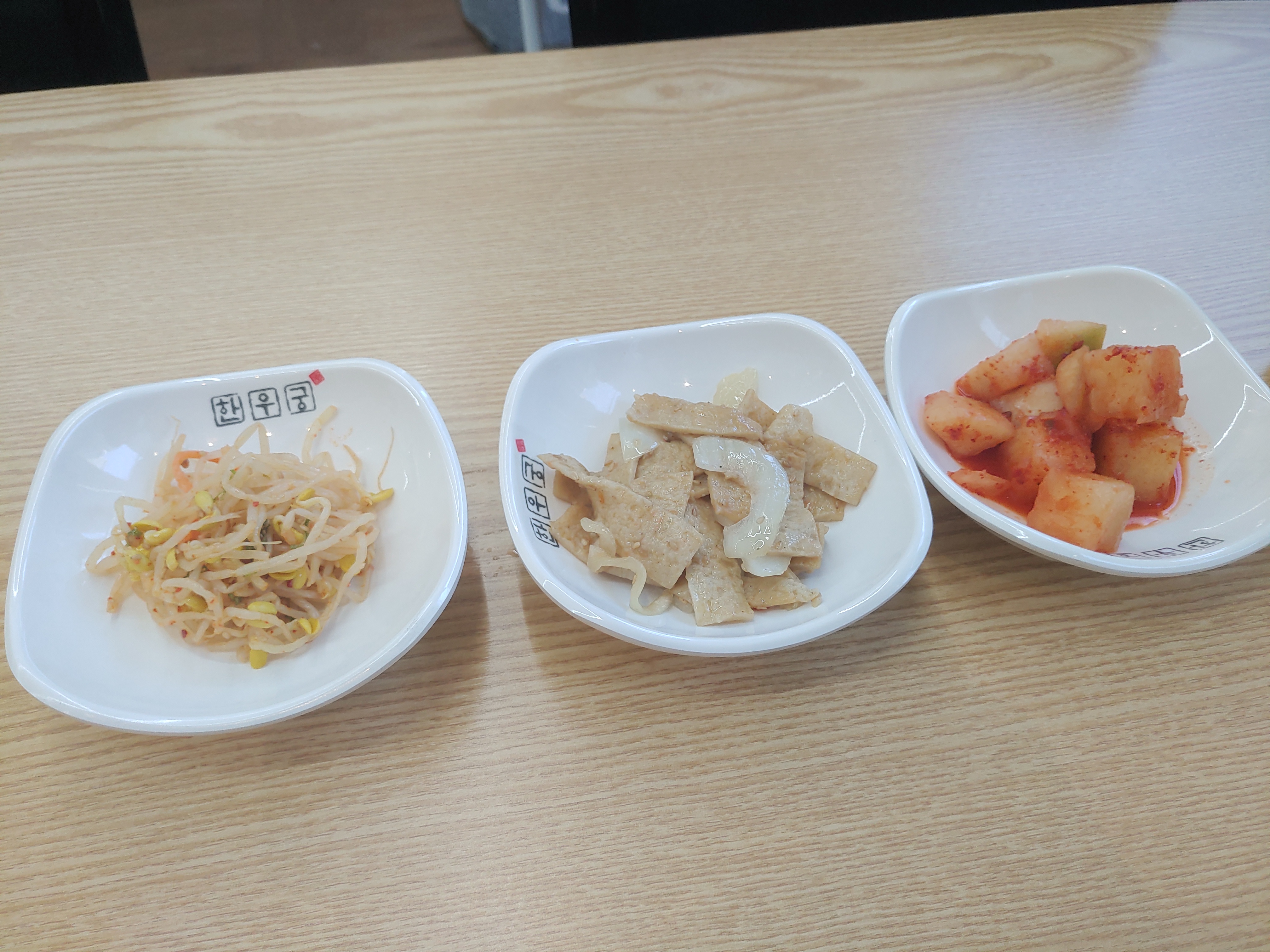 기본찬은 프랜차이즈라서 그런지 똑같이 나오더라구요. 육개장등 국밥의 영혼의 파트너 깍두기와 육개장의 매콤함을 덜어주는 최고의 반찬인 어묵 그리고 콩나물까지 이렇게 기본찬들이 나와요.