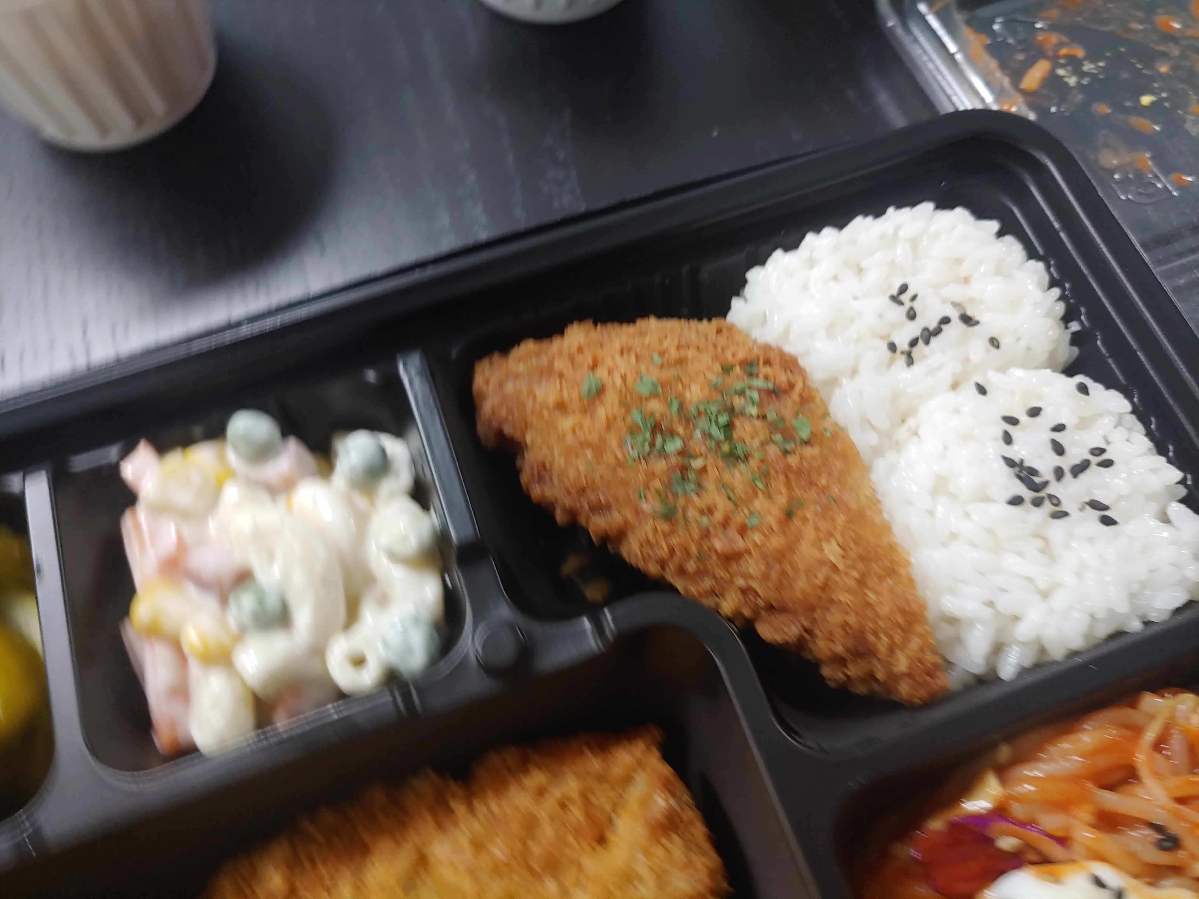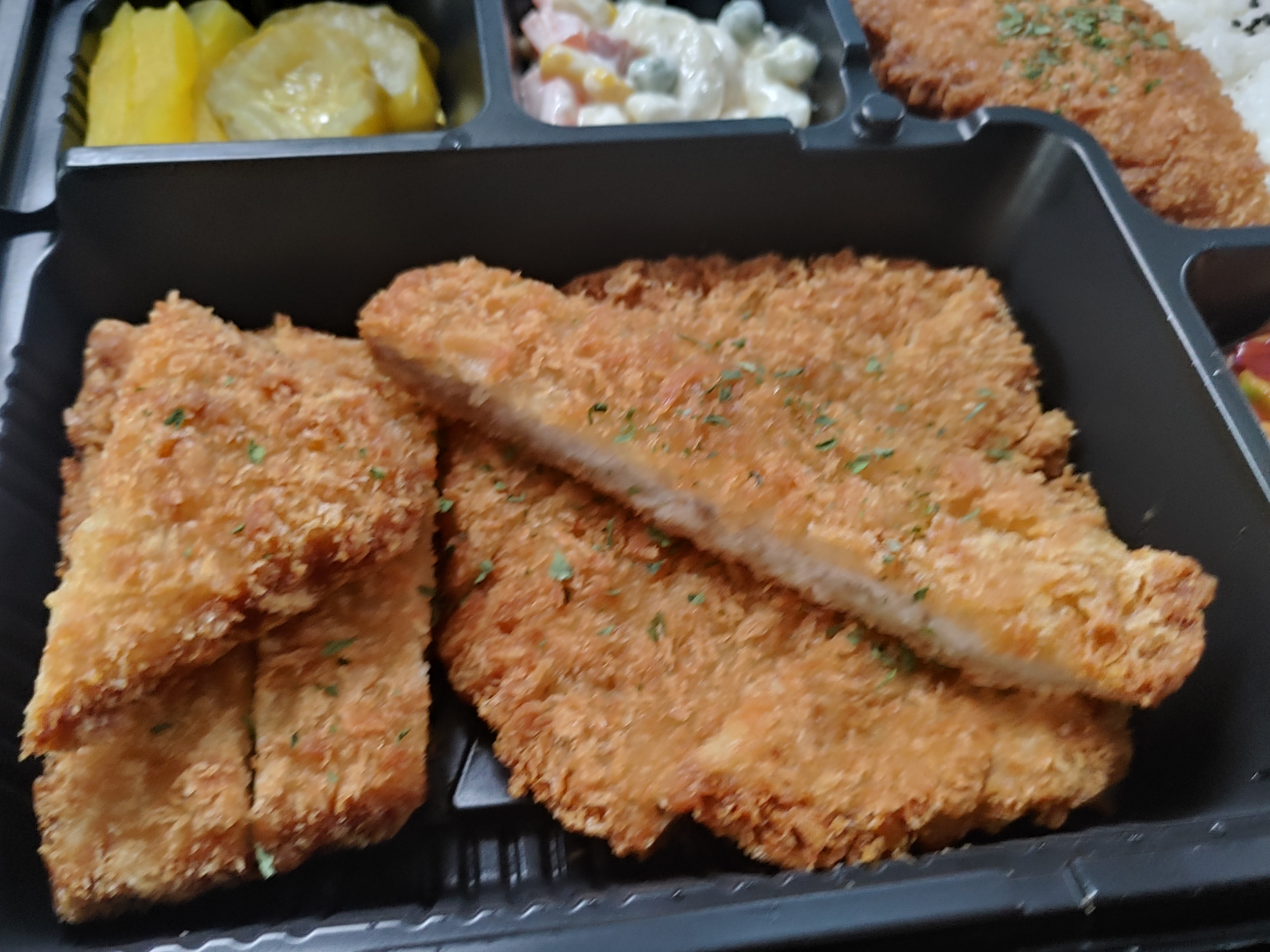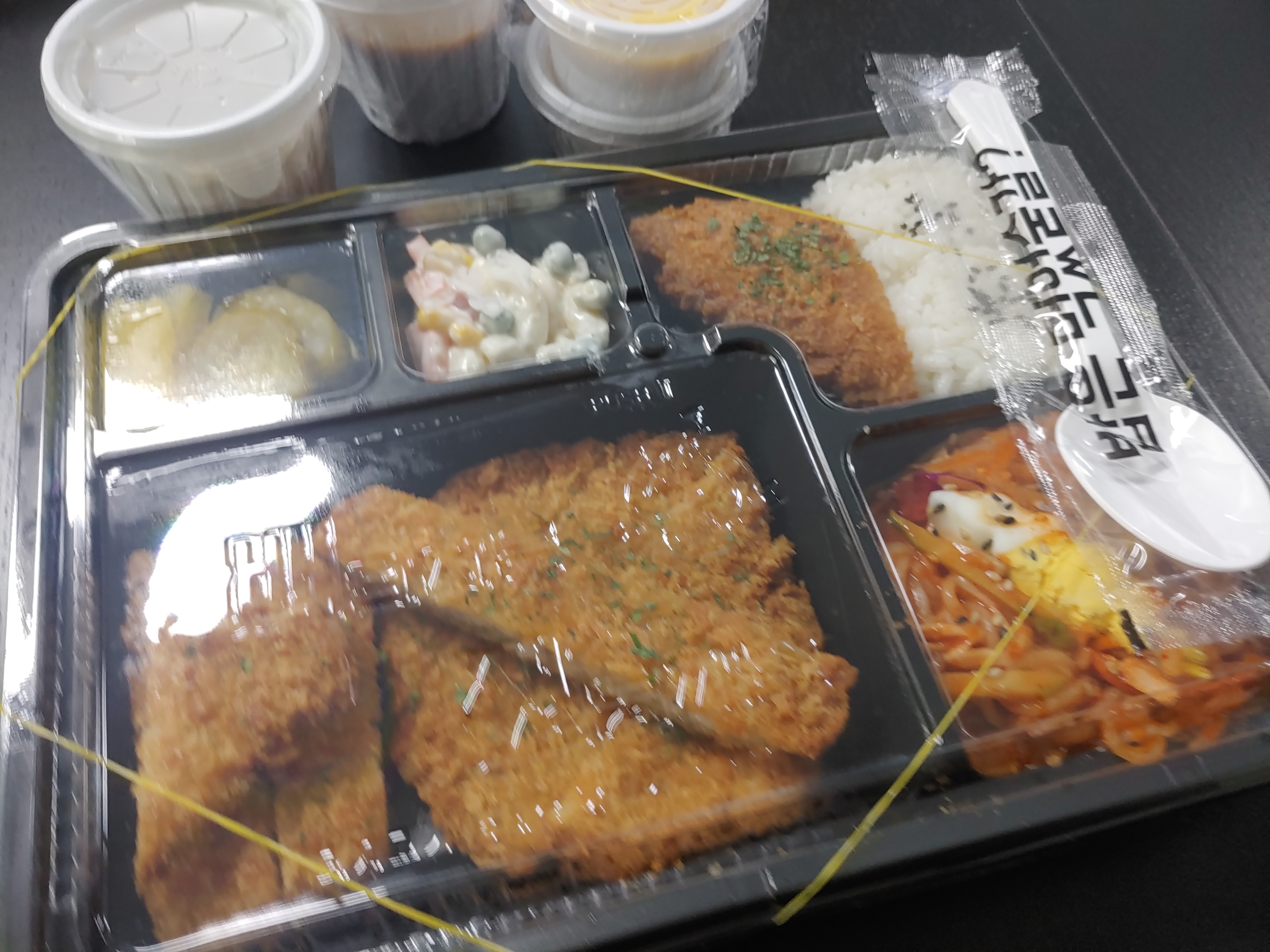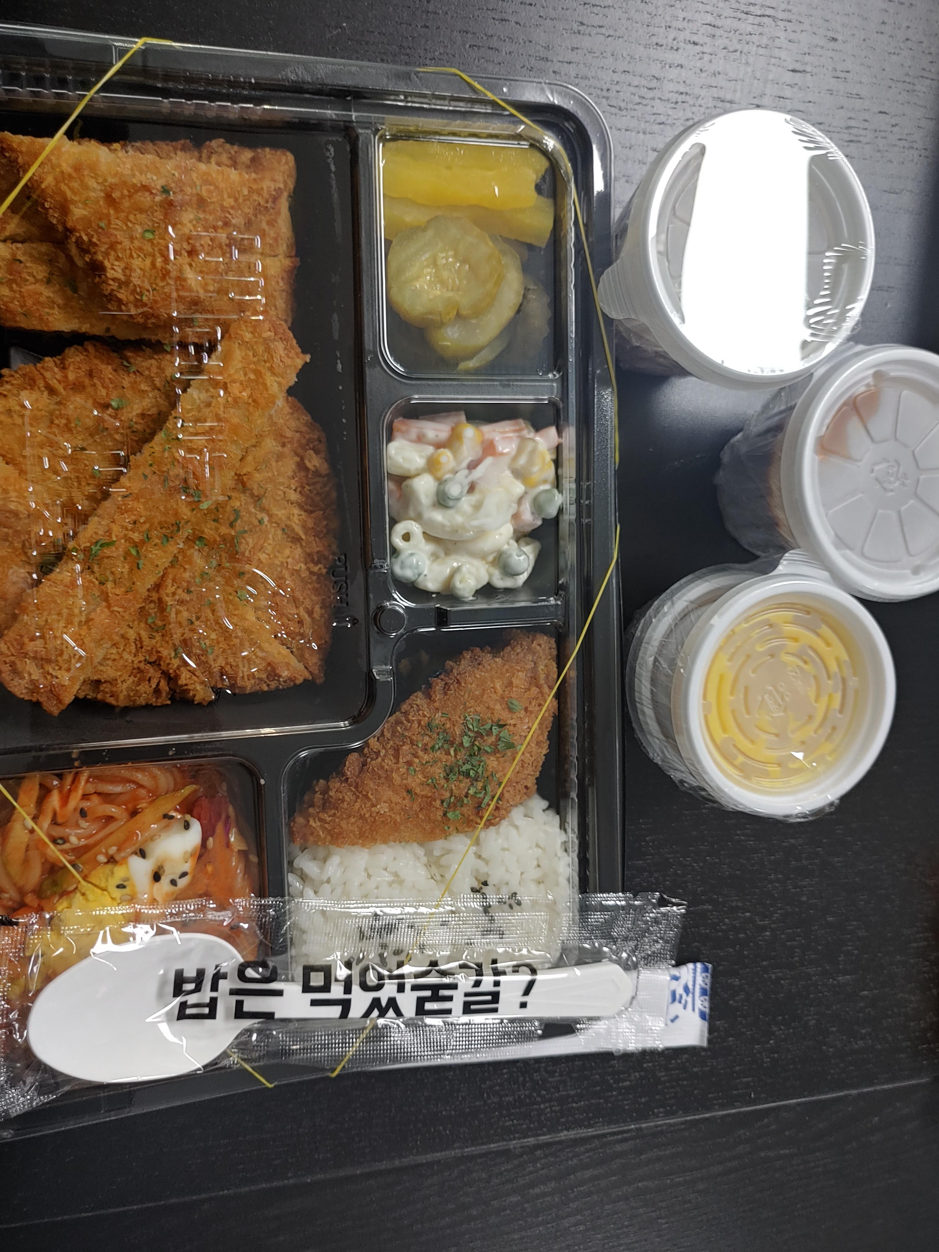 왜냐하면 돈까스 양도 꽤 되는 편이고, 상당히 두툼하구요. 그리고 생선까스와 도시락처럼 깔끔하게 나오더라구요. 그리고 좋았던 점은 소스가!! 소스가!! 엄청 나더라구요. 기본 돈까스 소스와 치킨소스와 잘 어울리는 머스타드 그리고 타르타르소스같은 생선 소스도 별도로 나왔는데요.