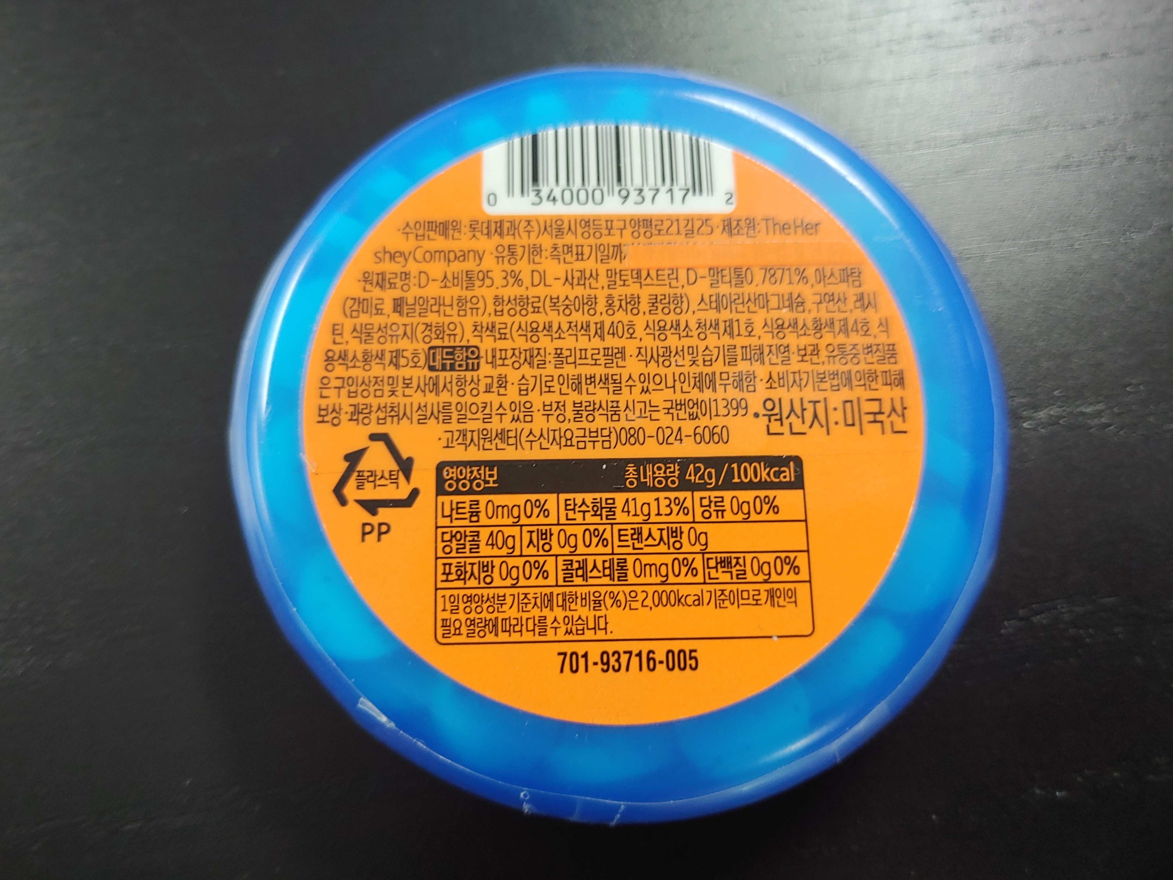 롯데제과에서 수입을 하여 판매를 하는 것 같고, 원산지가 미국이라고 적혀 있어요!! 그리고 무설탕 캔디인데 소르비톨(당알코올의 일종) 을 넣어서 많이 드시면 설사를 일으킬 수도 있다고 해요. 그래서 과량 섭취시 설사를 일으킬 수 있음이라고 적혀 있어요.