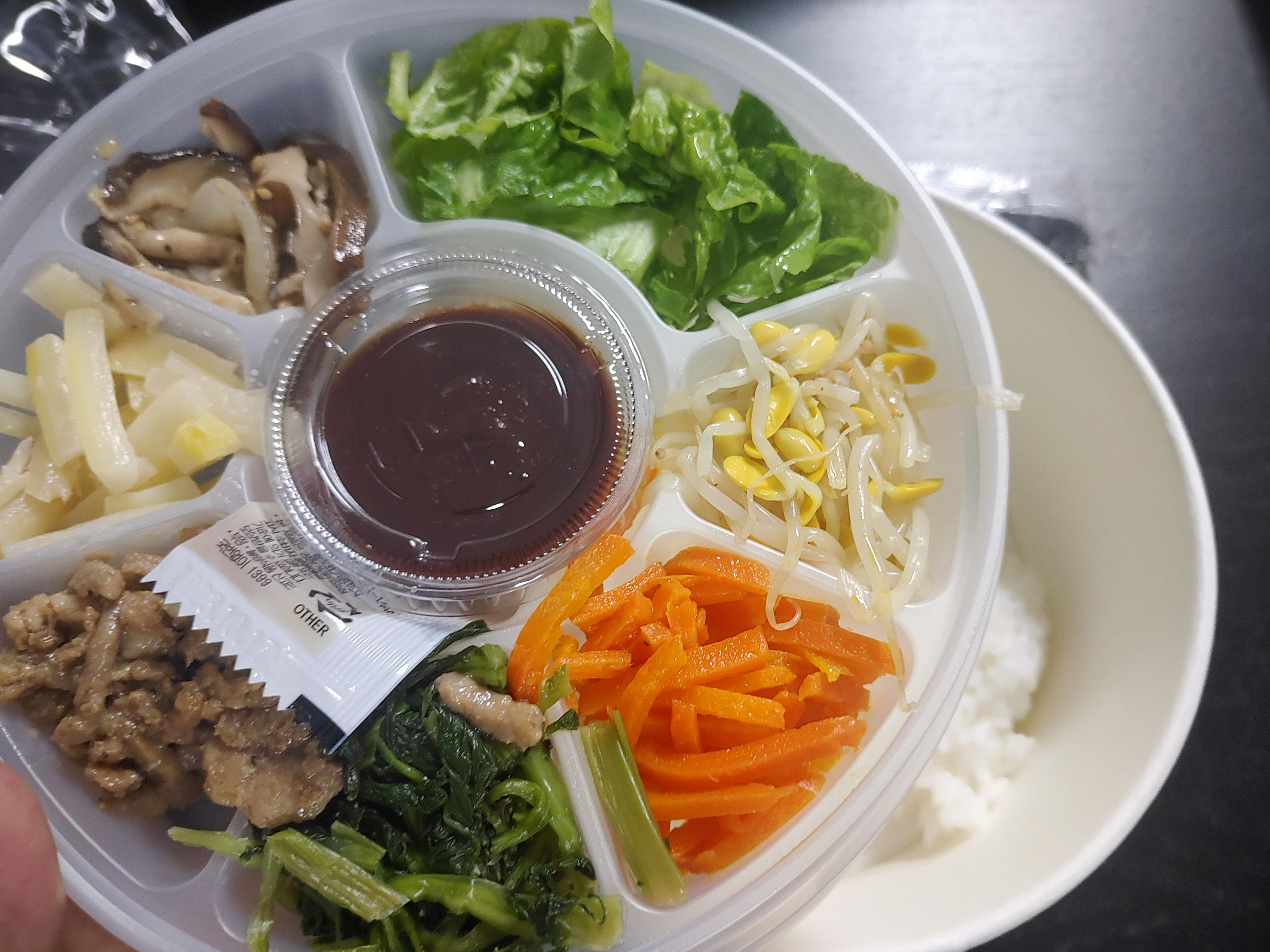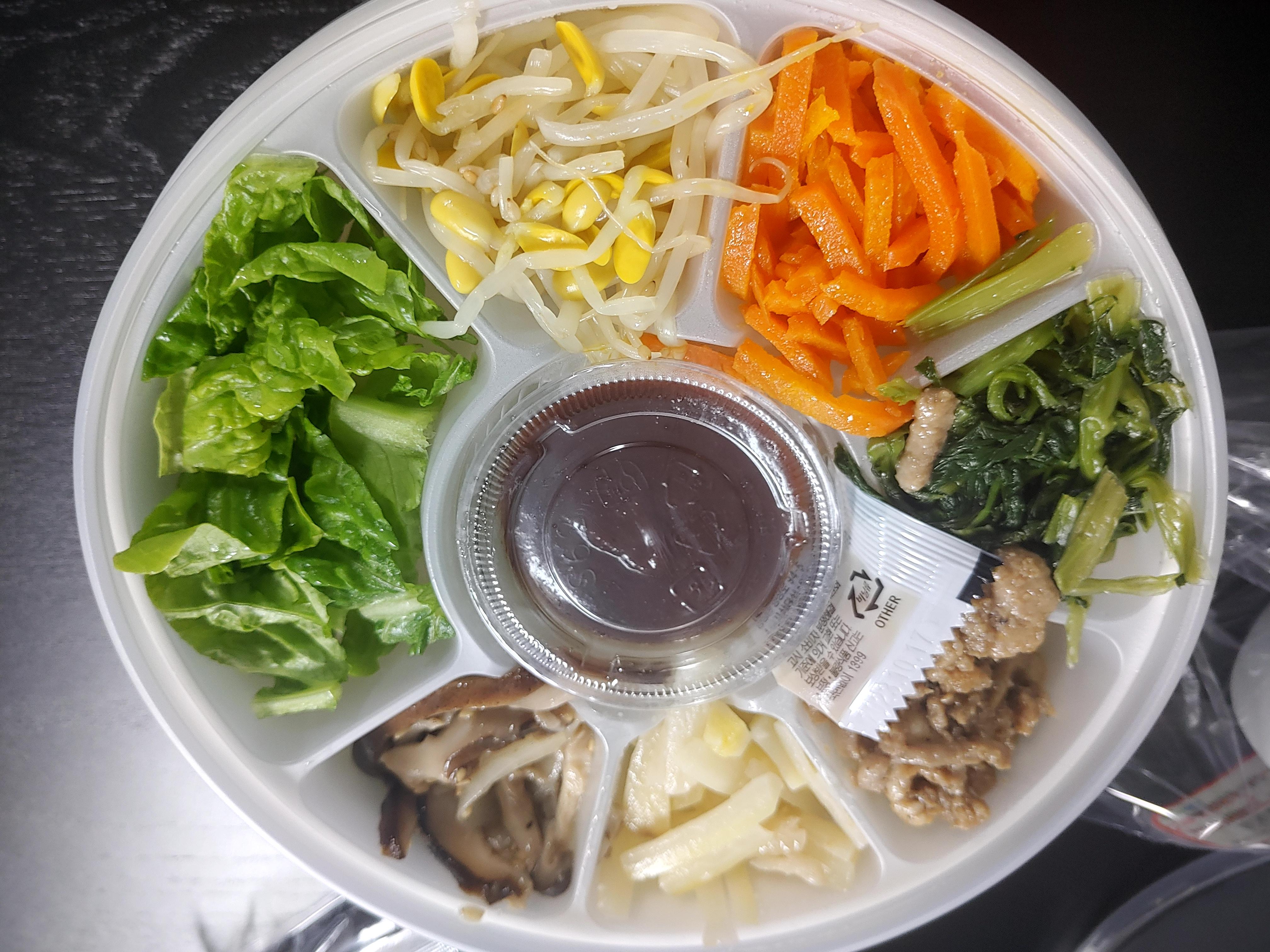 그리고 비빔밥의 재료들~ 야채와 나물들 그리고 고기까지 굉장히 다양하다고 느껴졌는데요. 고추장과 참기름까지 센스있게 들어가 있어서 비빔밥 재료로는 정말 좋아보였어요.