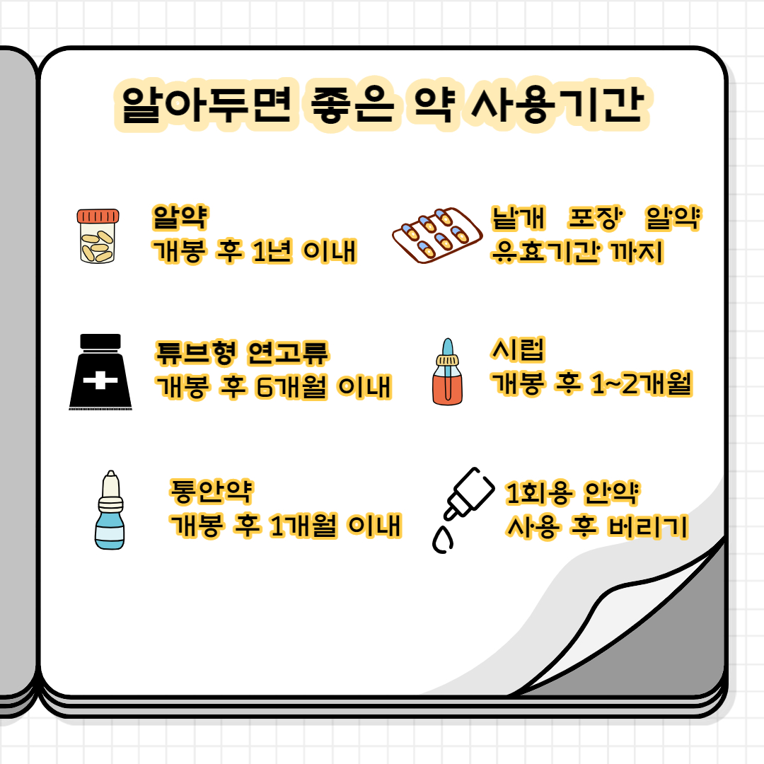 약 사용기한에 대해서는 제약회사에서 정한 유통기한이 있지만 실제로 약국에서 약을 처방하거나, 약을 사는 순간까지 기한이 있기 때문에 약의 유통기한을 잘 살펴보아야 하는데요. 약의 종류에 따라, 또한 약이 공기중에 접촉되는 경우에는 성질이 변하기 쉬워지기 때문에 각각의 상황에 따라서 약의 사용기한을 잘 생각하셔서 약을 사용해야 합니다.