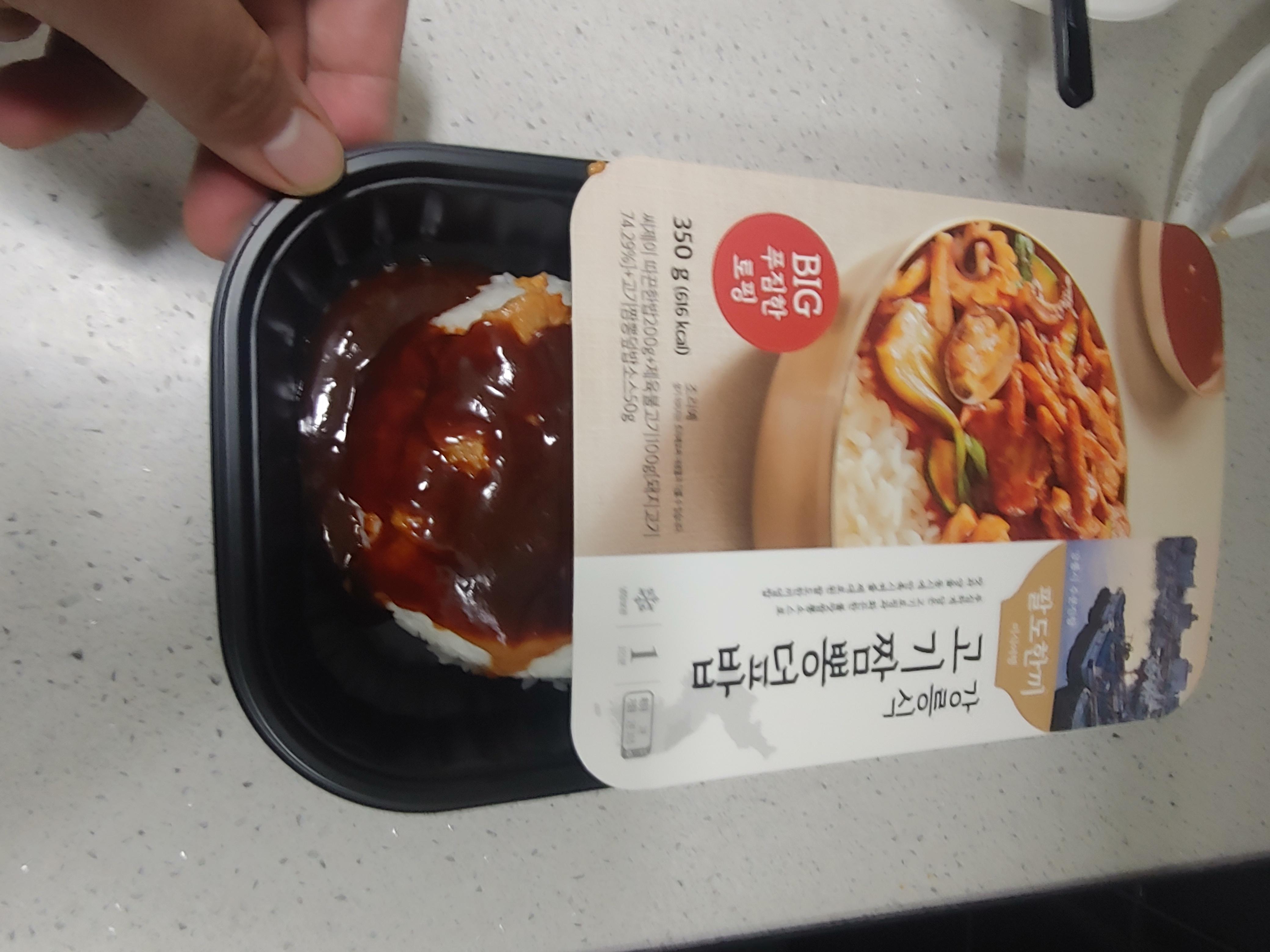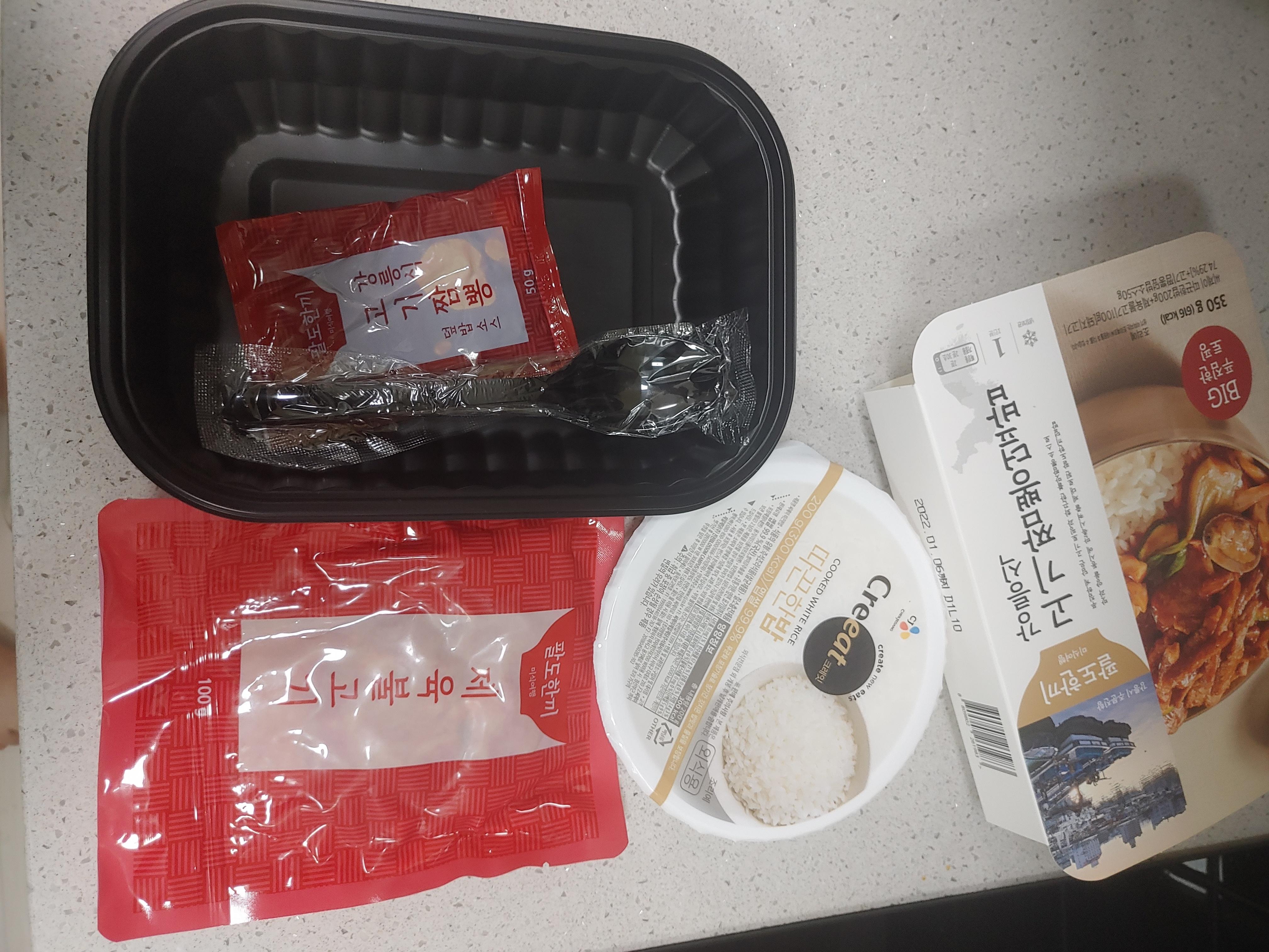 내용물은 써진 그래도 CJ 따끈한밥과 제육불고기 그리고 고기짬뽕덮밥소스만 딱 있더라구요. 국물이 있는데 아니라 고기덮밥에 짬뽕소스를 더한 스타일이라고 보시면 될 것 같습니다.