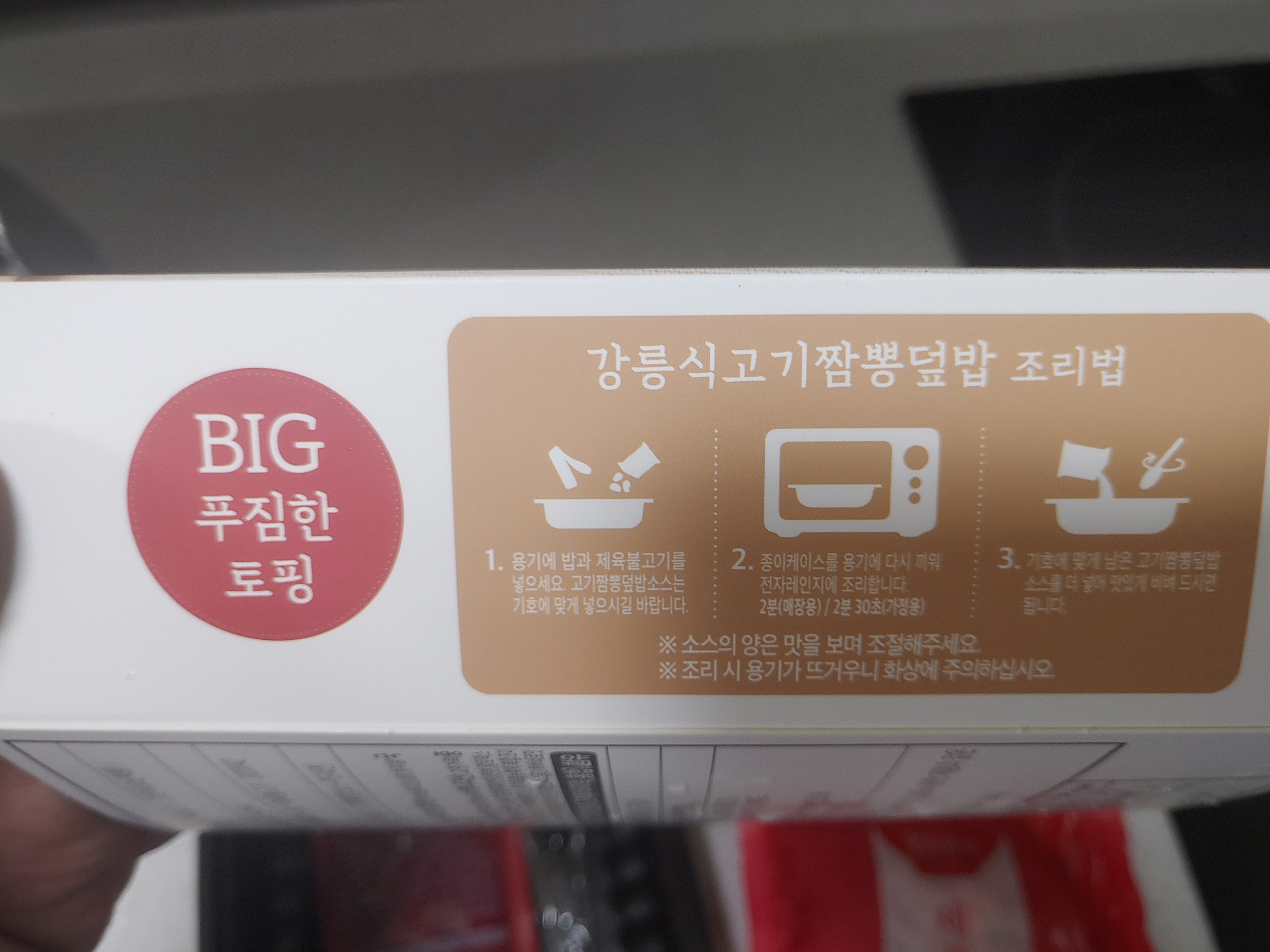 편의점 간편식 강릉식 고기짬뽕덮밥의 조리법은 상당히 간단해요. 아무래도 간편식이다보니 그냥 포장 열고 전자레인지에 돌려주면 끝이에요 ㅋ 2분에서 ~ 2분30초정도 돌려달라고 하는데, 저는 약간 더 돌린 것 같구요. 조리방법 자체는 정말 엄청나게 쉽죠!!