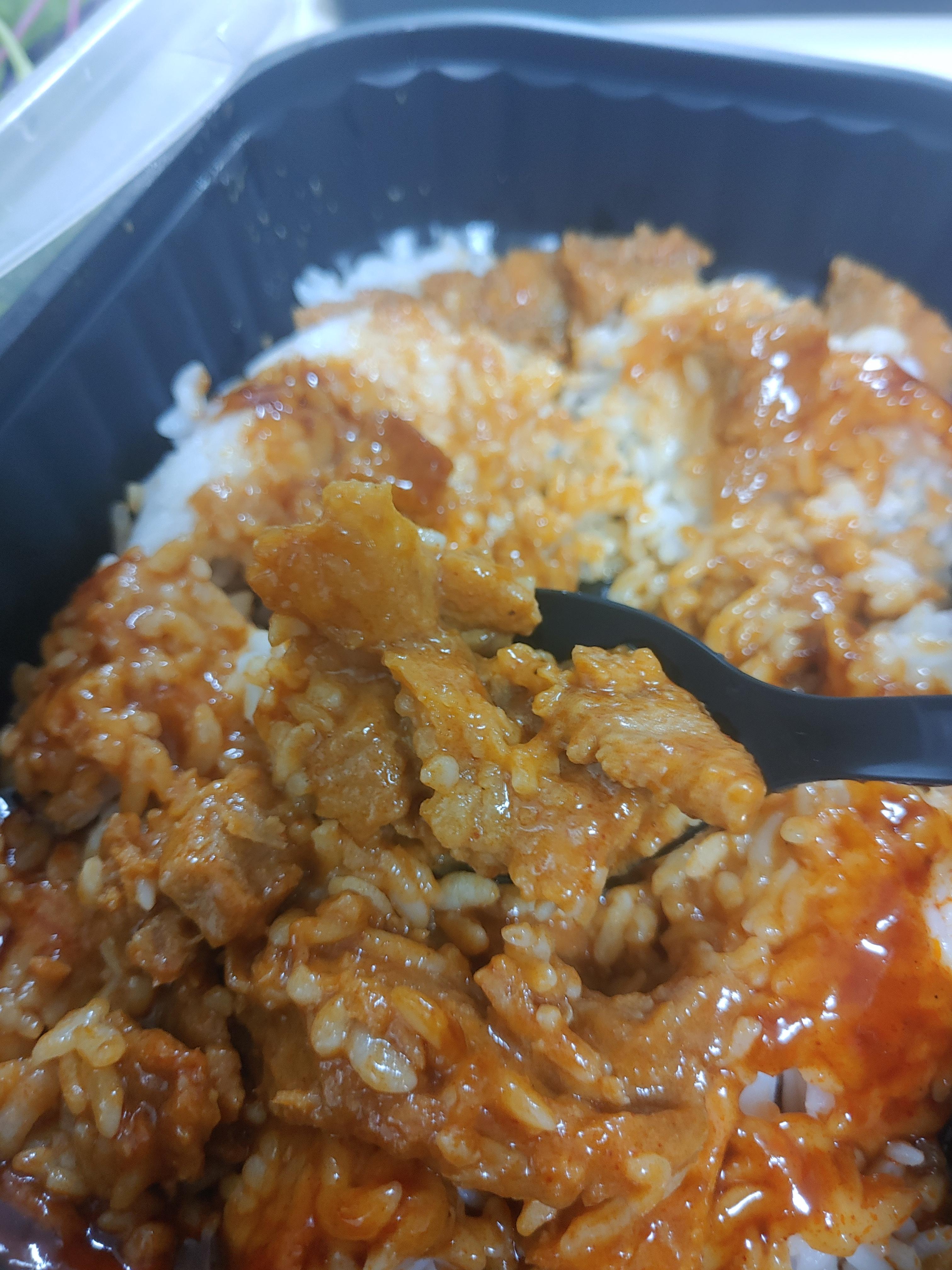 처음에는 그냥 간편식이라 고기 조금에 밥에 양념소스하나 얹어서 먹는정도로 큰 기대를 안했는데요!! 이게 상당히 맛은 괜찮더구요. 제육불고기의 고기들도 상당히 있는데, 여기에 짬뽕소스라는게 올라가니까 상당히 불맛이 느껴지는 특색있는 맛이 되었다고 할까요? 상당히 조합 자체가 잘 어울려서 신기했어요.