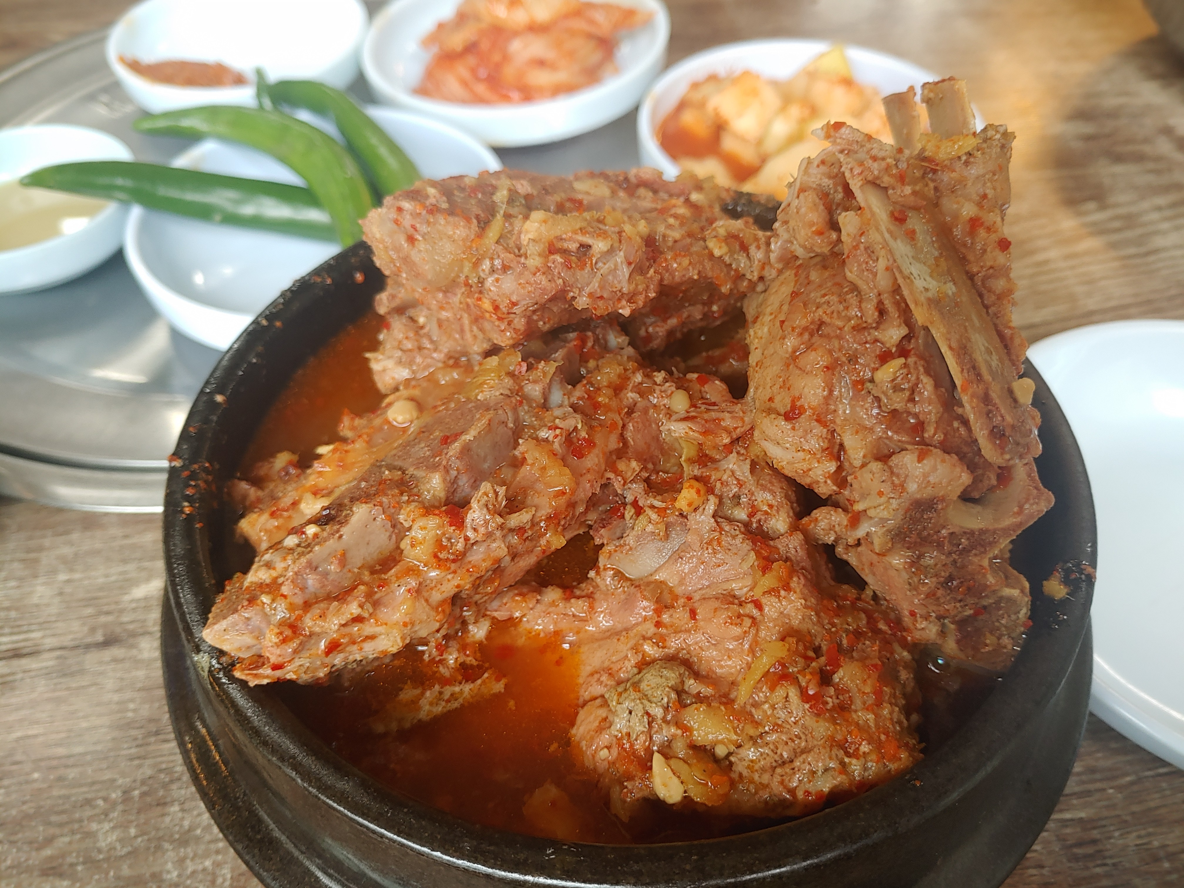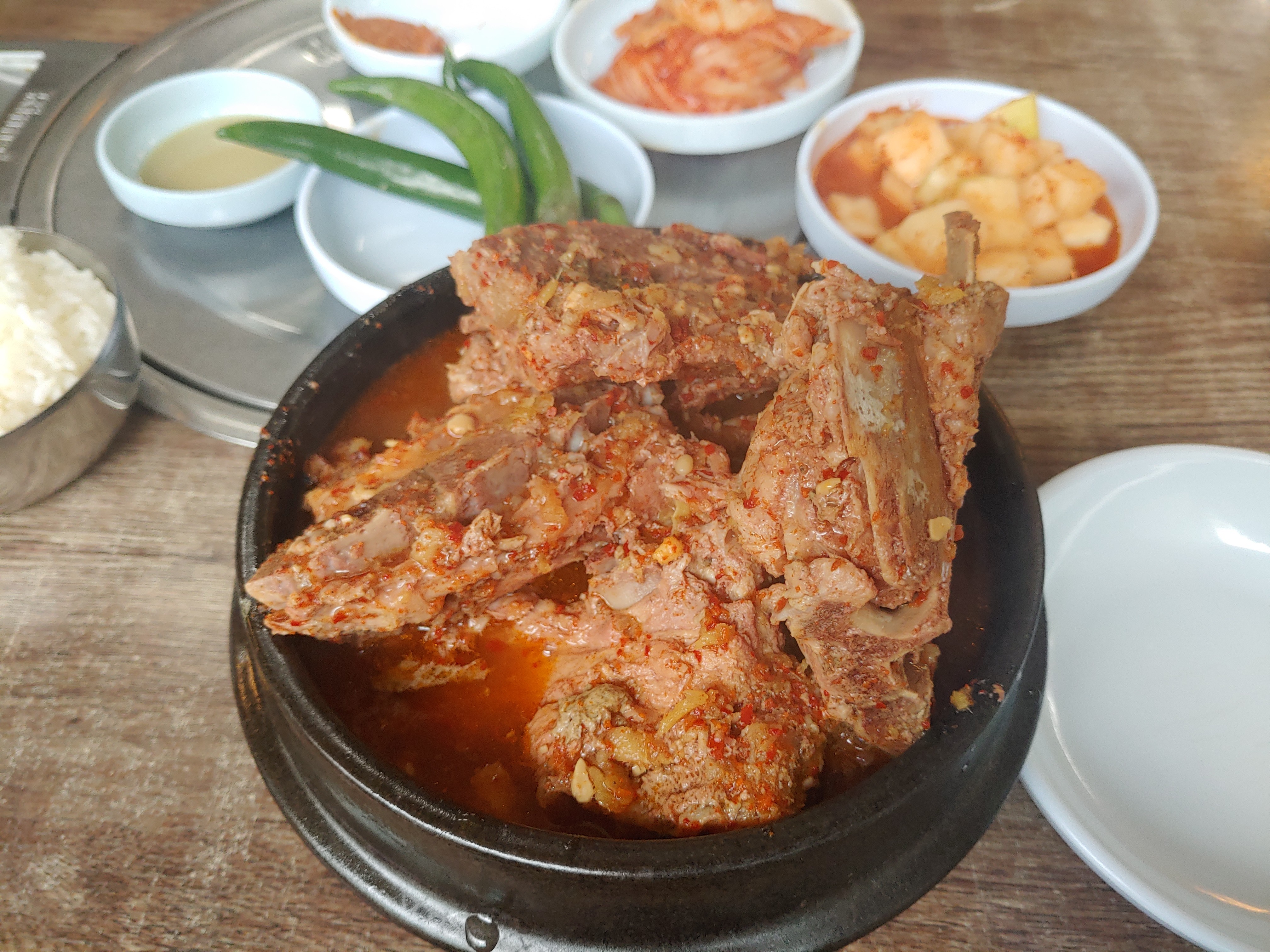 개인적으로는 사실 뼈해장국 집에서는 깍두기가 맛있는 곳이 정말 엄청 맛있는 곳이라고 생각을 하기도 하는데요. 그만큼 깍두기는 깔끔하고 달달한 맛이 감자탕 국물과 정말 잘 어울리는 깍두기에요. 그리고 고추도 쌈장에 찍어먹으면 같이 곁들이기 참 좋구요.