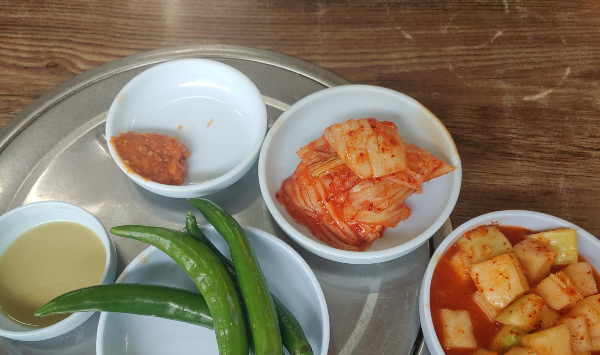 기본찬은 뼈해장국에는 빠질 수 없는 반찬인 깍두기, 그리고 배추김치, 고추, 쌈장, 양념장이렇게 나와요. 기본적인 찬들도 엄청 맛있어요.