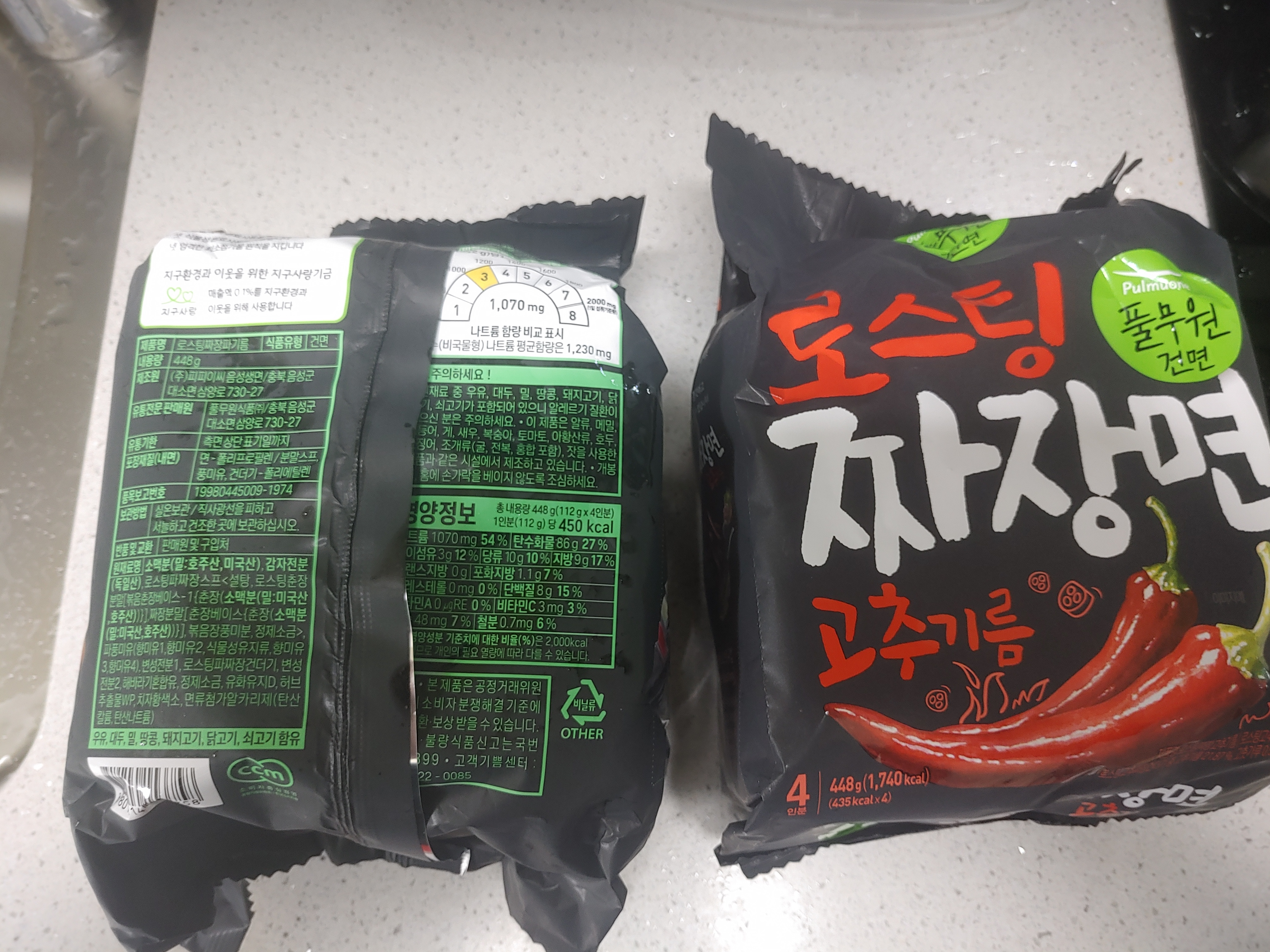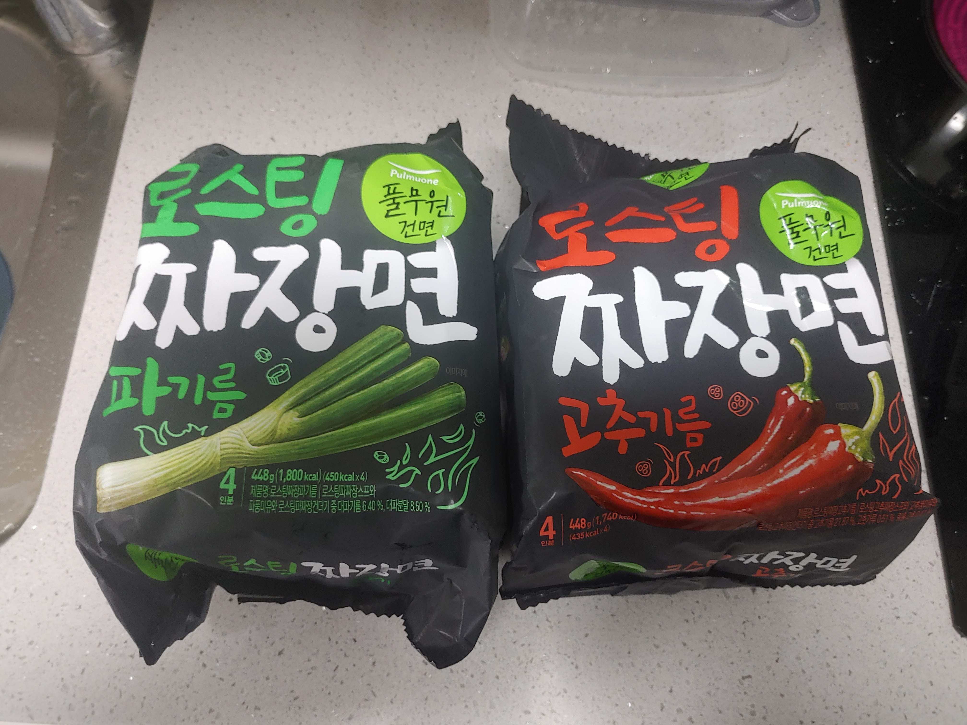풀무원에서 나오는 제품이 원래 약간 가격이 더 있는 편이기도 하죠. 버전은 두가지에요. 풀무원 건면 로스팅 짜장면의 파기름과 고추기름 버전이에요.