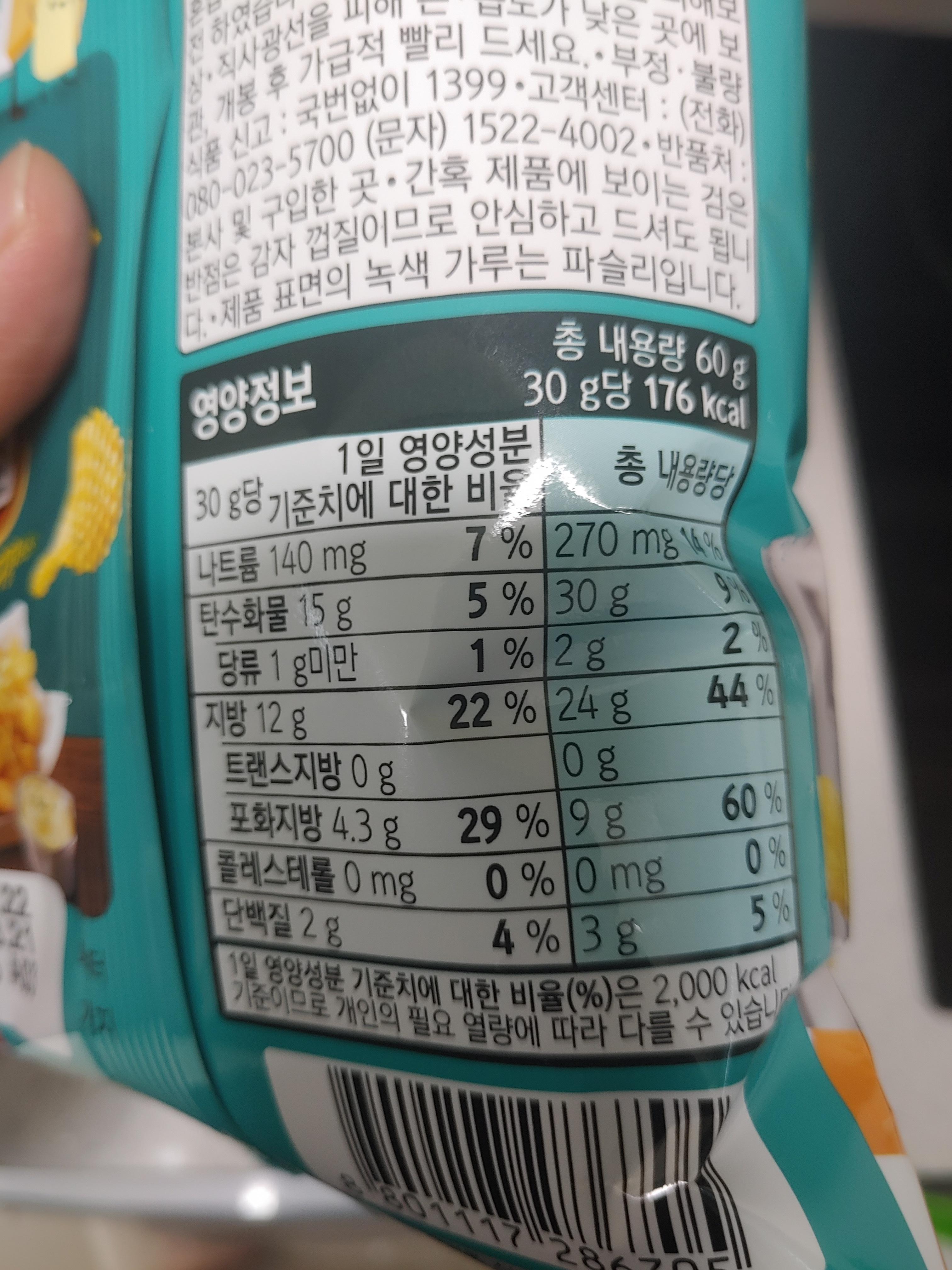 원재료에는 국내산 생감자가 들어가고, 갈릭디핑소스맛시즈닝이 들어가구요. 그외에도 몇몇 재료들이 들어가네요. 그리고 칼로리는 총 내용량 60g 에 칼로리는 352kcal 입니다!! 영양정보 상에는 30g당으로 되어 있는데 여튼 총 내용량이 60g이니까 총 칼로리는 352kcal 라고 할 수 있겠네요.