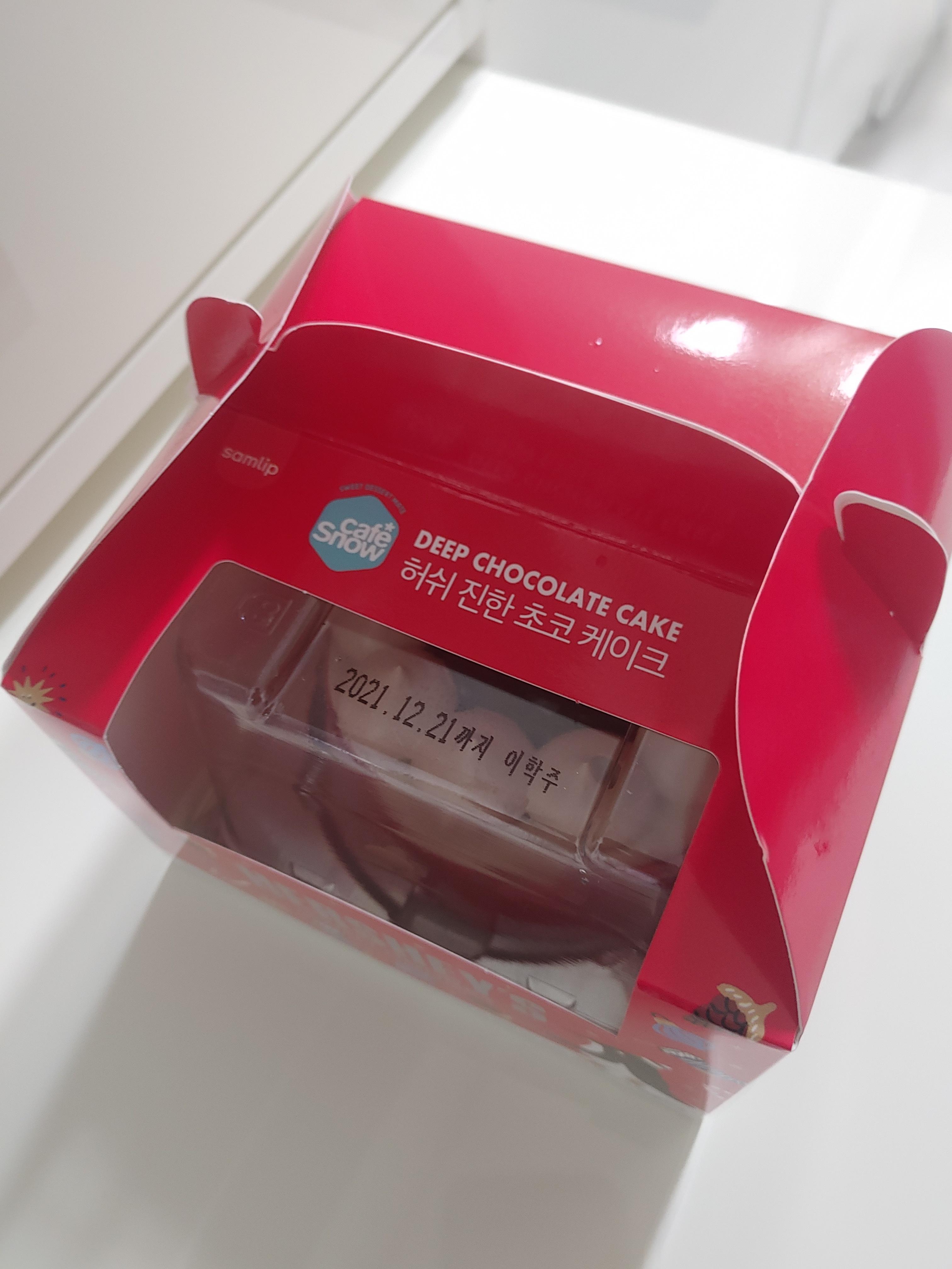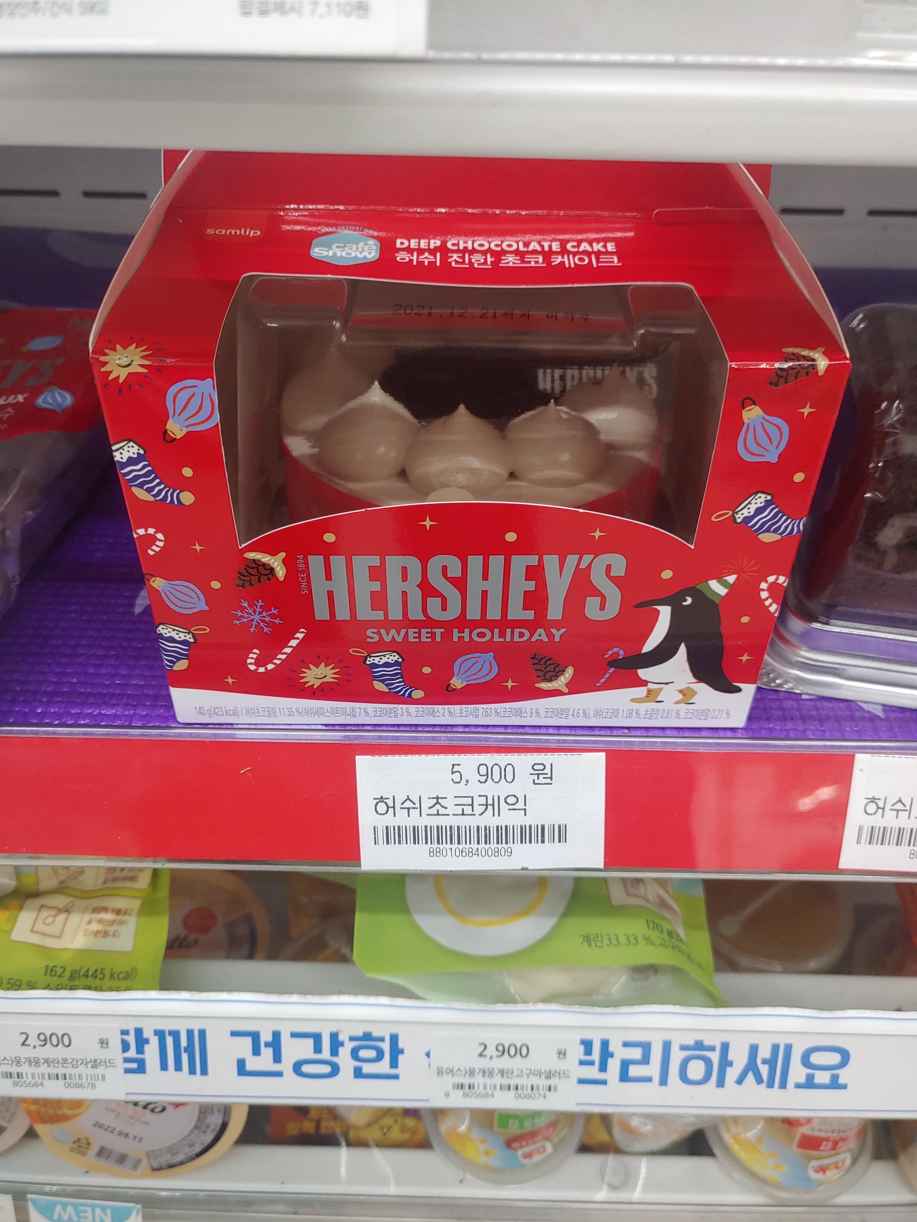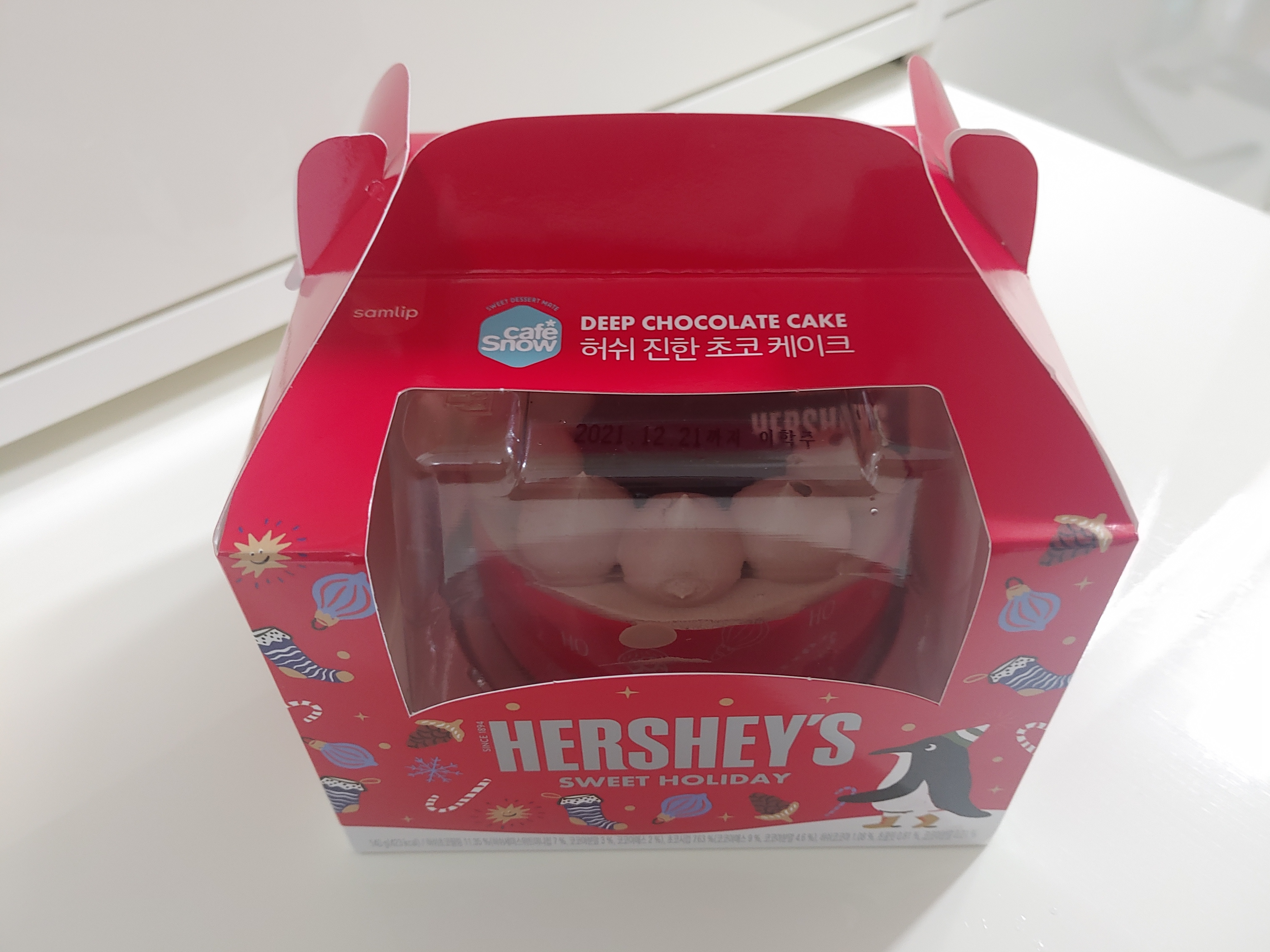 GS 편의점에 냉장고에 있는 1인용 케이크처럼 포장 된 것을 골라왔구요. 이름이 DEEP CHOCOLATE CAKE 허쉬 진한 초코 케이크였는데요. 허쉬 초콜릿의 달달함을 담고 있는 케이크라는 생각에 훅 손에 들고 왔습니다.