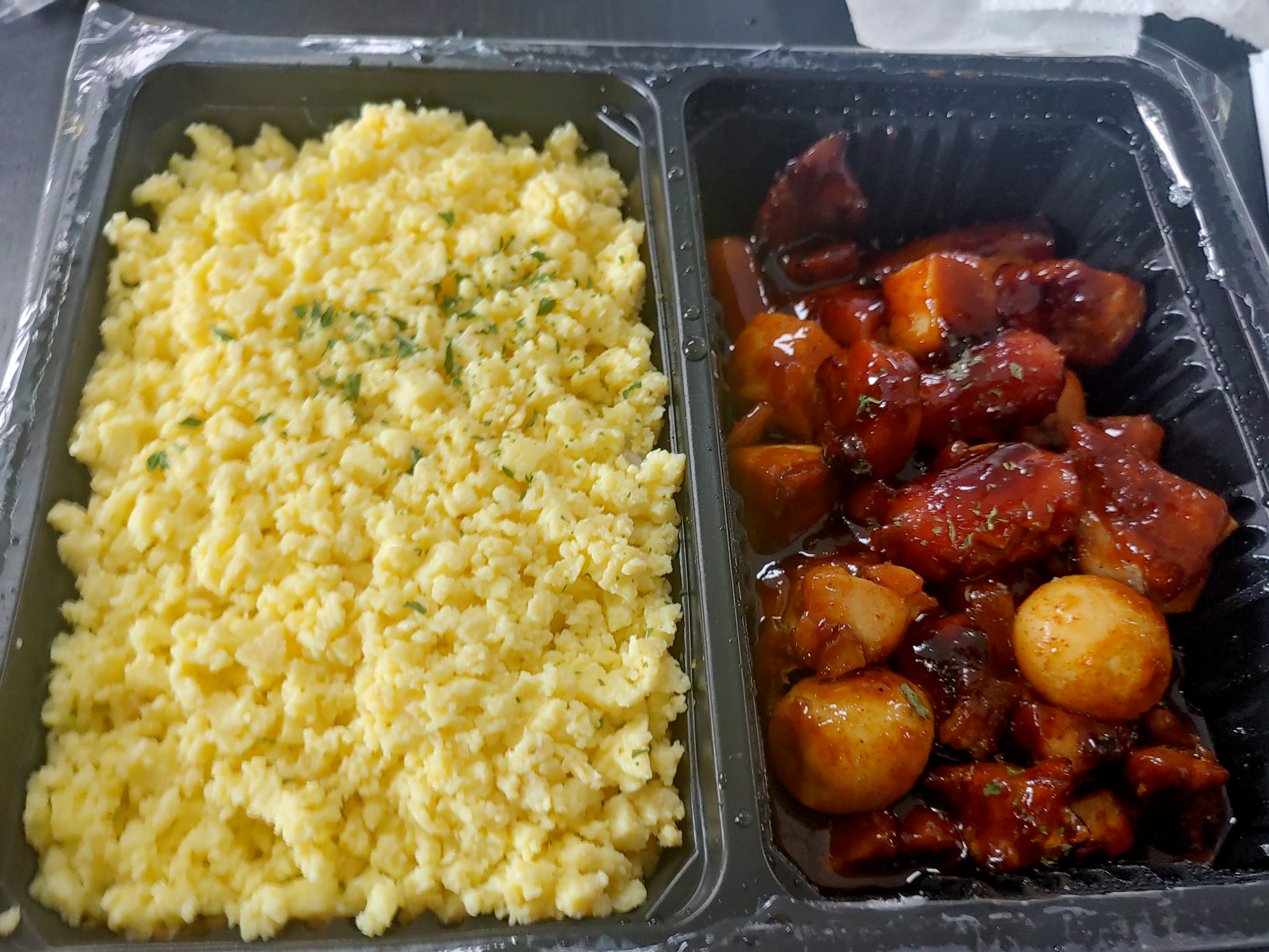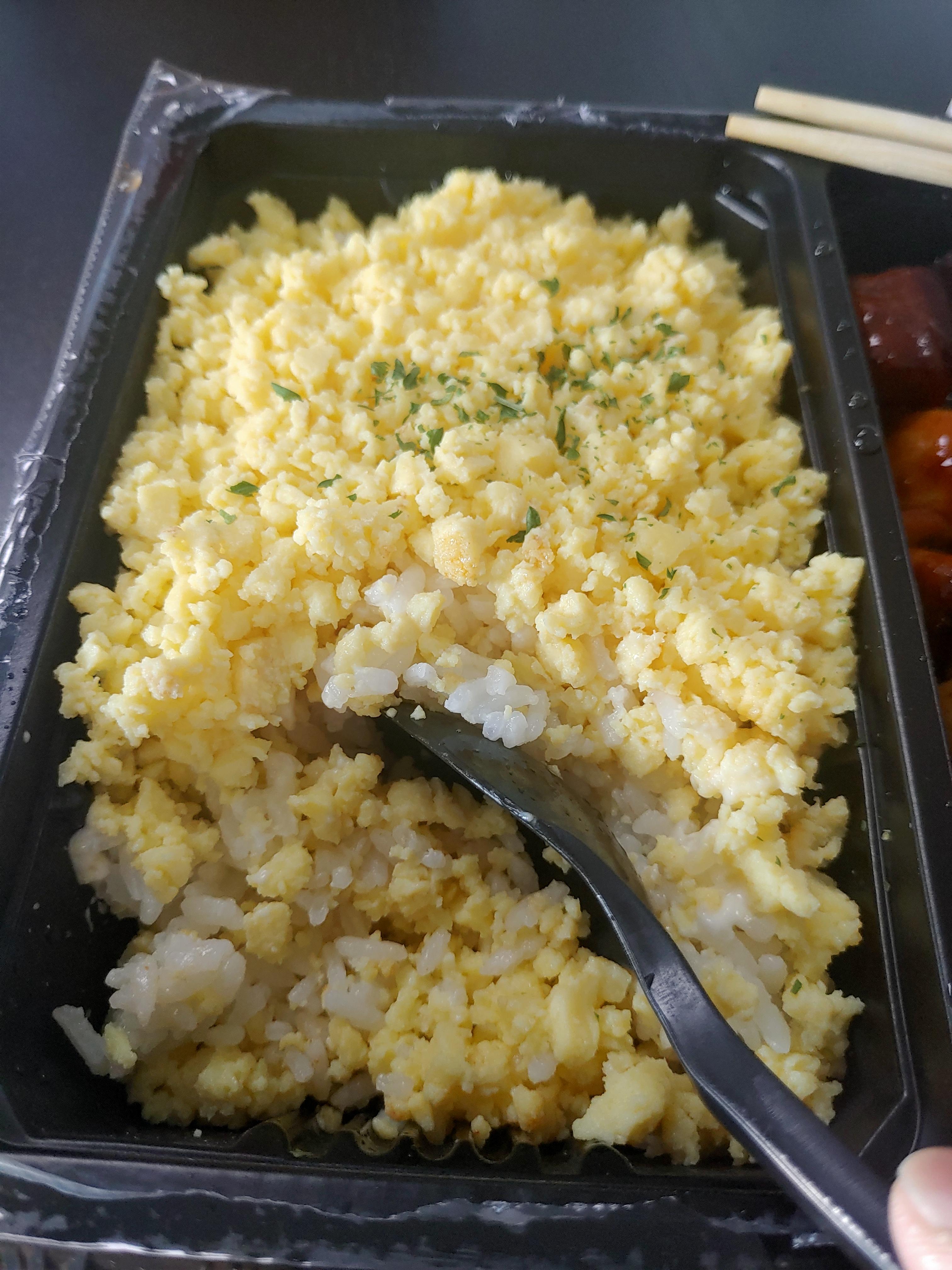 보니까 이렇게 치킨에 계란이 위에 올라간 밥이 딱 들어 있는데요. 밥의 양은 상당히 많았고, 치킨도 나름 먹기에 나쁘지 않고 한끼로는 든든하긴 했는데 따로 반찬이 단무지 약간만 들어 있던 점은 조금 아쉽기도 했어요. 그냥 도시락이라고 하기에는 그냥 치밥 도시락 느낌이었는데요. 밥에 같이 넣어 먹기에는 나쁘지는 않았어요.