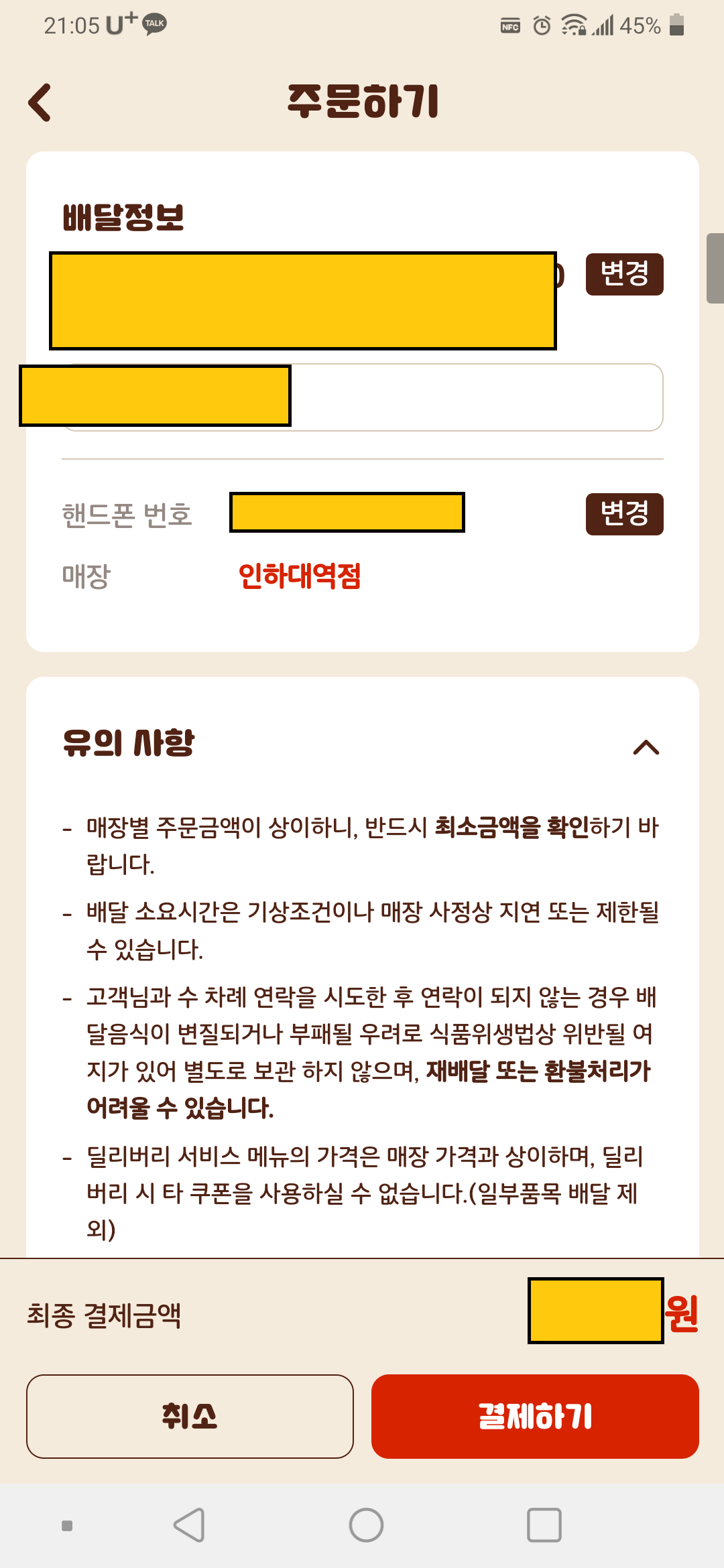주문이 완료되면 배달 예상시간과 배달 매장의 정보들을 한번 더 확인할 수 있구요. 아래 스샷들 처럼 배달 주문한 것들 정보와 주문취소도 가능하도록 하는 버튼까지 나와있는 것을 볼 수 있었습니다.