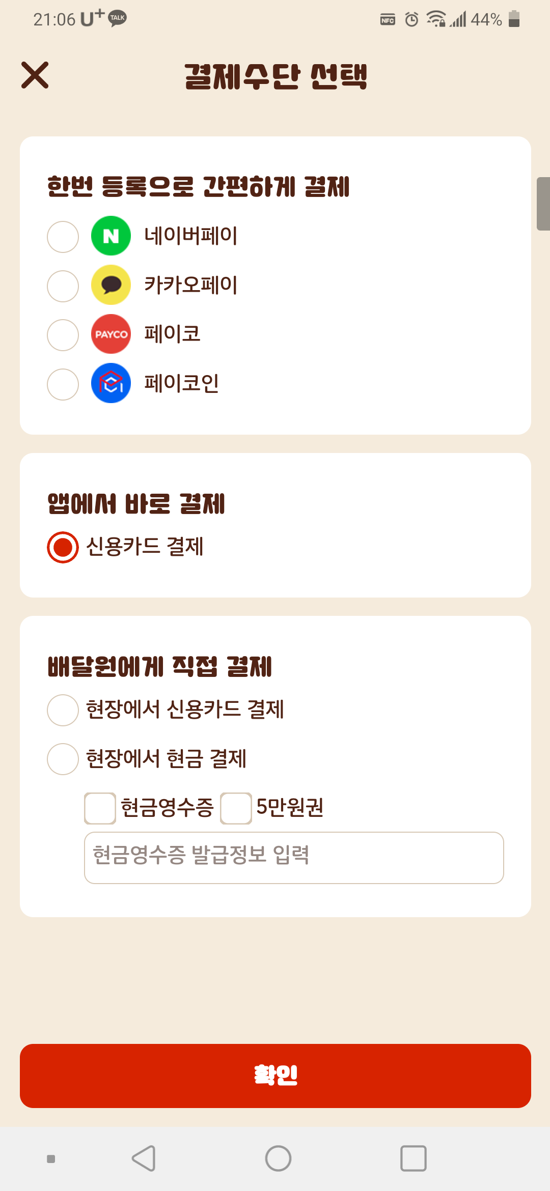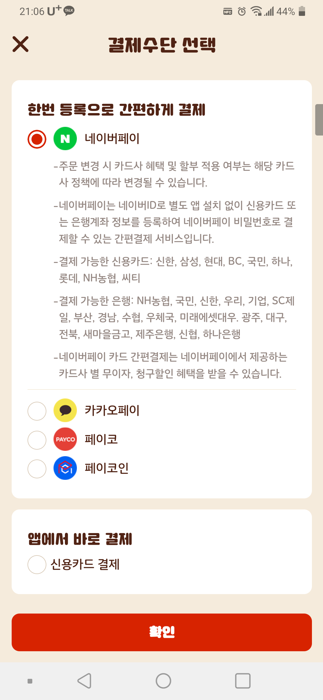 앱으로는 주문을 잘 안해봐서 몰랐는데 네이버페이, 카카오페이, 페이코, 페이코인(!!!) 으로 결제도 가능하더라구요. 직접결제 방식으로 해도 되고, 결제 방식에 따라서 본인이 자주 활용하는 것을 활용해서 쓸 수 있어요. 저는 네이버를 자주 활용하는 편이라 네이버페이로 진행을 해봤습니다.