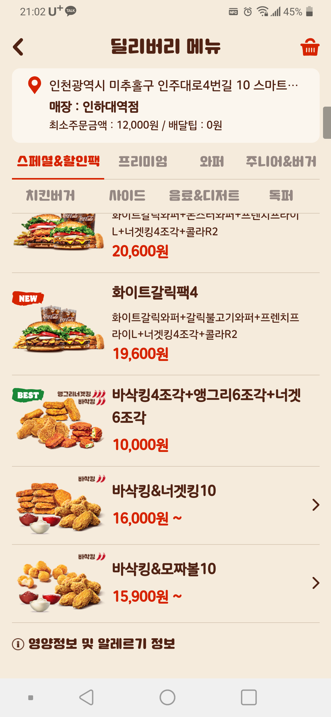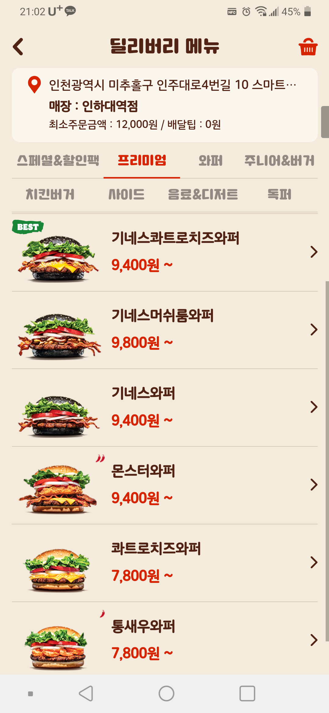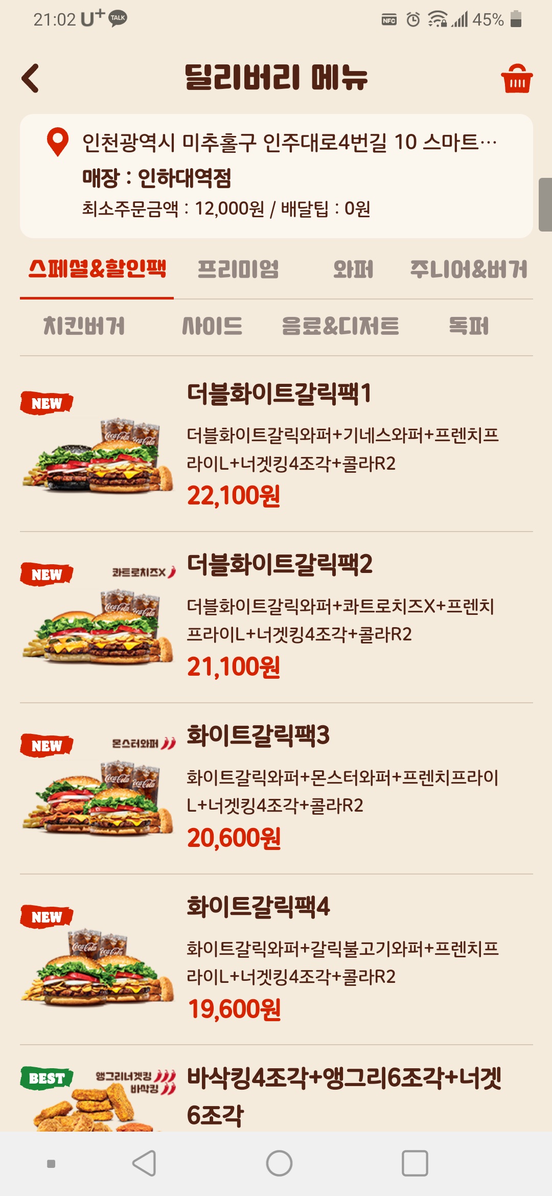: 스페셜&할인팩, 프리미엄, 와퍼, 주니어&버거, 치킨버거, 사이드, 음료&디저트, 독퍼
