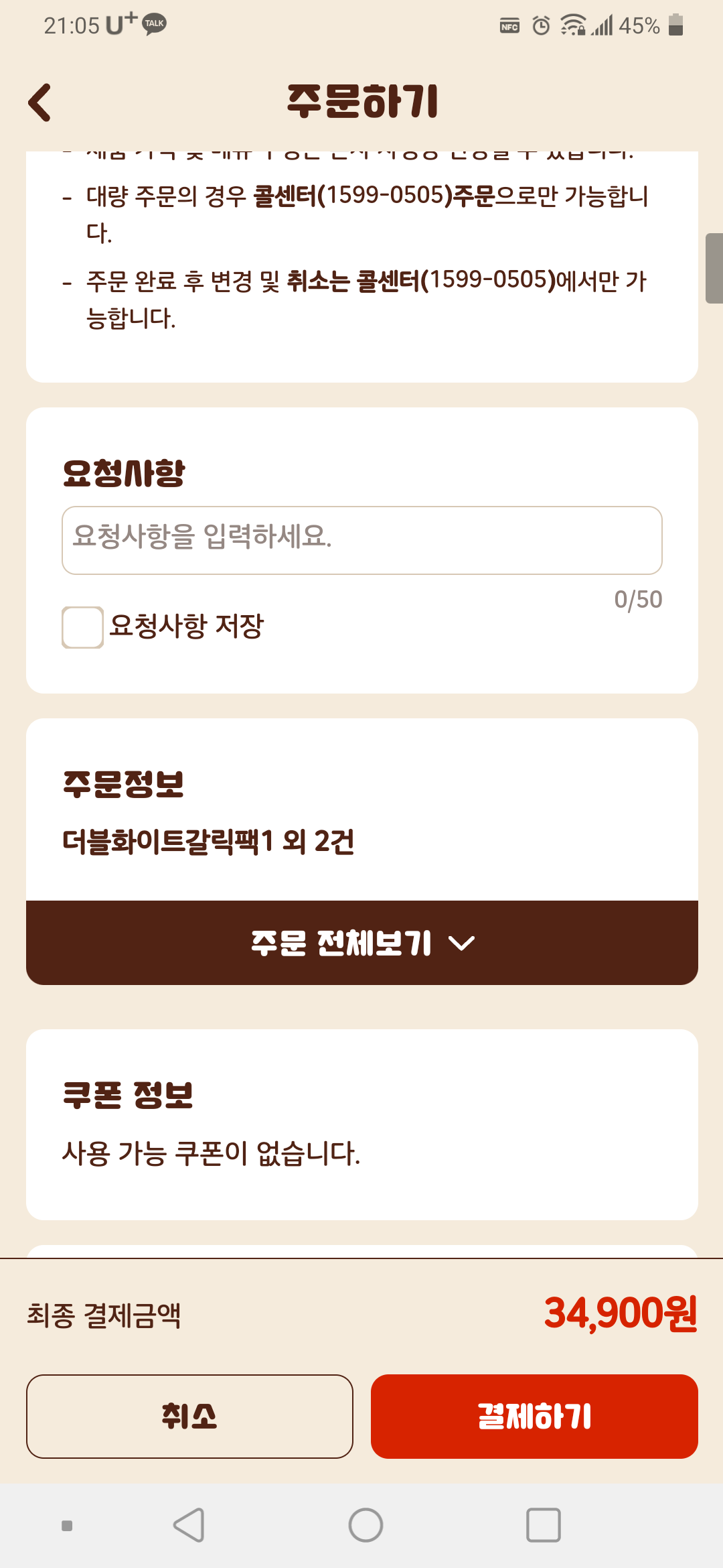 메뉴들을 다 고르고 주문을 하려고 하면, 배달정보가 보이고, 요청사항들도 적을 수 있도록 되어 있어요. 그리고 쿠폰 정보가 있어서 쿠폰들도 활용할 수 있어요. 위의 5천원 할인 쿠폰은 자동적용 되더라구요!!