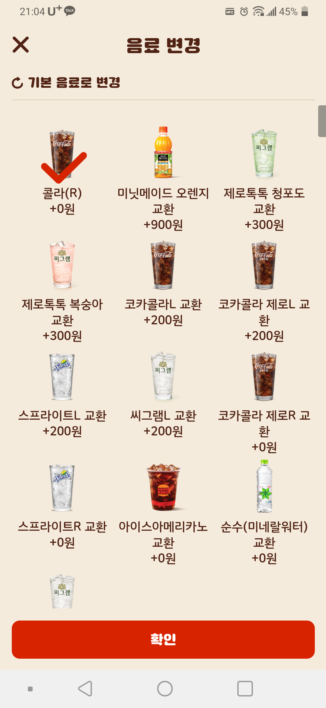메뉴들 쭉 고르고 ~ 옵션이나 변경할 부분들 추가하고 빼고 할 수 있어요. 콜라 뿐만 아니라 스프라이트나 콜라를 라지로 업그레이드 하는 것과 같은 것들이 옵션에 들어가 있는데요. 스페셜 팩은 올엑스트라로 업그레이드 하기에는 좀 찾기가 어렵더라구요 ㅠㅠ